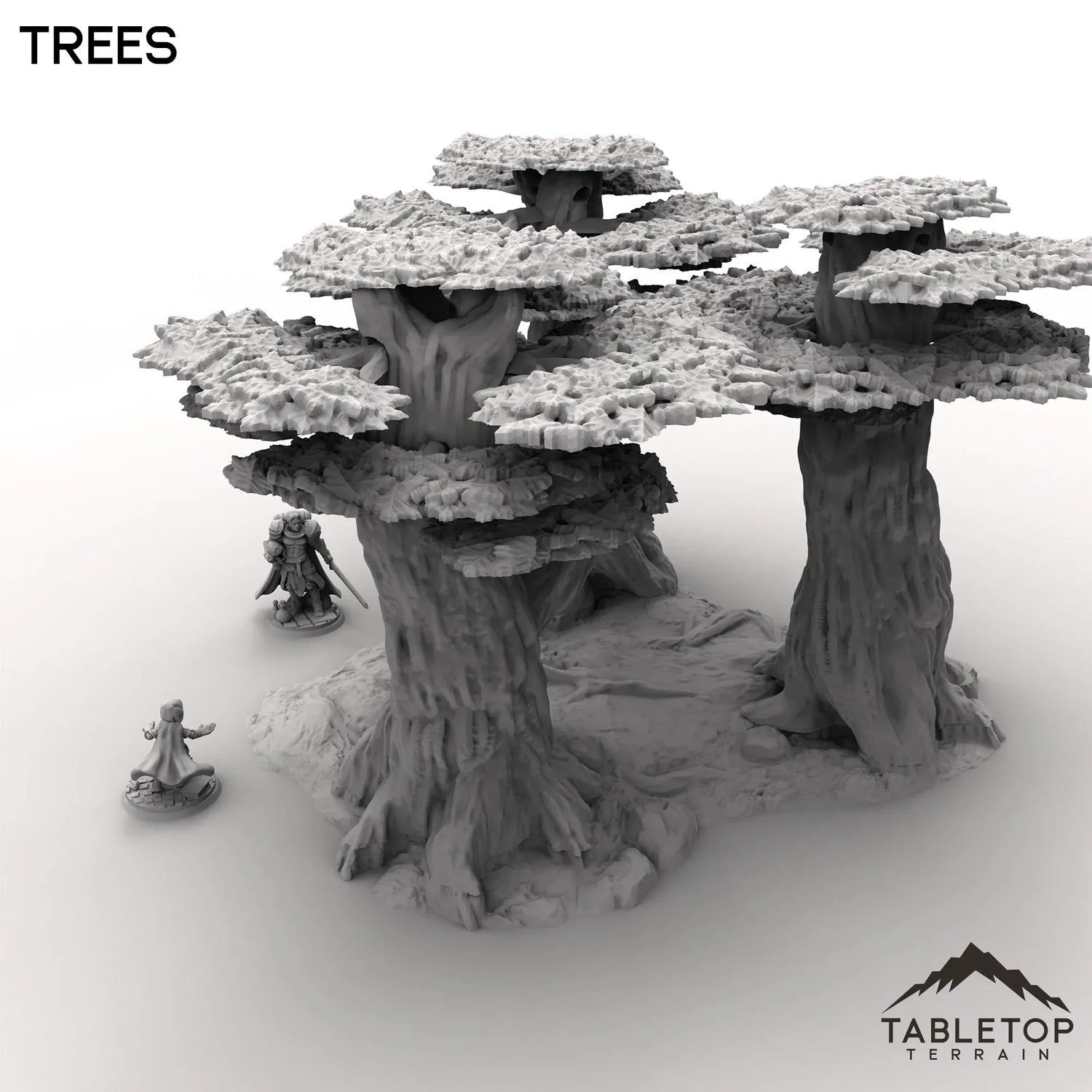 The Trees set is part of the Noldareth collection, and contains 3 different trees with a base for them to sit in. Each tree is stable on its own, and can be used without the included base. The branches are slotted into the trunk in whatever way you desire, with a variety of different options.