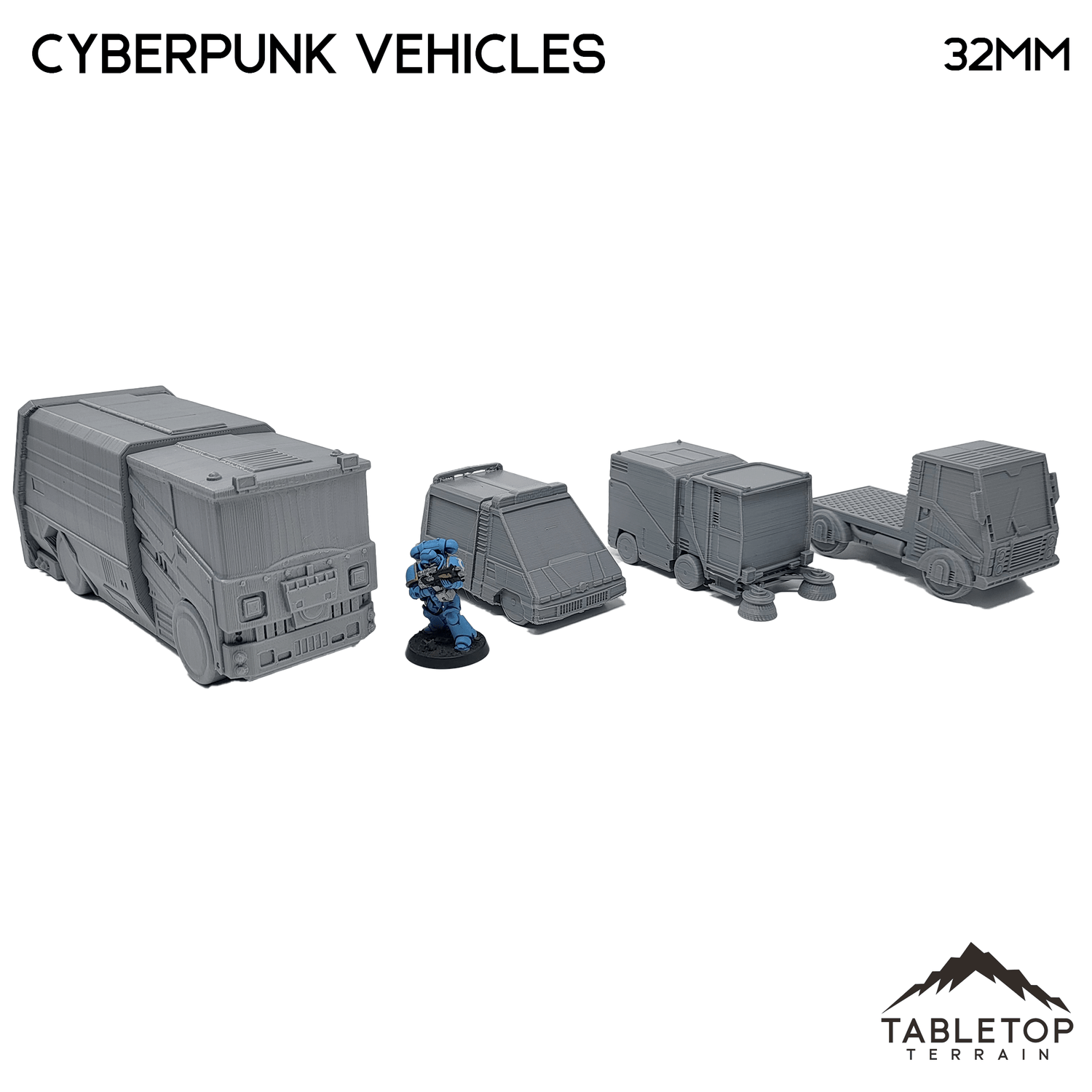 The Cyberpunk Vehicle Collection is a collection of different futuristic urban vehicles. They make a great addition to a futuristic tabletop for games such as Stargrave or Cyberpunk Red (28-30mm scaled games).