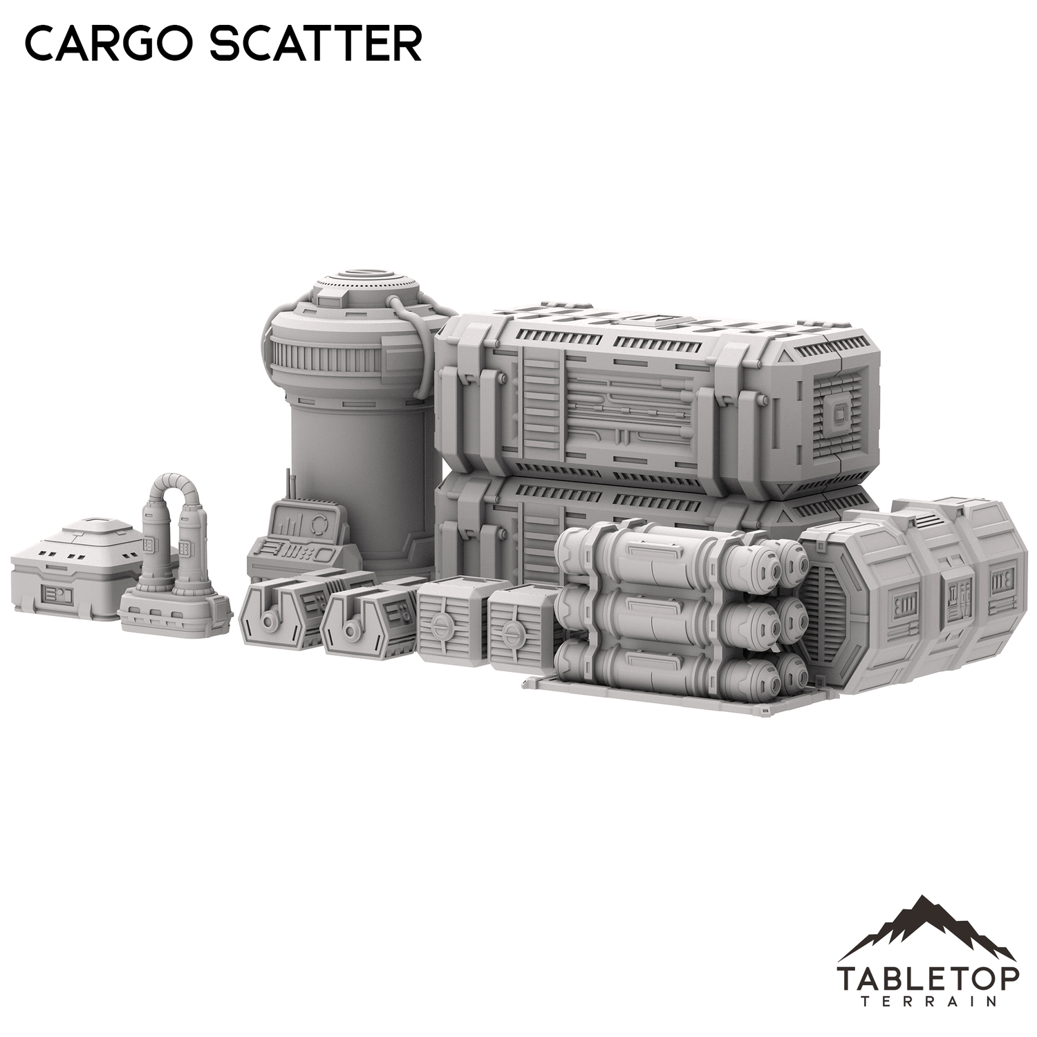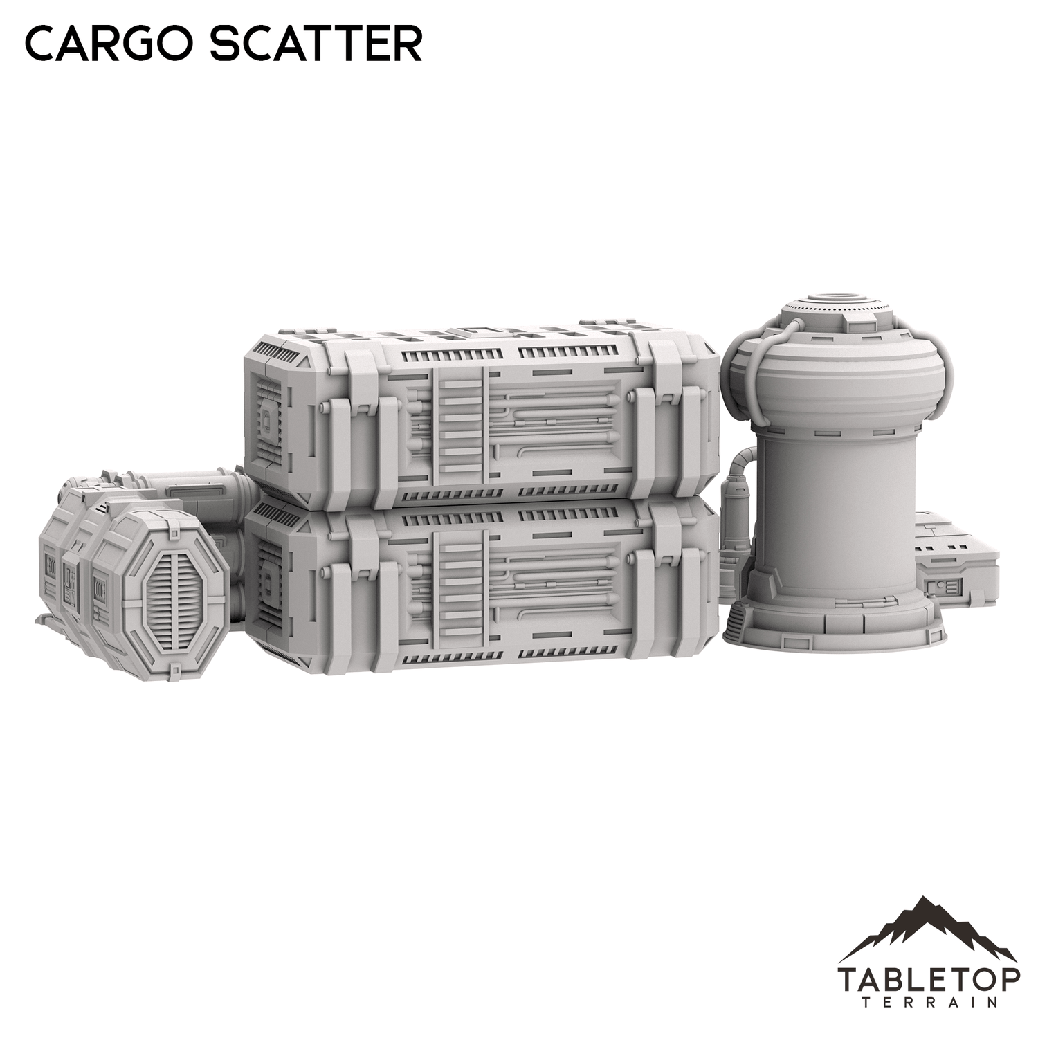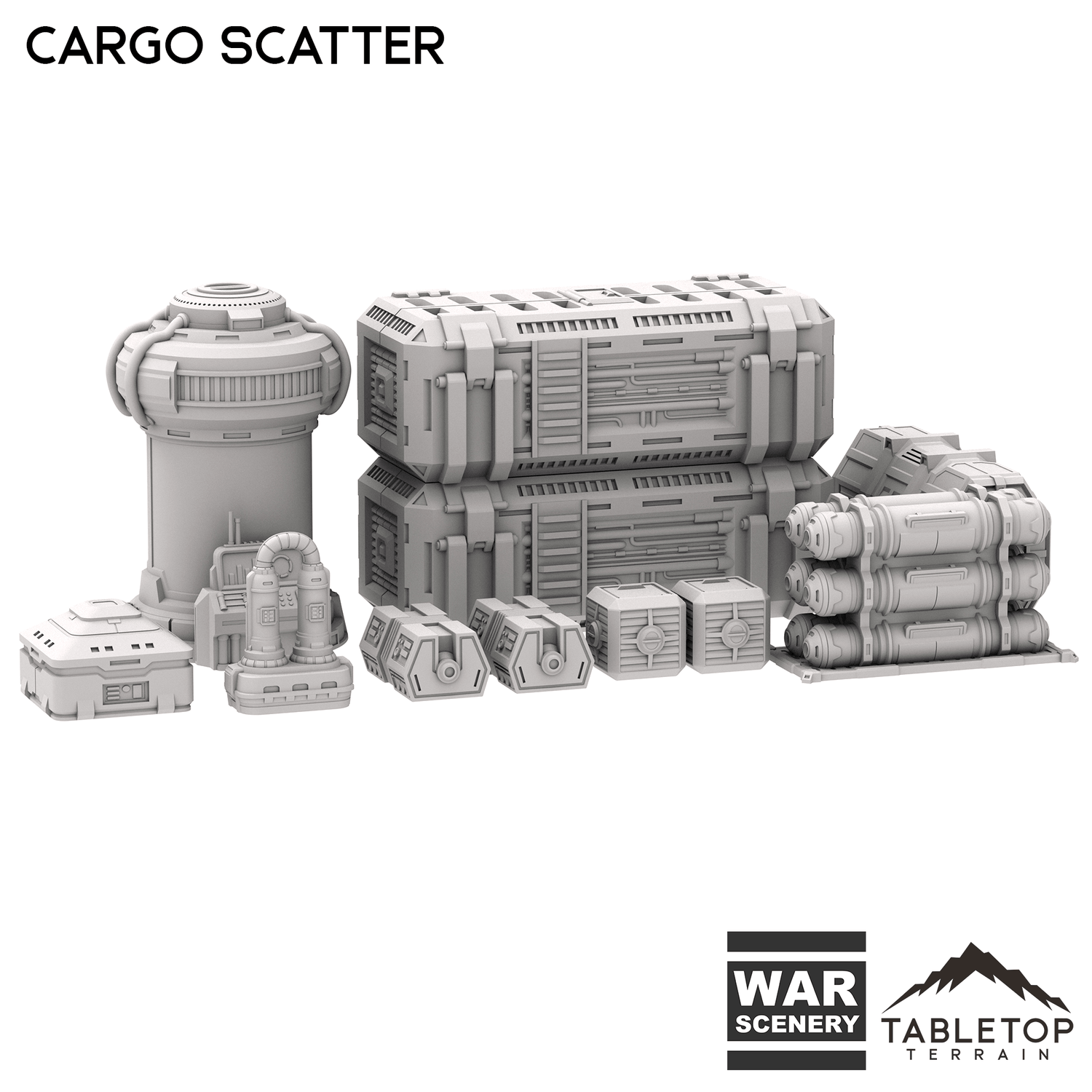 The City Cargo Scatter is a collection meant to flesh out a larger sci-fi city tabletop. The set includes 11 items: two large crates, large oval crate, gas canisters, 4 small crates, special delivery crate, pyramid crate, and healing tank. The City Cargo Scatter is made for sci-fi tabletop games, but could work with any genre.