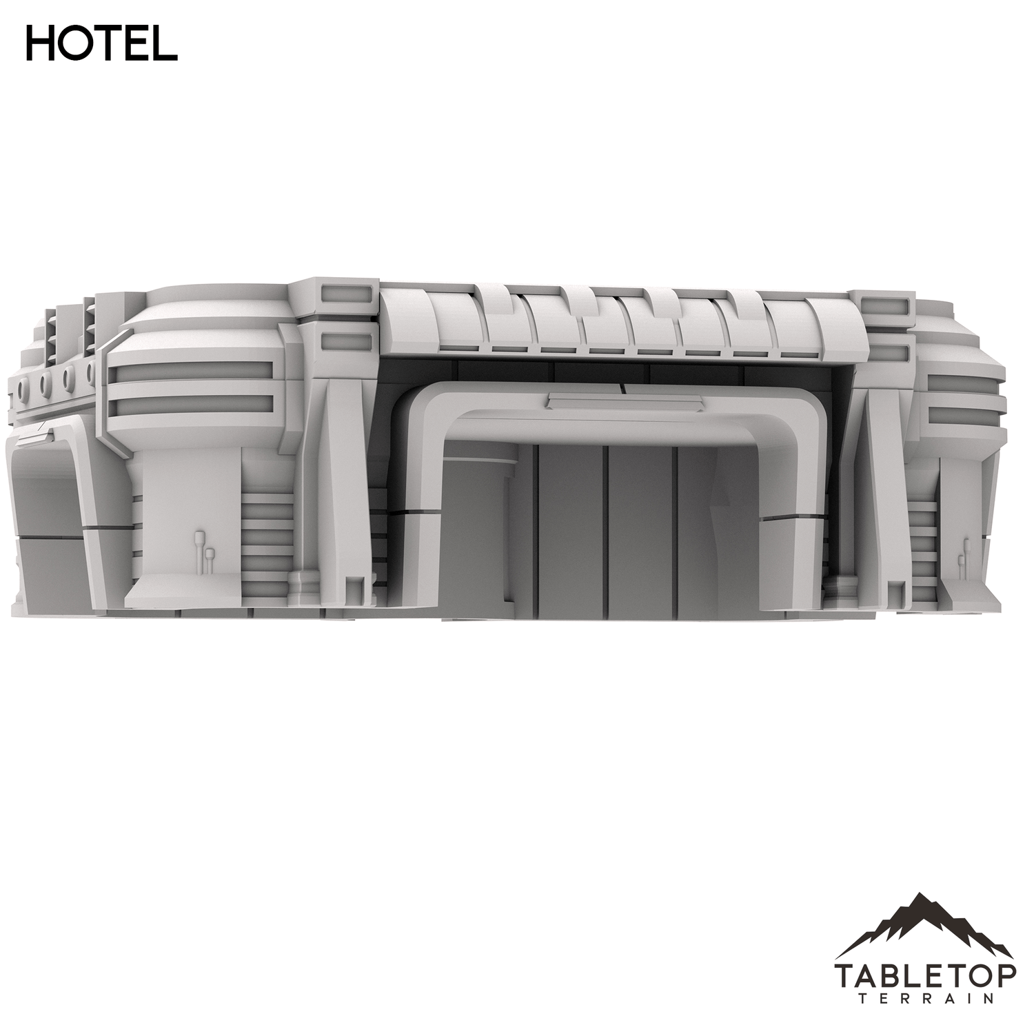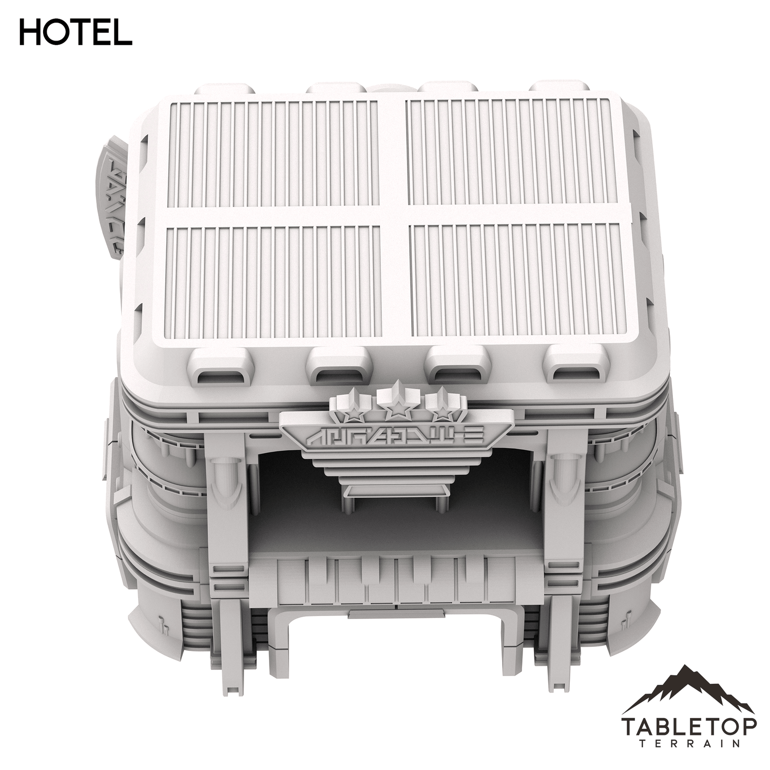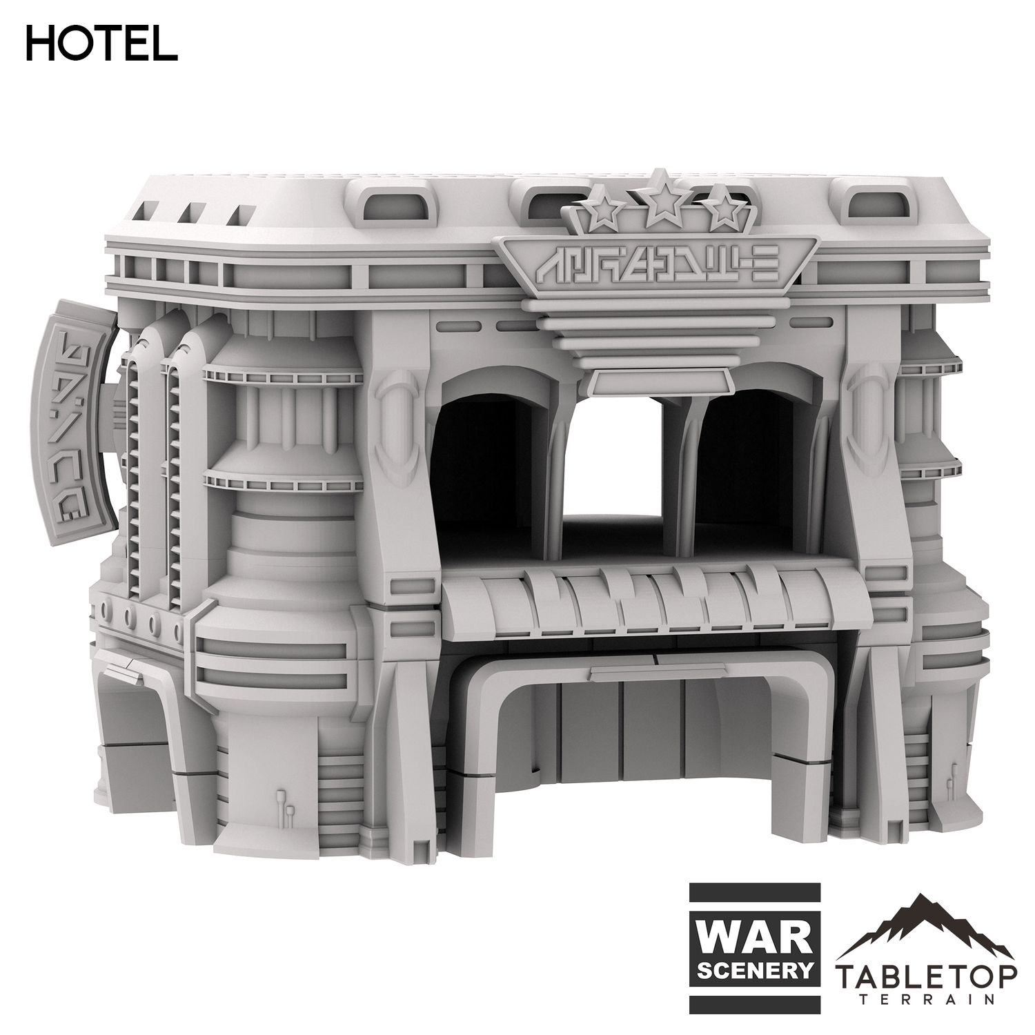 The Hotel is a standalone building for the inner city of a sci-fi tabletop. The building features a 2nd story with large open portals leading into the hotel room itself. The Hotel is made for sci-fi tabletop games, but could work with any genre.