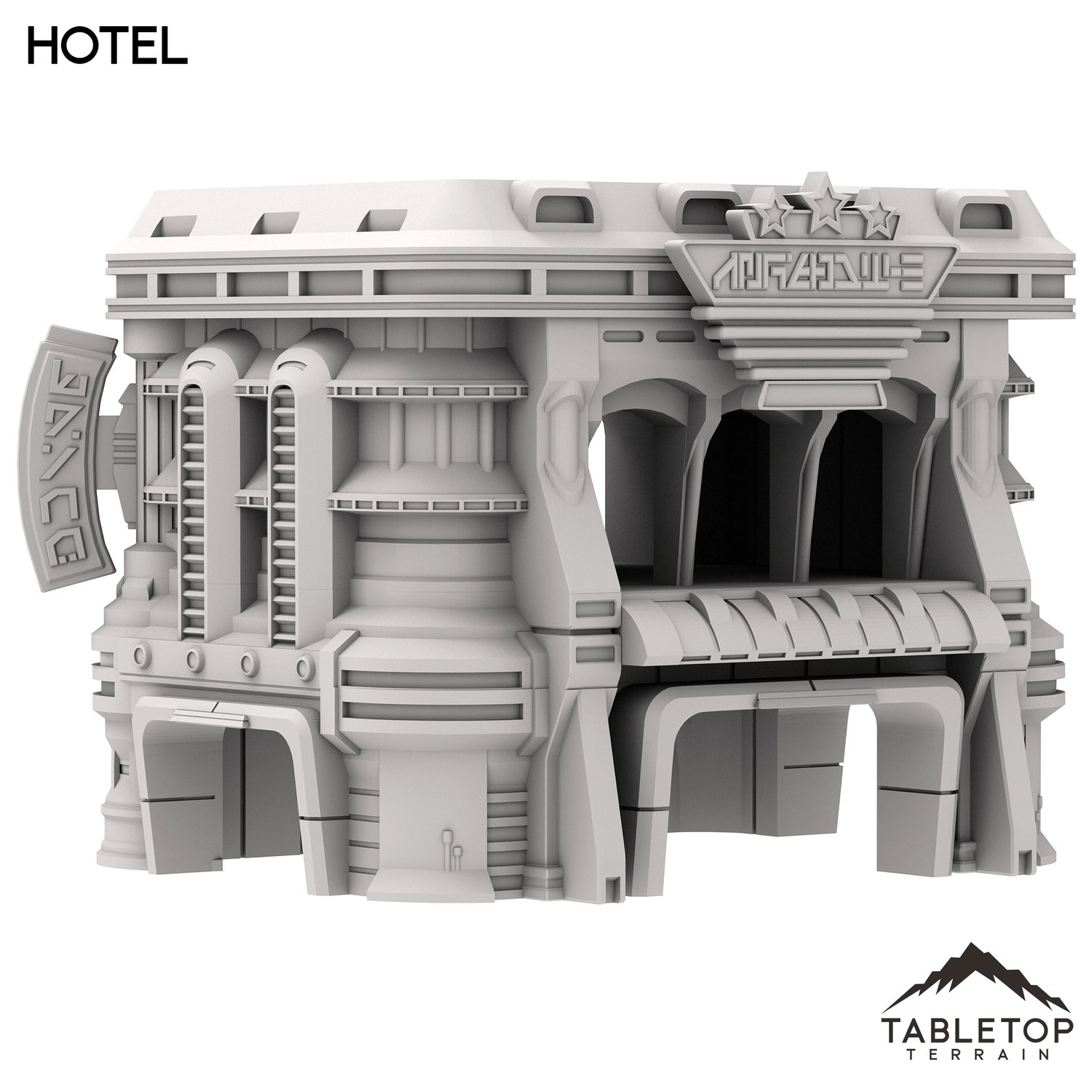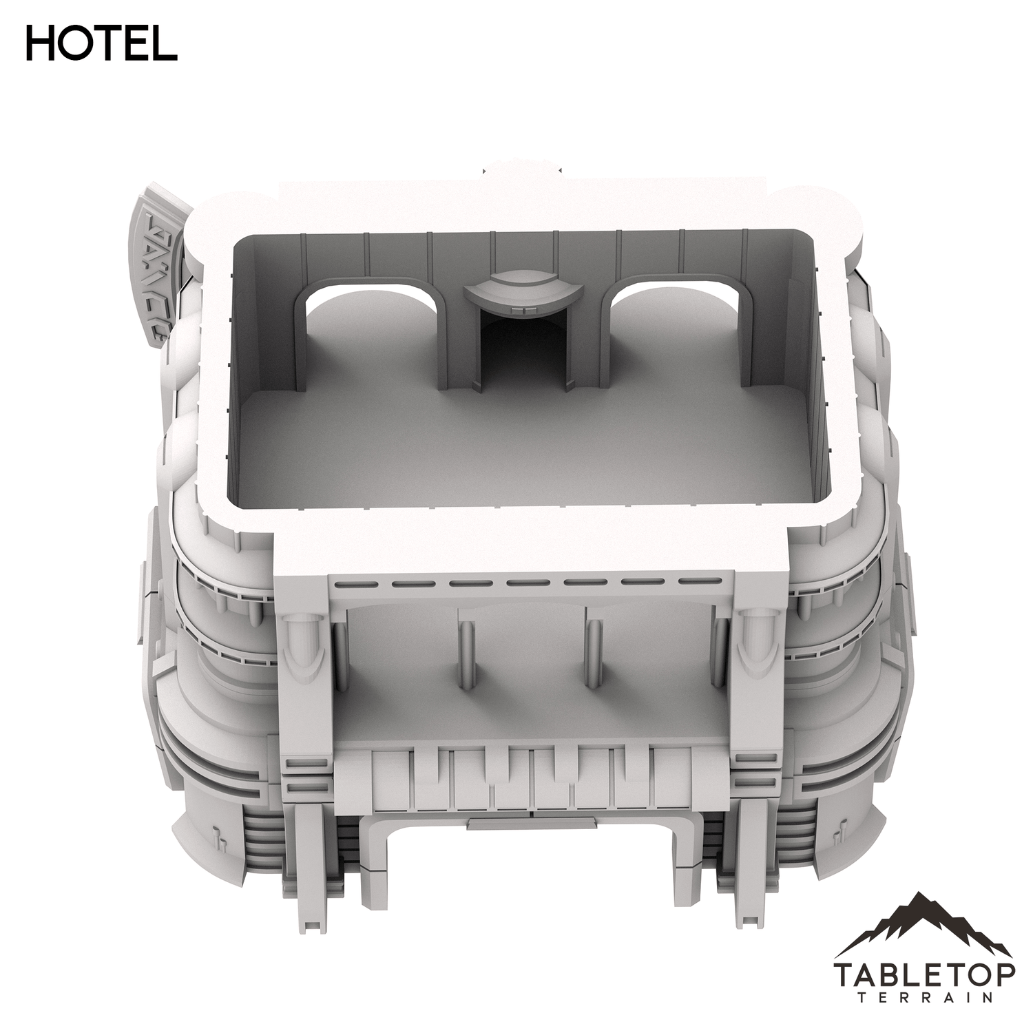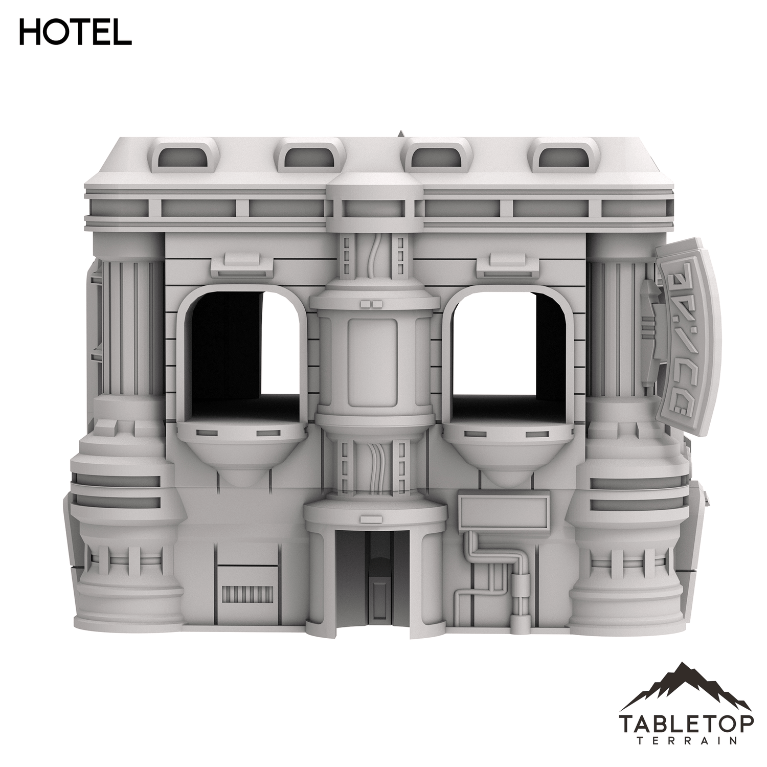 The Hotel is a standalone building for the inner city of a sci-fi tabletop. The building features a 2nd story with large open portals leading into the hotel room itself. The Hotel is made for sci-fi tabletop games, but could work with any genre.