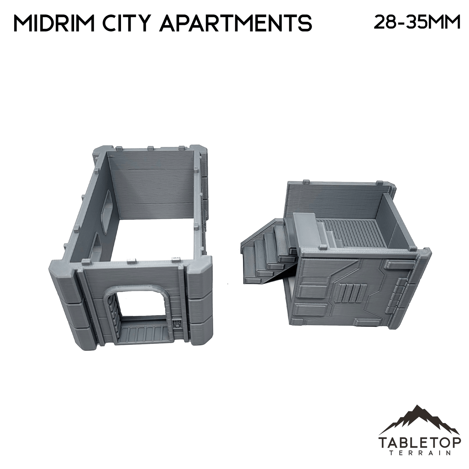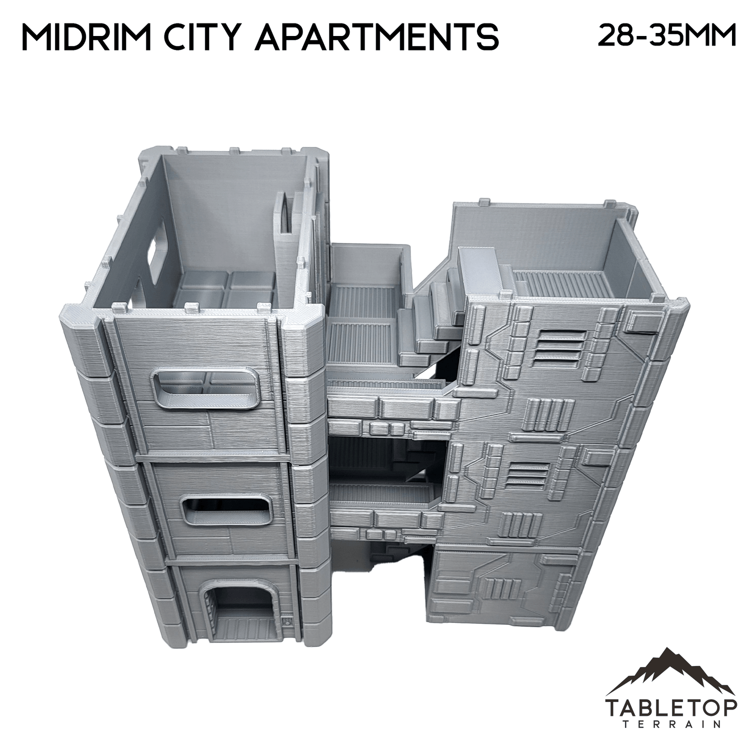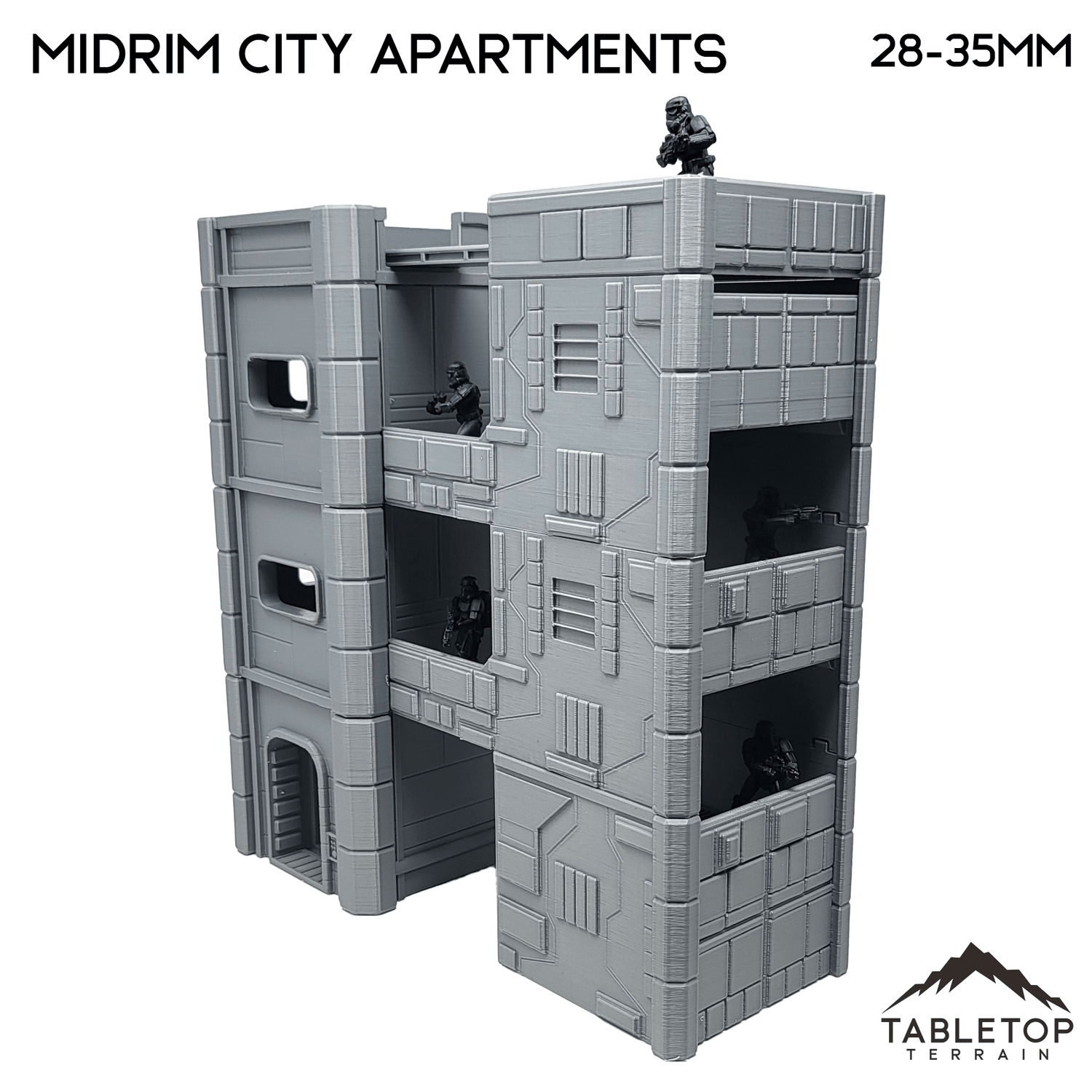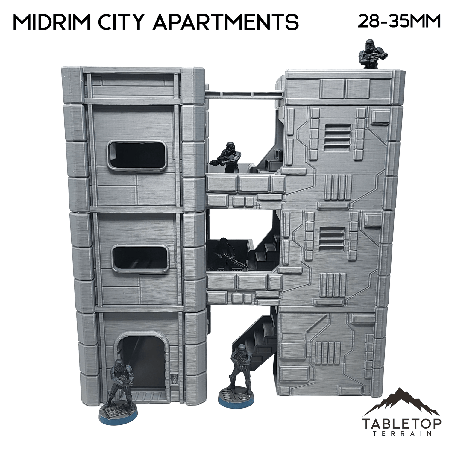 The Midrim City Apartments would work great for Star Wars Legion or other Sci-Fi games. It would work great for Star Wars Legion, Shatterpoint, or other Sci-Fi games. The building is printed in 40mm, 28-35mm (1:47), 20mm, and 15mm scale with other scales available by request. The 40mm scale is recommend for Shatterpoint and the 28-35mm scale for Legion.