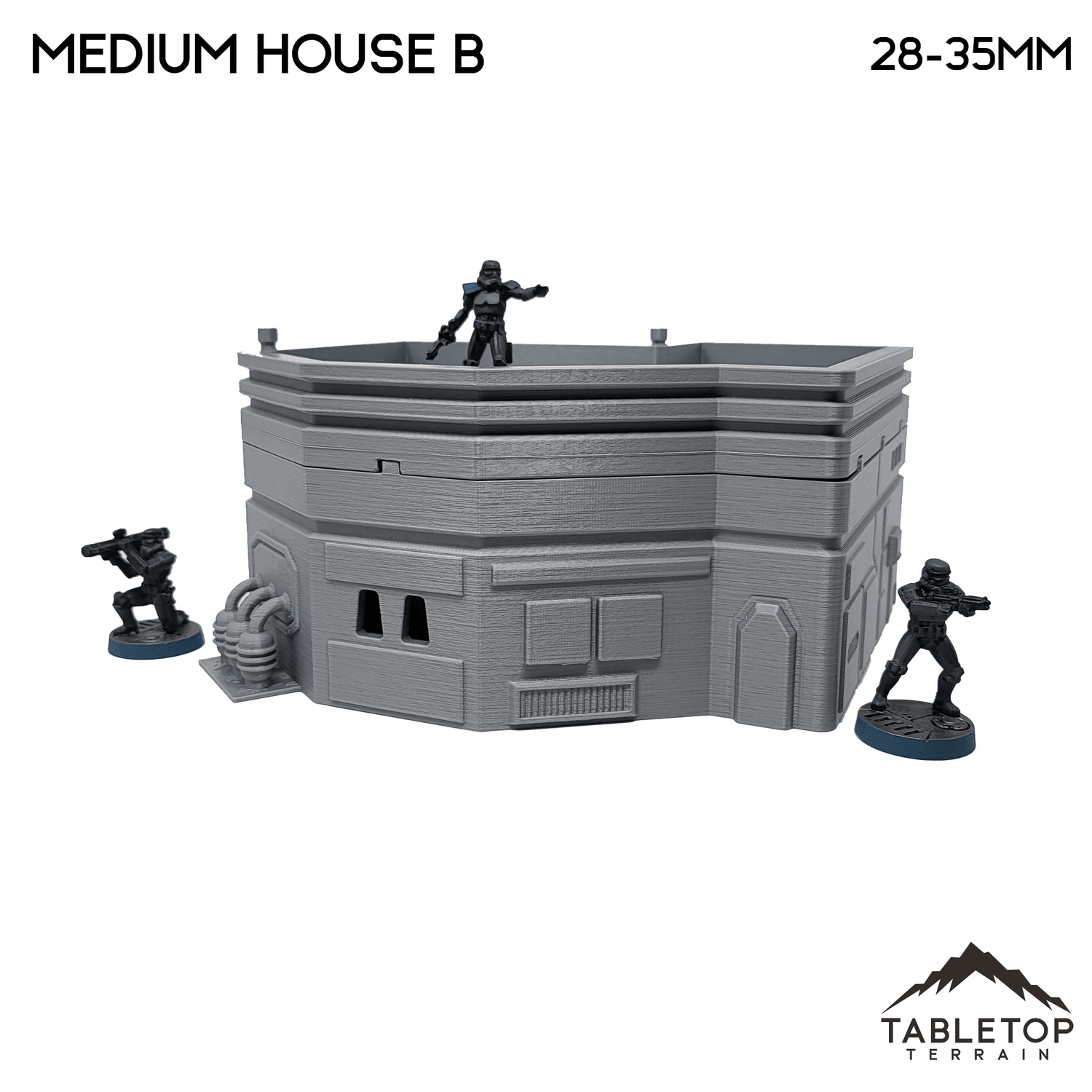 The Midrim City Medium House B is a fantastic addition for your Sci-Fi themed tabletop. It would work great for Star Wars Legion, Shatterpoint, or other Sci-Fi games. The Guild is printed in 40mm, 28-35mm (1:47), 20mm, and 15mm scale with other scales available by request. The 40mm scale is recommend for Shatterpoint and the 28-35mm scale for Legion.