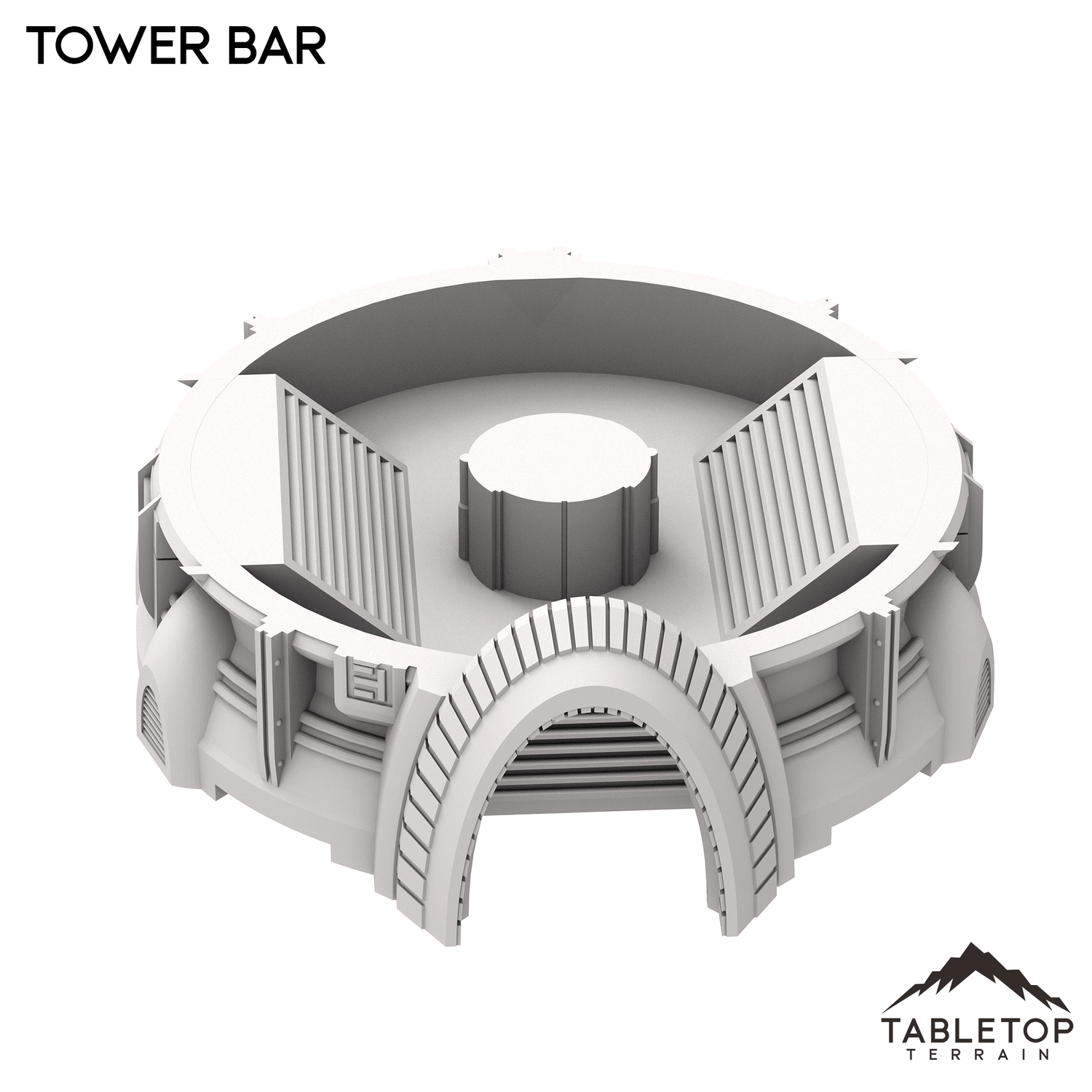 The Tower Bar is a large multi-story building, with a useable interior bottom floor and a top floor with circular balconies. The building is made to be large enough to fit a good number of minis at any given time, and the open-style design allows for easy access and usability in play. The Tower Bar is made for sci-fi tabletop games, but could work with any genre.