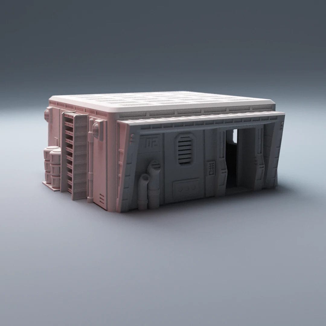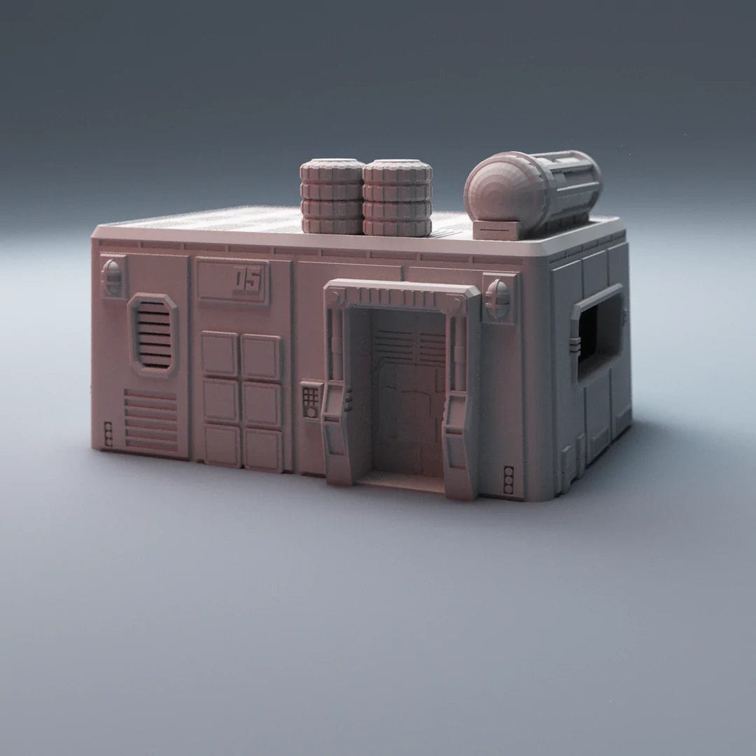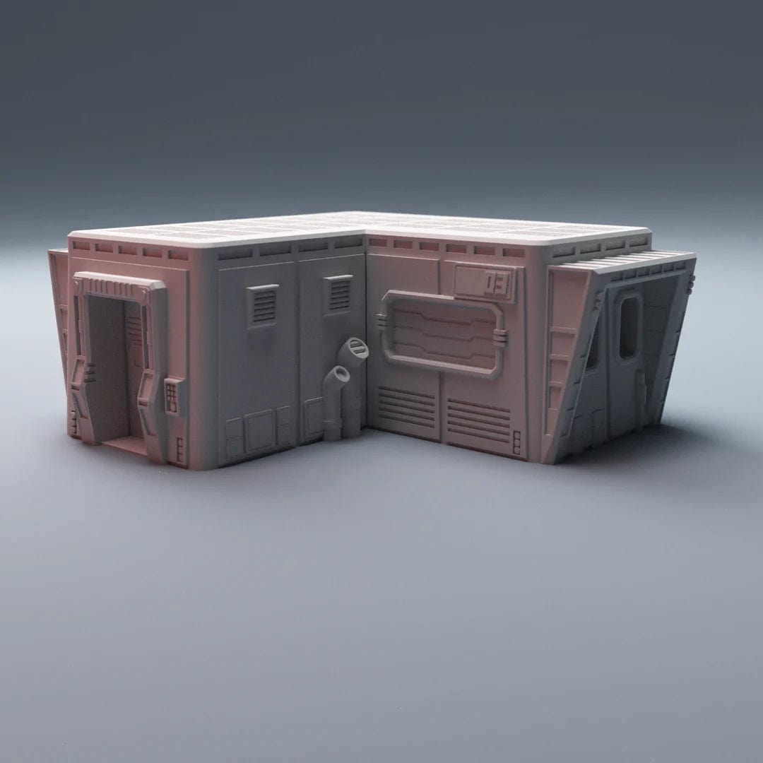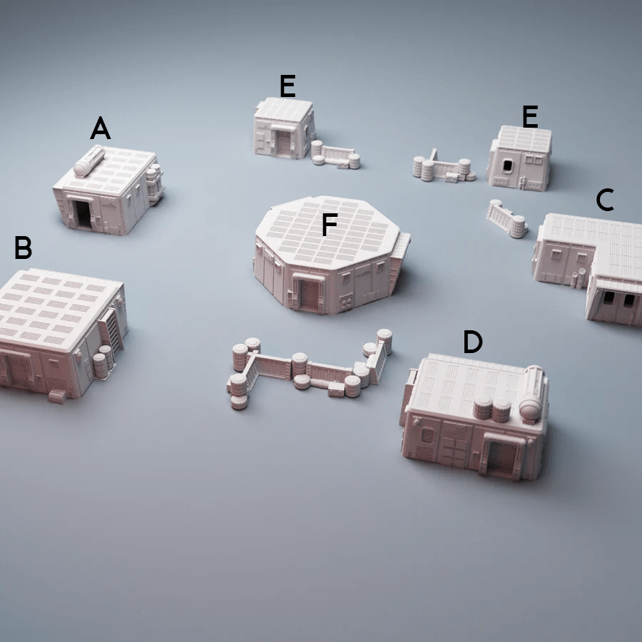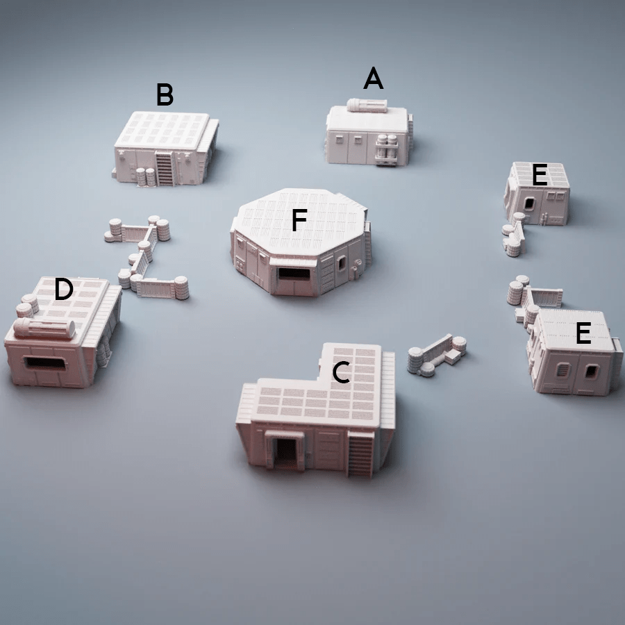 The Uladh Starport Set is an ideal Sci-Fi settlement or outpost for a "Botched Deal" type scenario. Different shapes and sizes give a great variety to your layout. Each structure has a removable door and roof allowing access to the interior, as well as an external ladder for rooftop access.