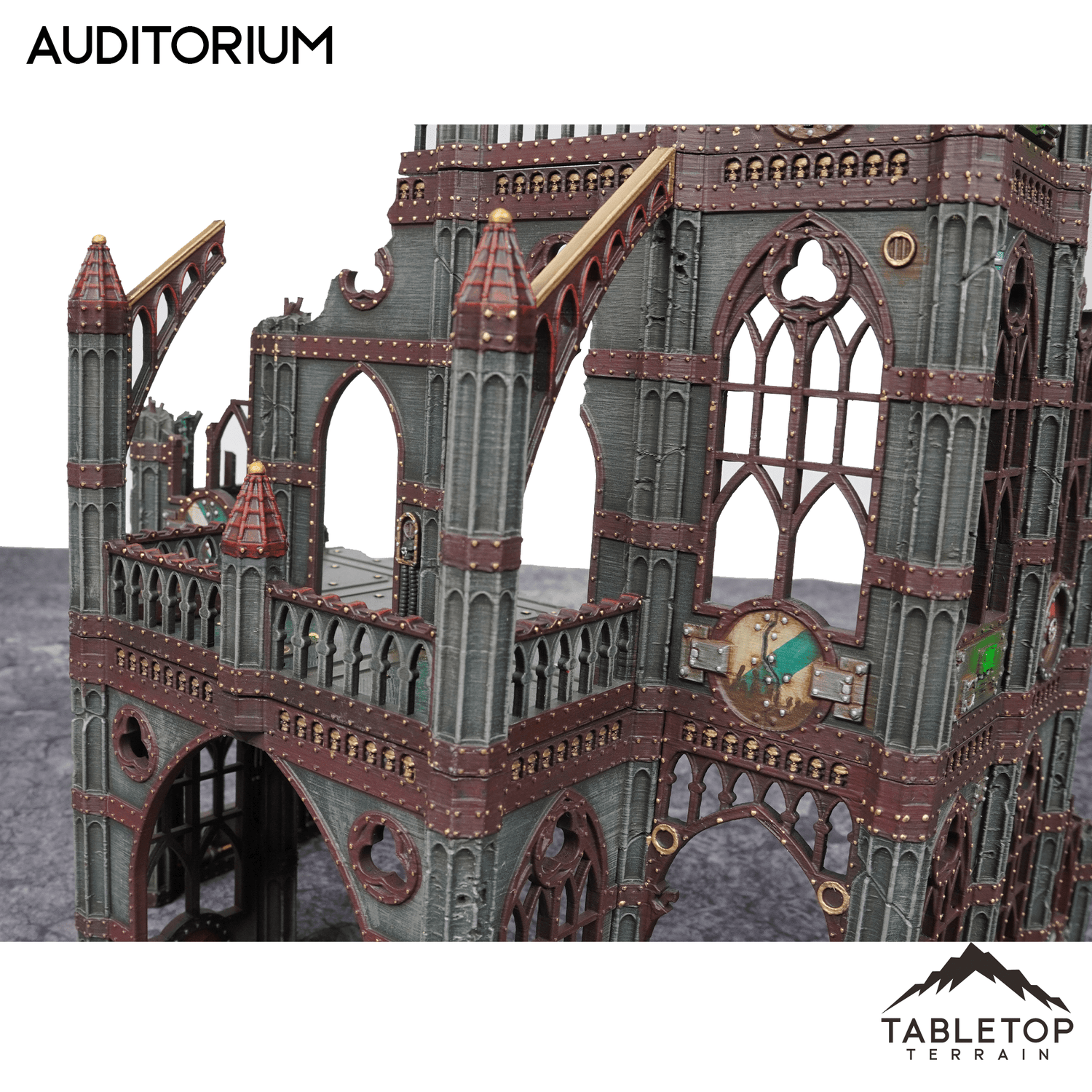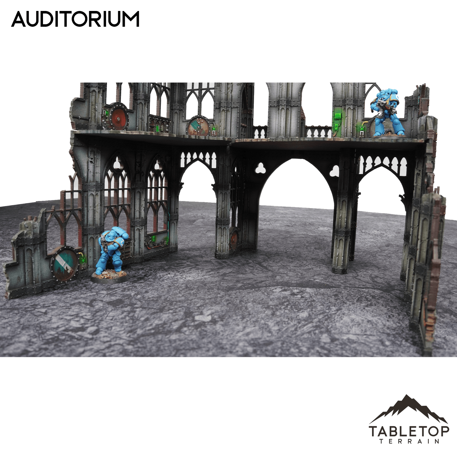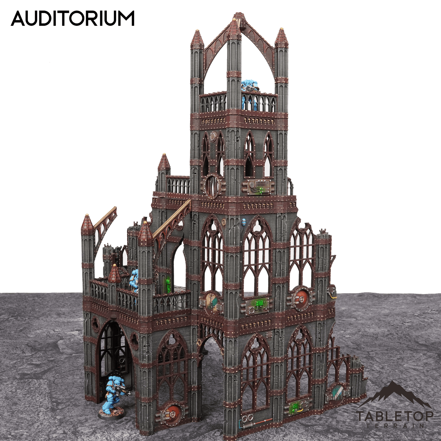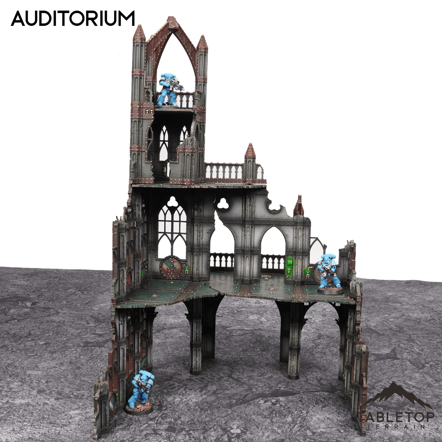 Once a place of music and fellowship, endless war has left only a hollow shell of an Auditorium for defending this ruined city. A tall tower shows the surroundings, while the sturdy walls give a few different levels of elevation for your troops. The Set has excellent design work with detailing all throughout the walls and windows. It can stand alone as a centerpiece for your tabletop, or be mixed in with other buildings from this collection to make a fully-realized city brought to ruin.
