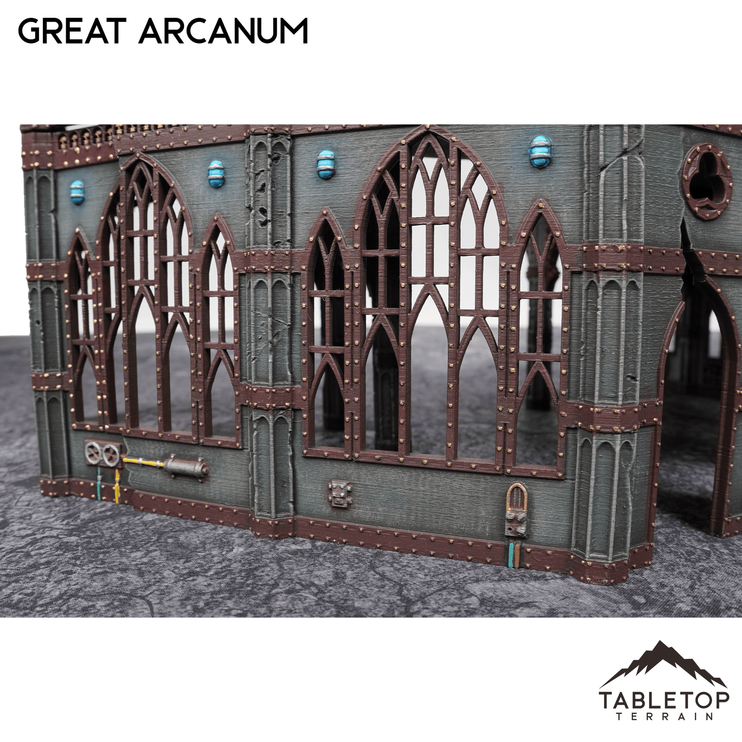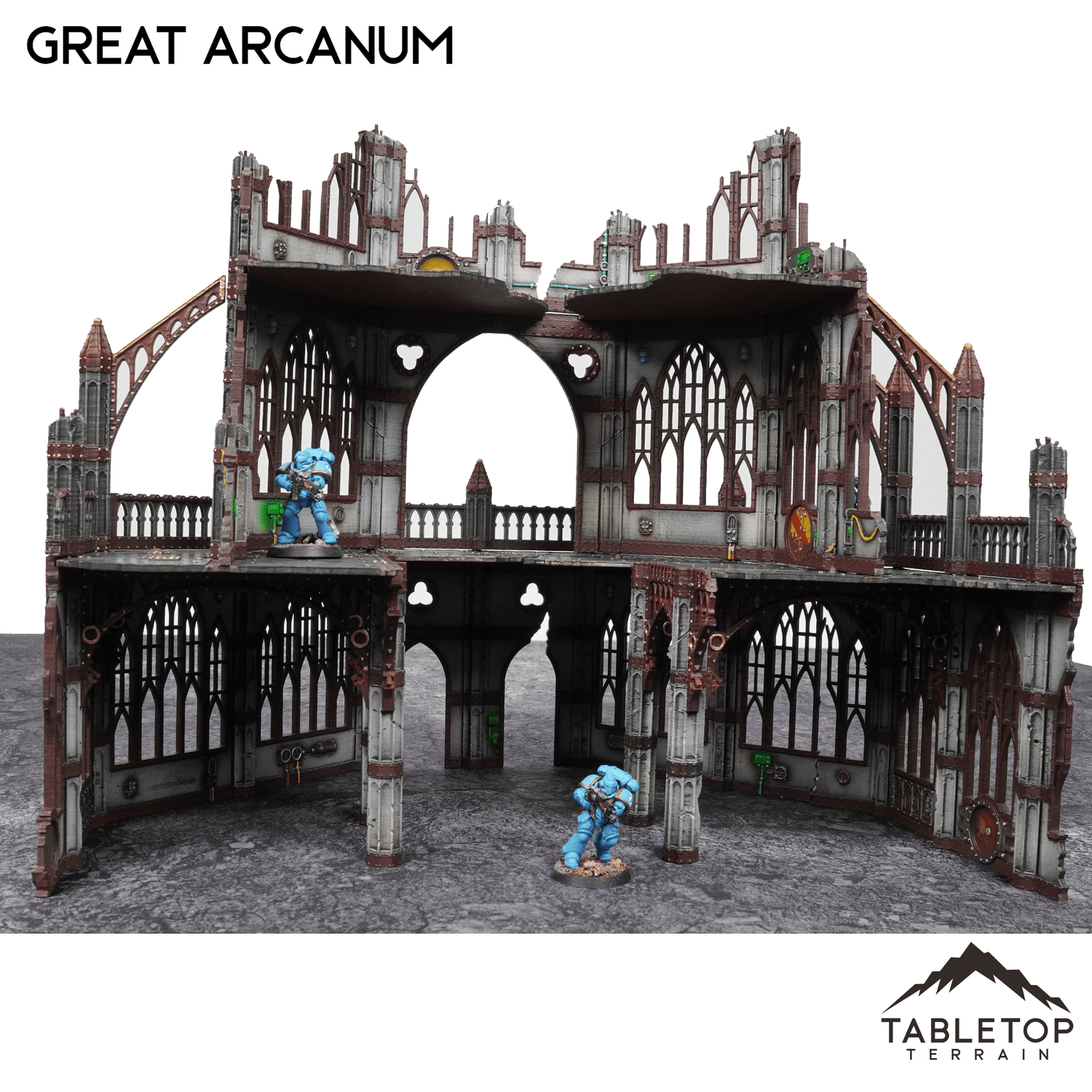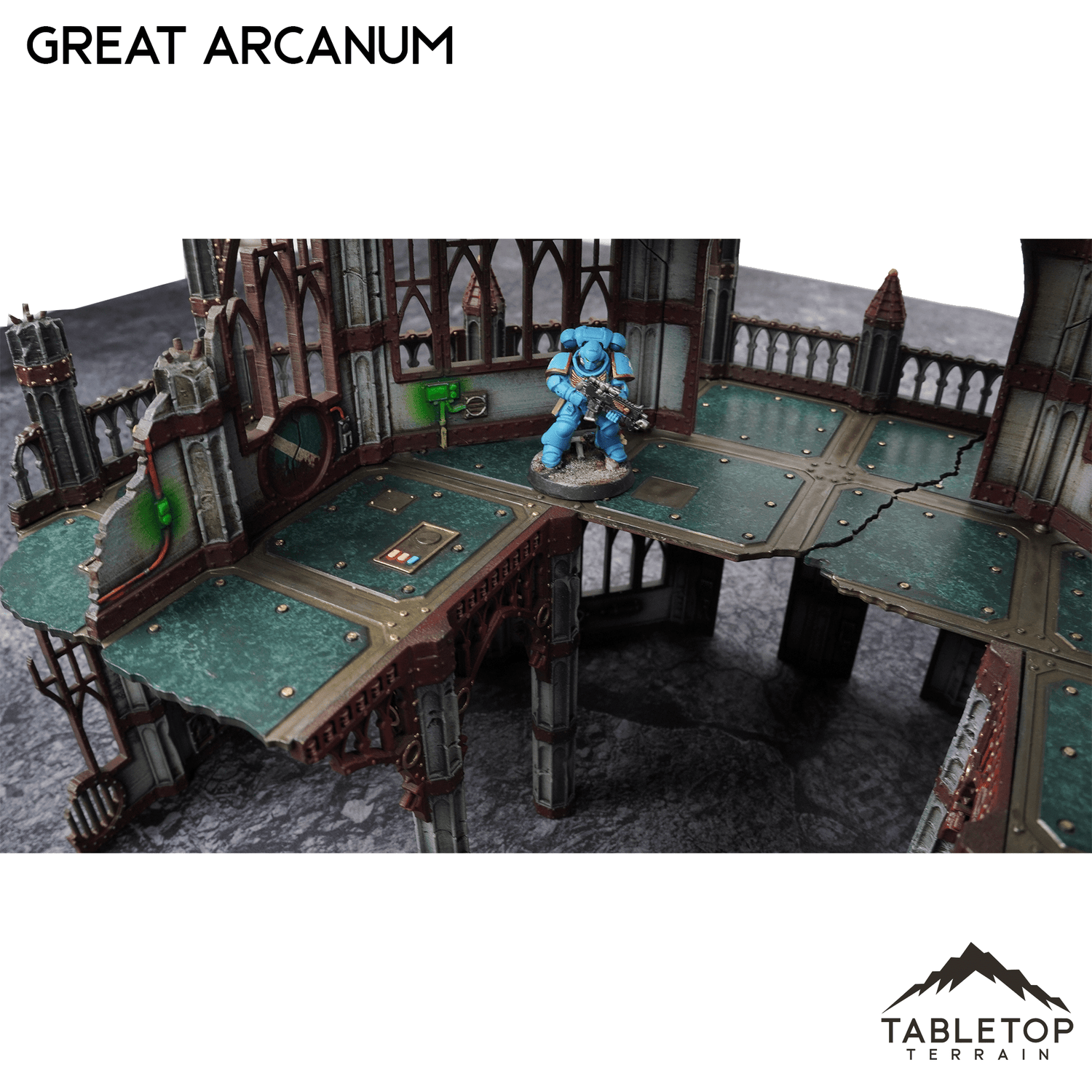 The sweeping walls of the Great Arcanum are still used to defend the imperial units stationed in this ruined city. The set features 3 stories of elevation, highly detailed walls and texturing, and a convenient setup for painting and storage. The Great Arcanum works nicely on its own, or mixed together with other terrain from this collection to build out a massive cityscape on this ruined battlefield.