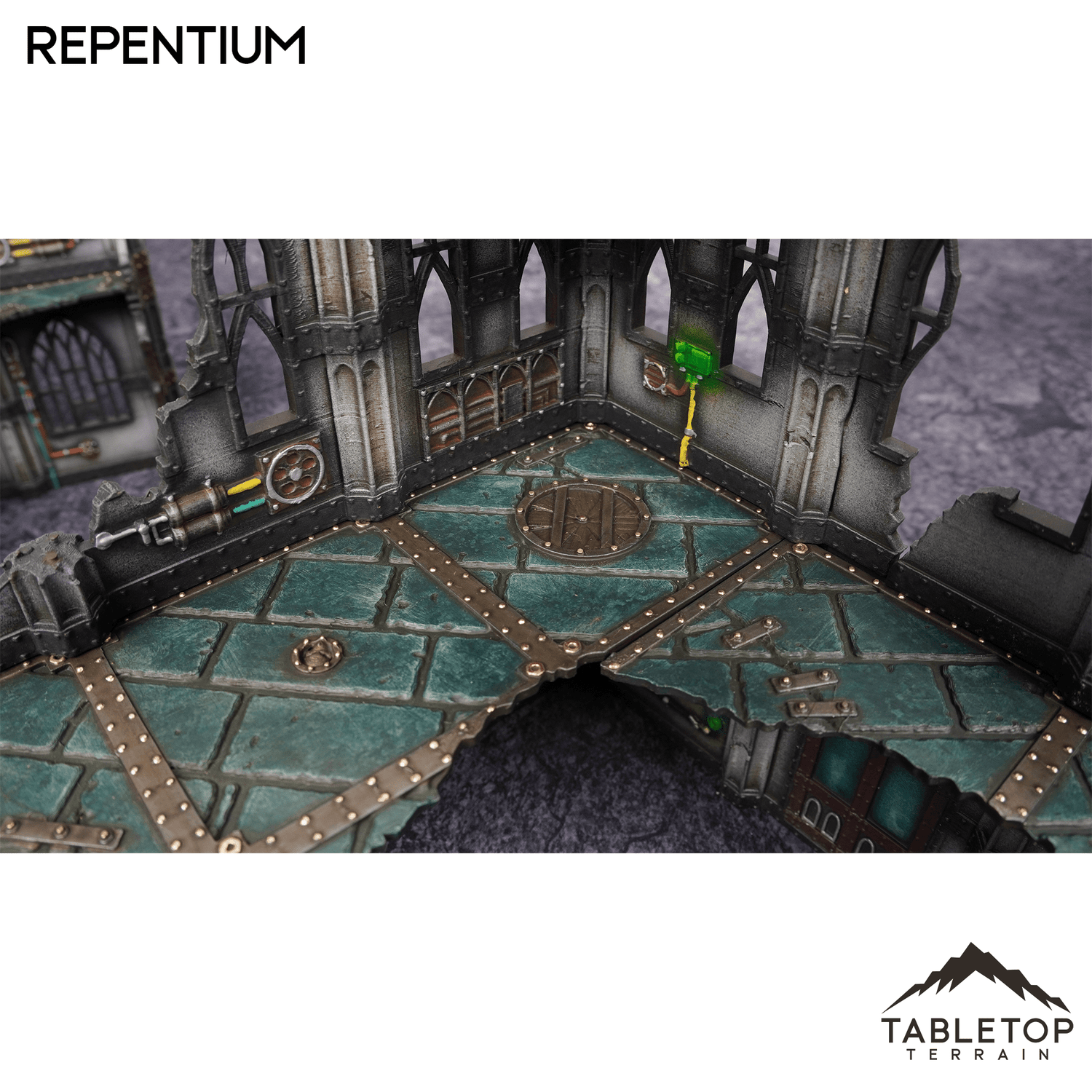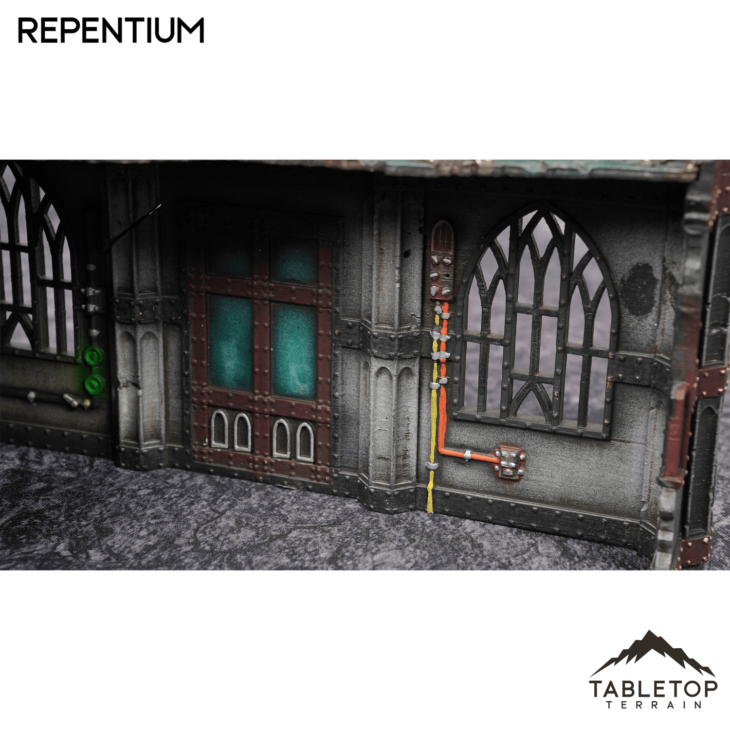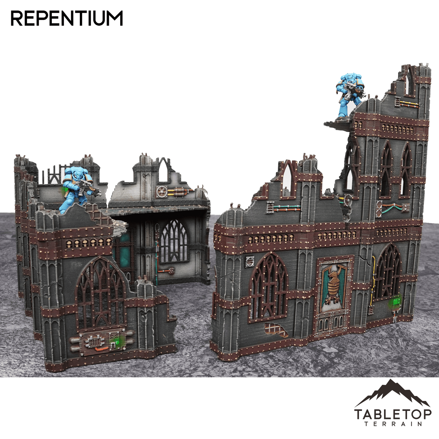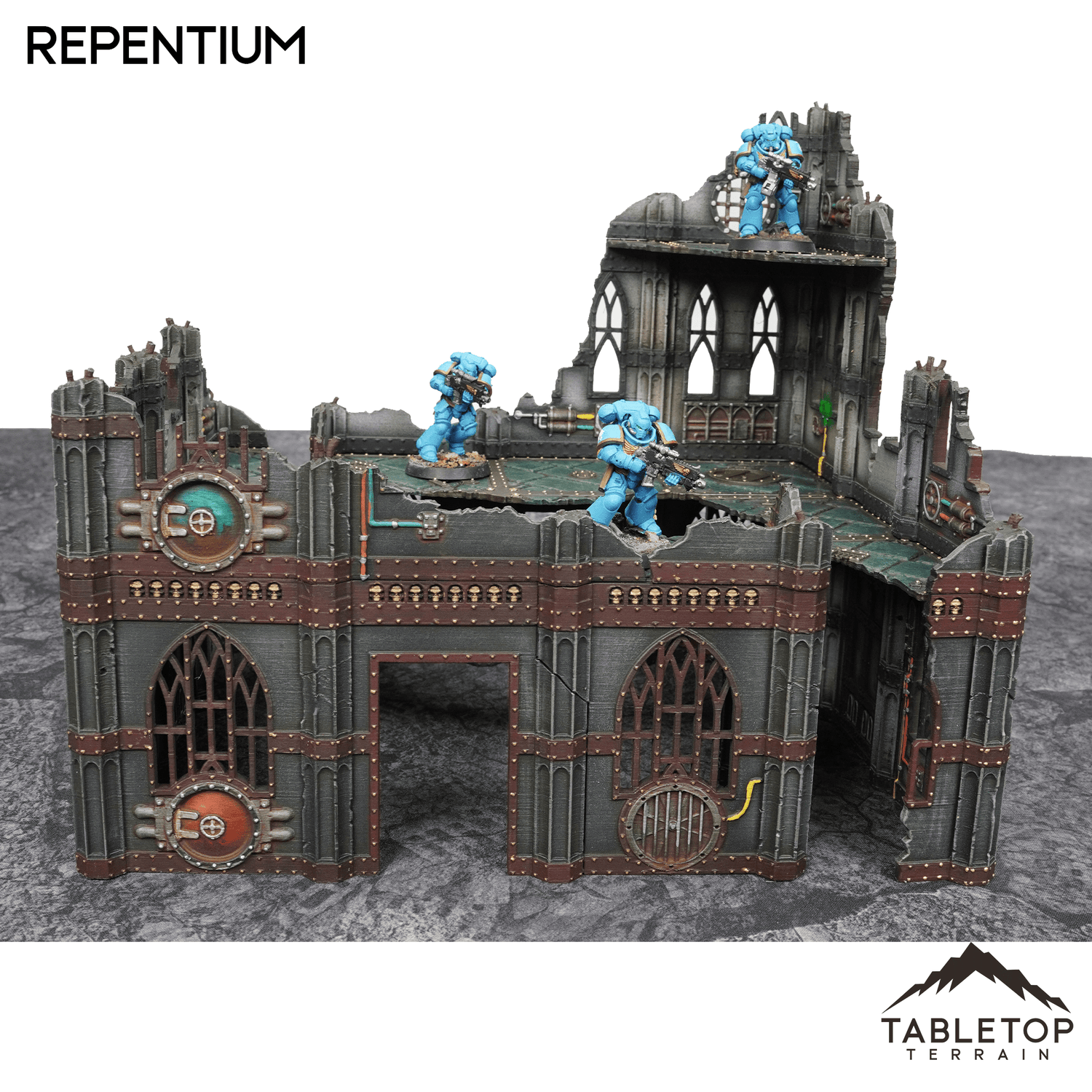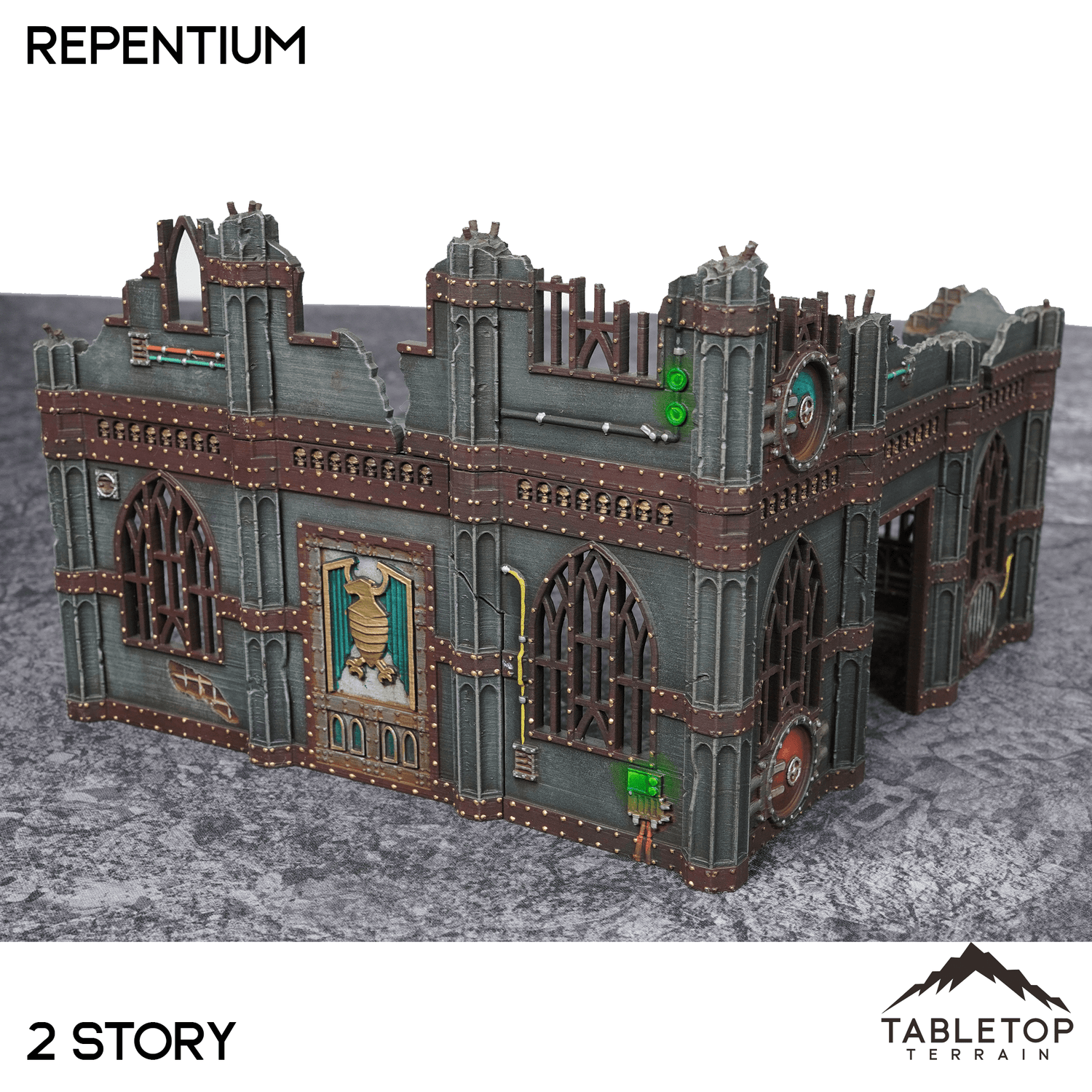 The Repentium set is a collection of 2 buildings sharing the same theme. There is a 2-story version, or a 3-story version, depending on what you need for your tabletop's layout. We also have an option to buy both buildings at once for a built-in discount. The entire set is highly detailed, made to really pop on the table when painted, and still be easy to store when not in use.