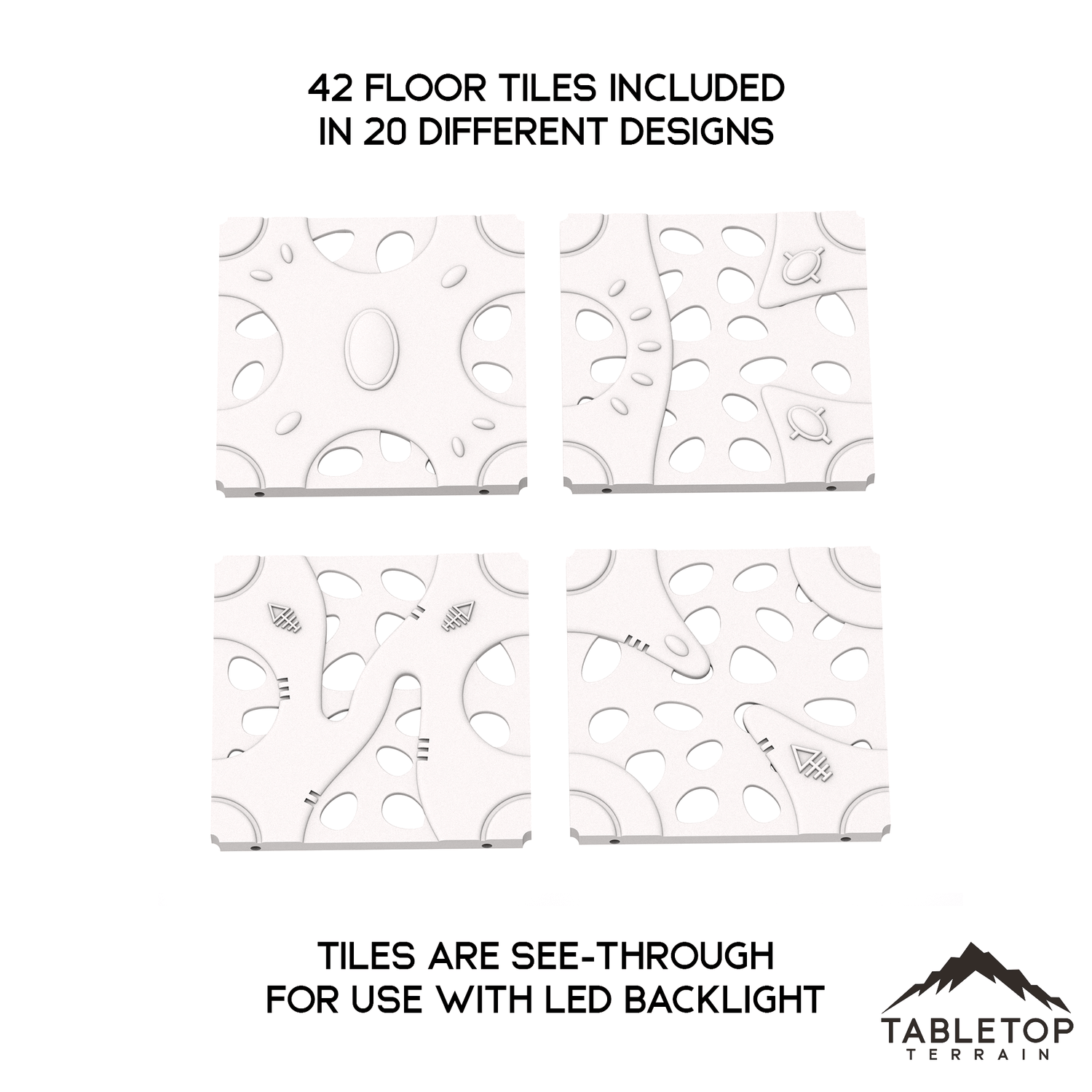 Floor Set adds- 42 Floor tiles, 26 Floor Border Tiles, 56 Floor Risers for underneath LED lighting.