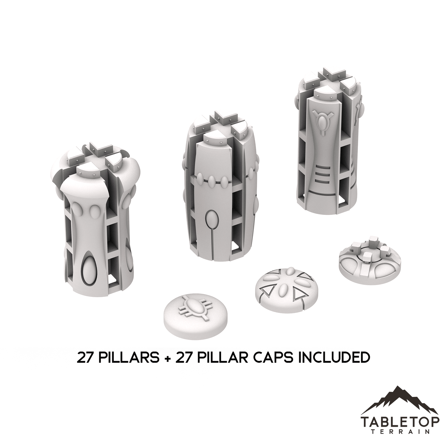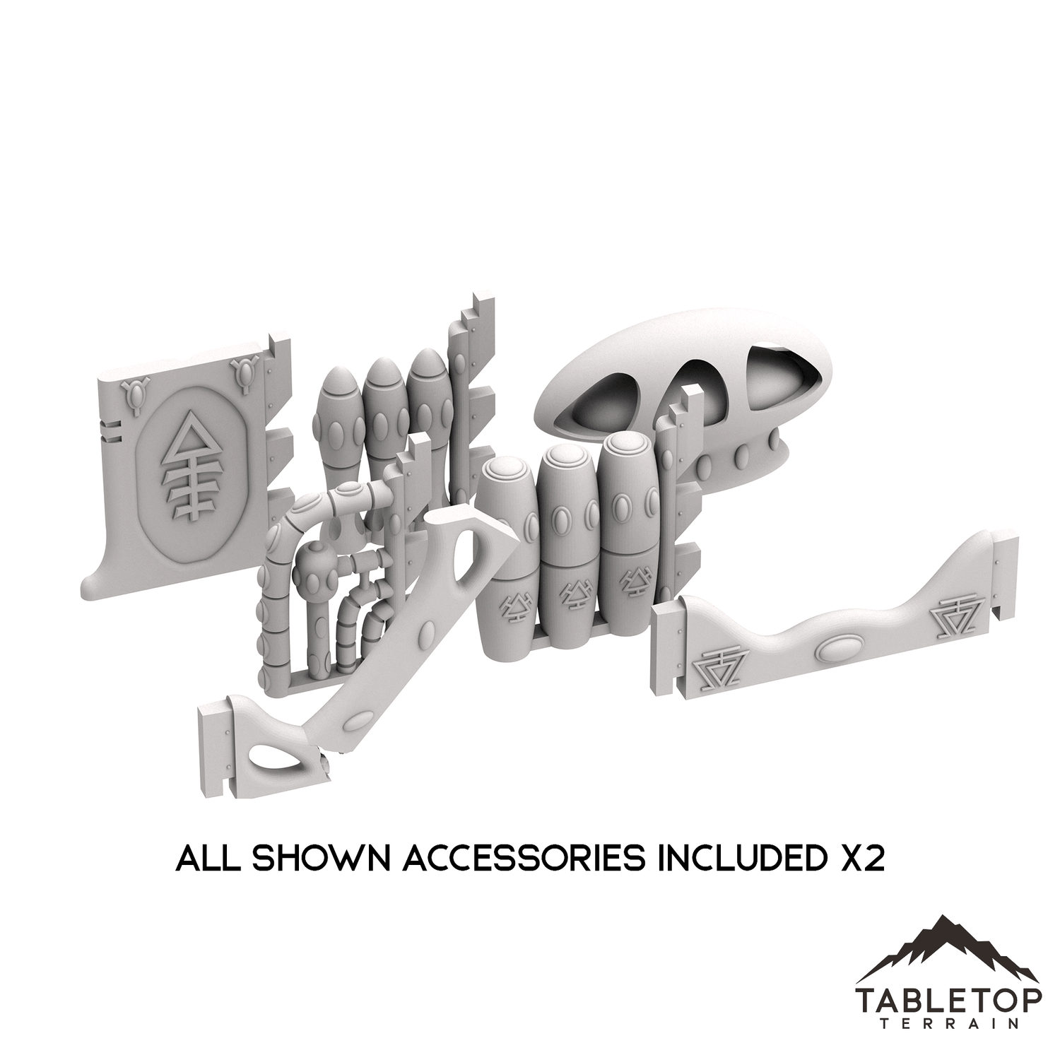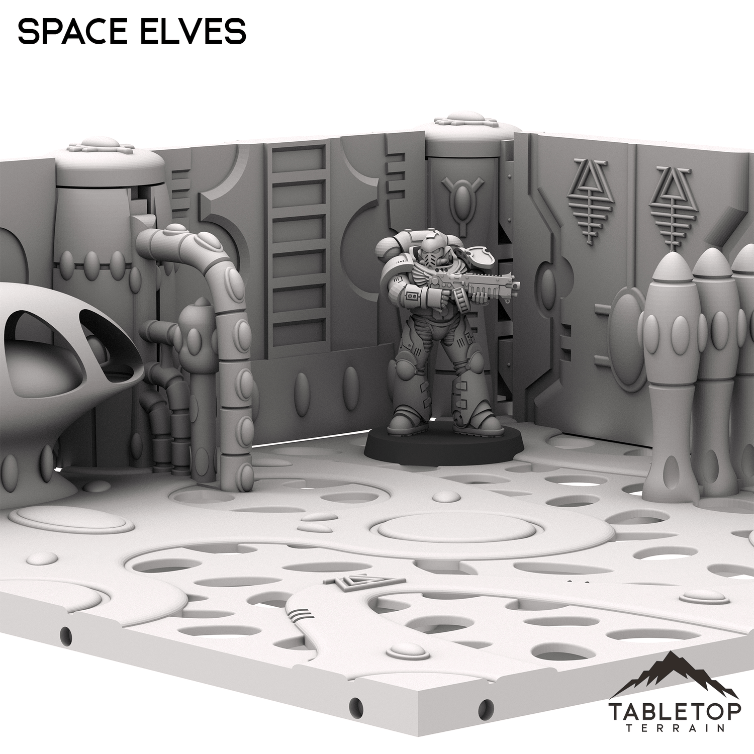 The Space Elves Worldship Terrain set is a combination of walls and scatter accessories, forming the interior of an elven-style battleship. The terrain is fully modular for arranging into whatever order you'd like, and is 100% compatible with the official GW terrain. These pieces slot in with the official ones, allowing you to mix and match to create a larger battlefield. We also sell styles of ship terrain for different factions, such as Gothic Navy or Tombships.