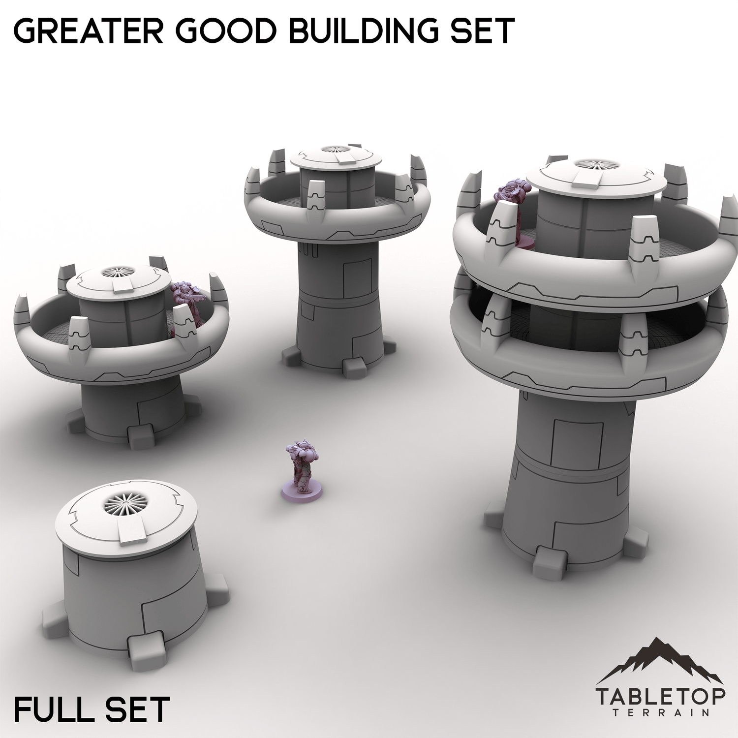 The Greater Good Buildings are various sets of xenos buildings. These buildings are stackable and interchangeable with one another.