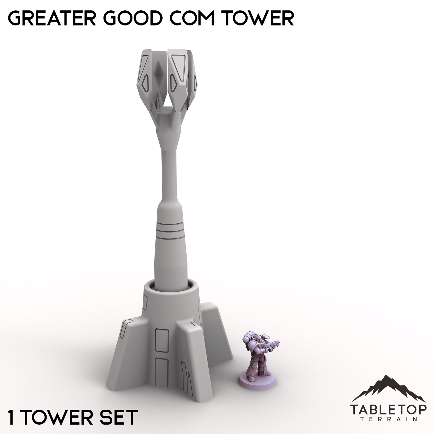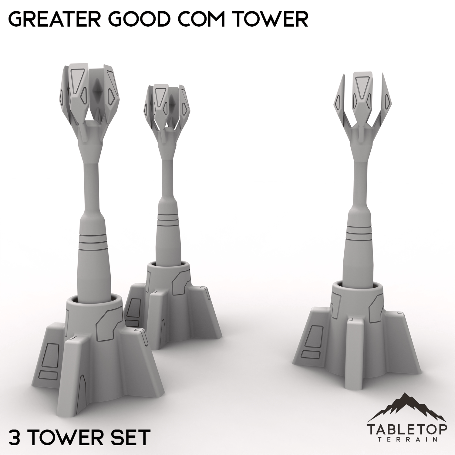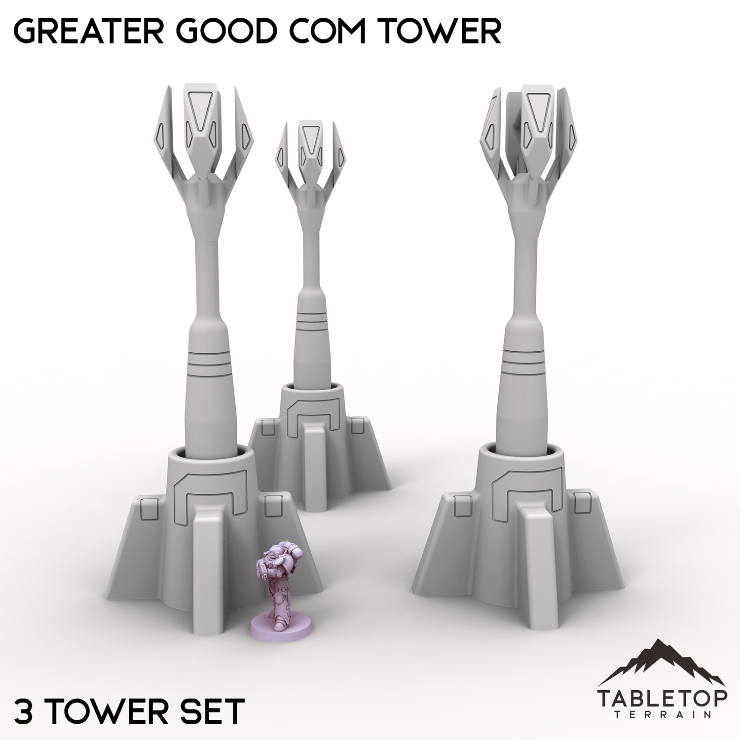 The Greater Good Com Tower is a set of xenos terrain that comes by itself or in a set of 3. The Com Towers are designed for sci-fi wargames.