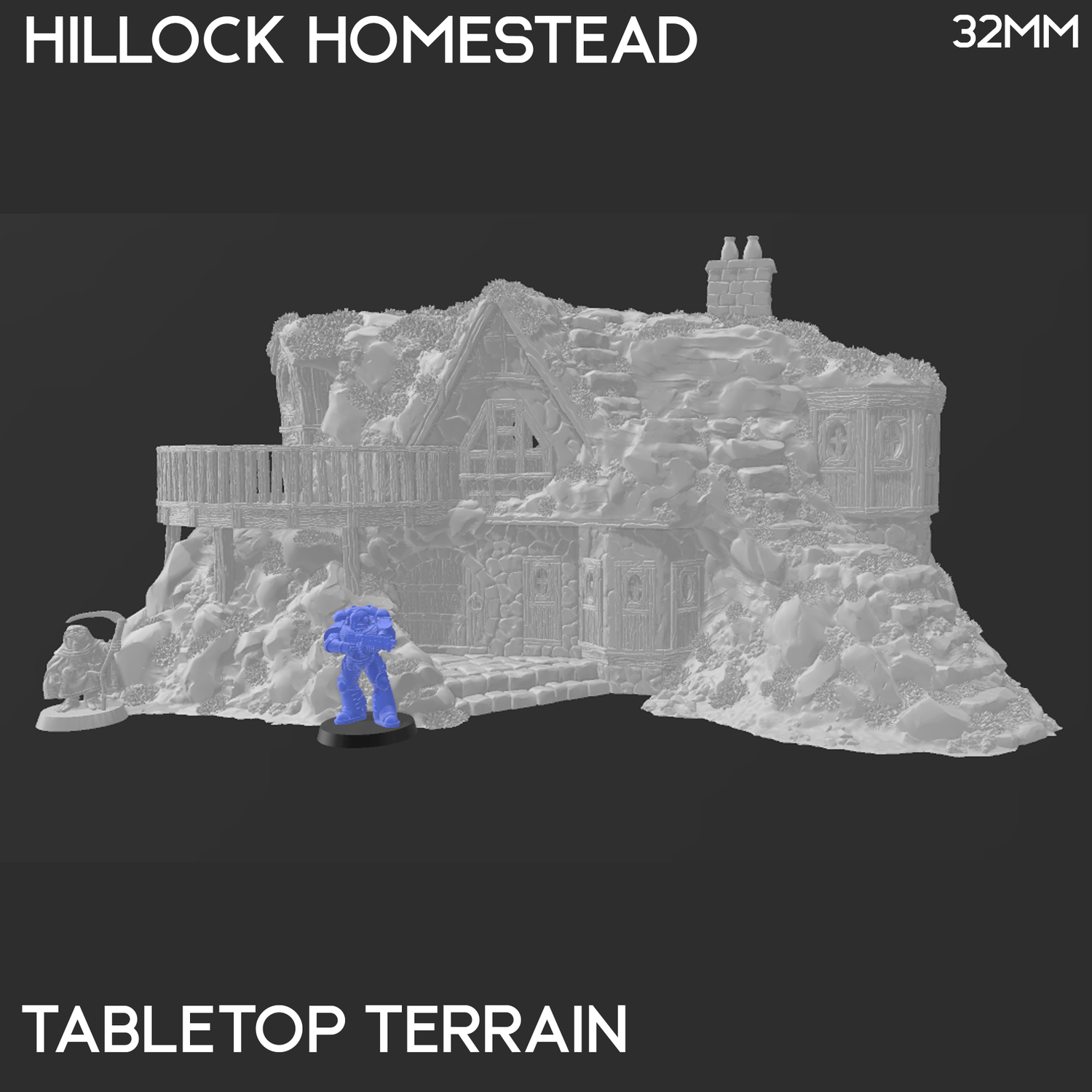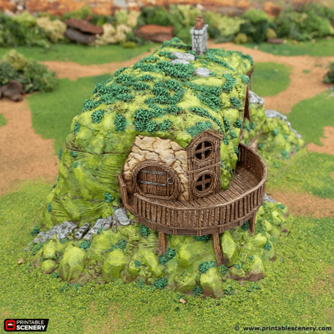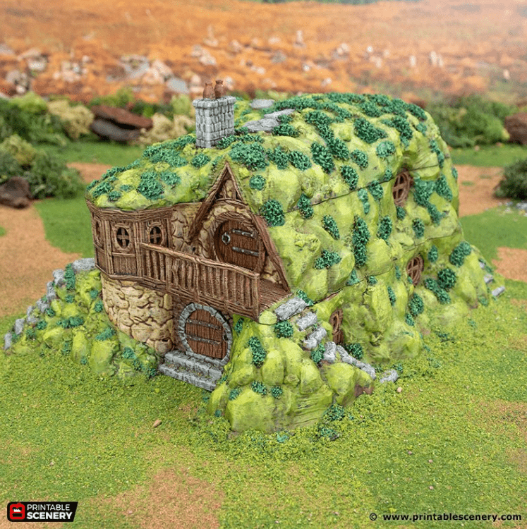The Hillock Homestead is a two story building built into the hillside. It is designed to be part of the fantasy universe Reign of Arcane. It is 3D printed in 32mm, 28mm or 15mm scale in .2mm resolution.