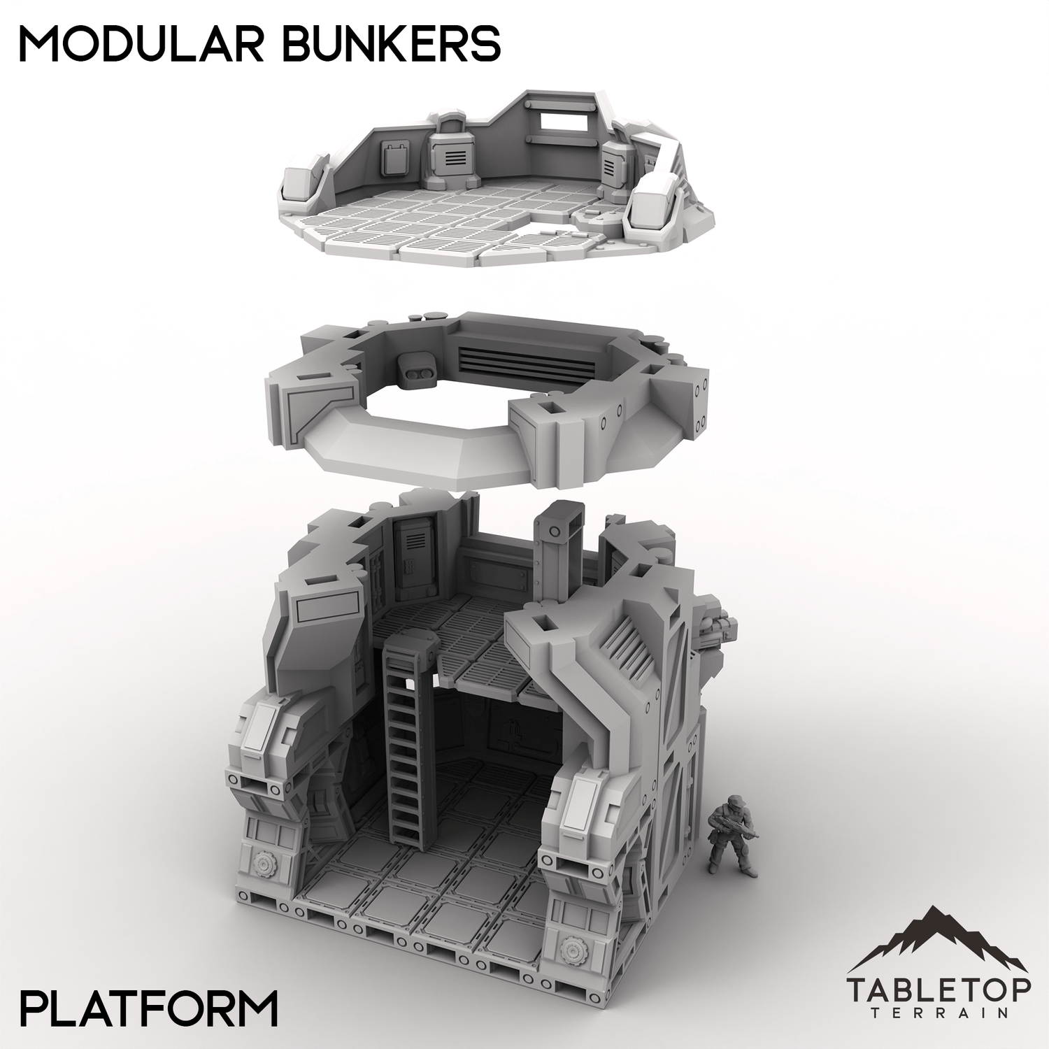 1 Modular Bunker Platform set in 28/32mm scale. 9 pieces + included clips for assembly.
