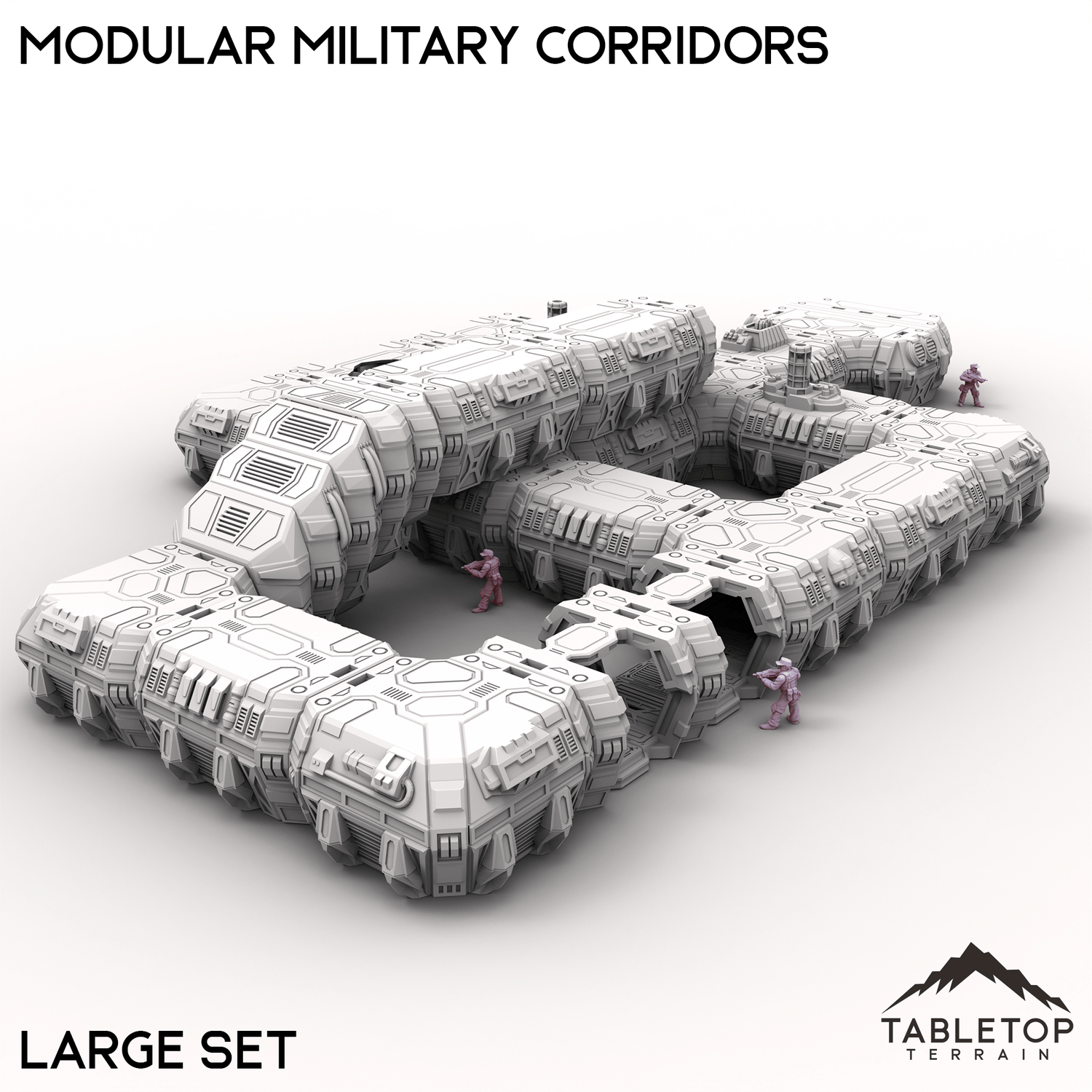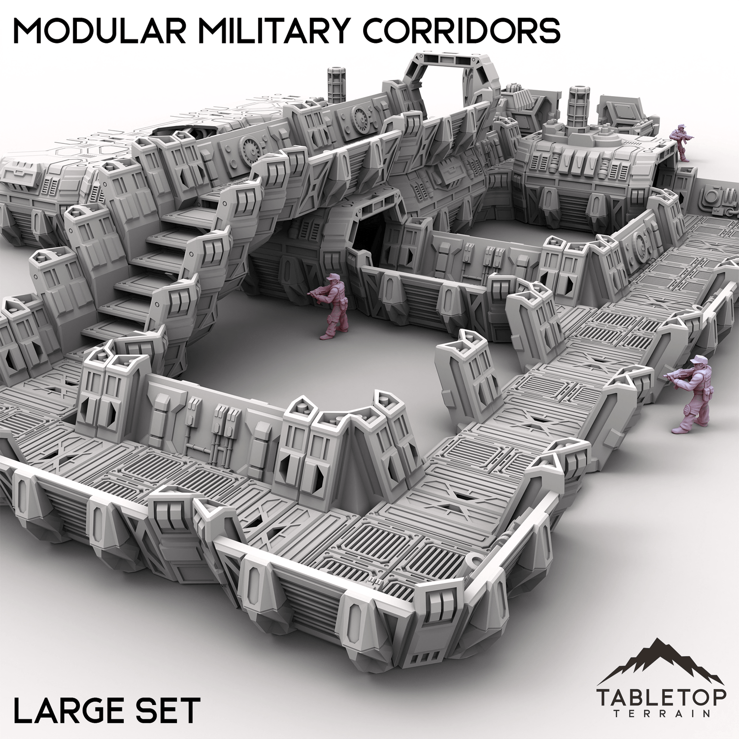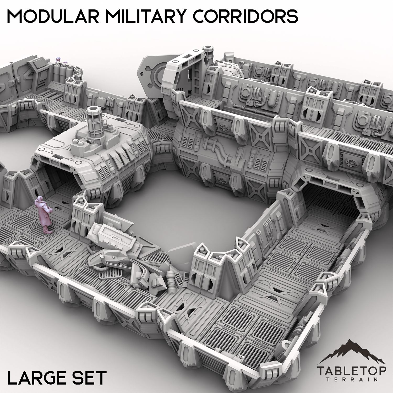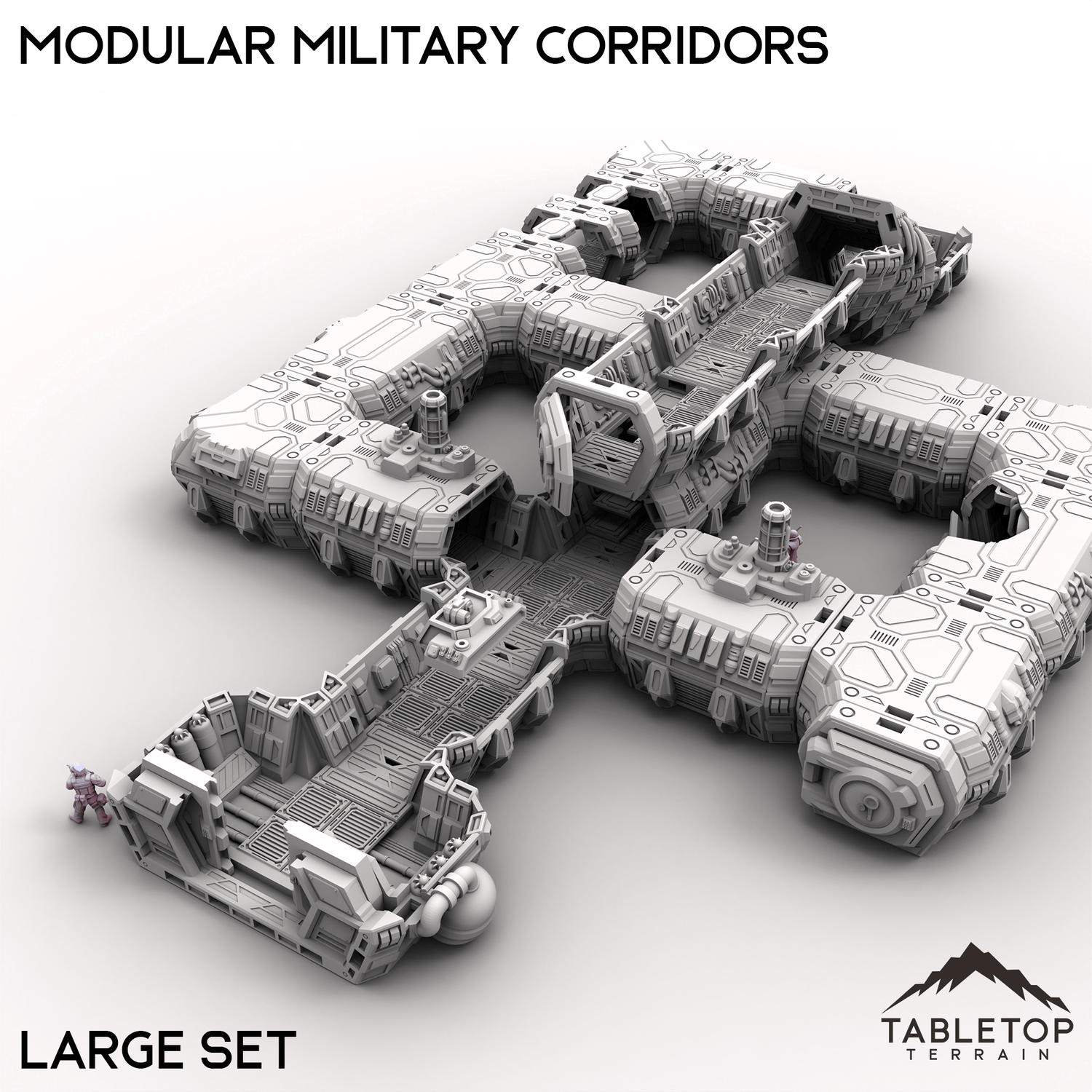 Large The Modular Military Corridors are perfect for building out the tight, gritty interiors of a base or starship. Each section connects cleanly to the next, letting you create winding hallways, intersections, or sprawling complexes with ease. With reinforced paneling, exposed conduits, and heavy bulkhead-style doors, they bring a industrial or sci-fi feel to your tabletop. These Modular Military Corridors are also able to be mixed-and-matched with other Outpost Origins and The Dragon's Rest sets. An example would be mixing parts from Modular Military Corridors and Modular Bunkers to create a strong defensive formation.