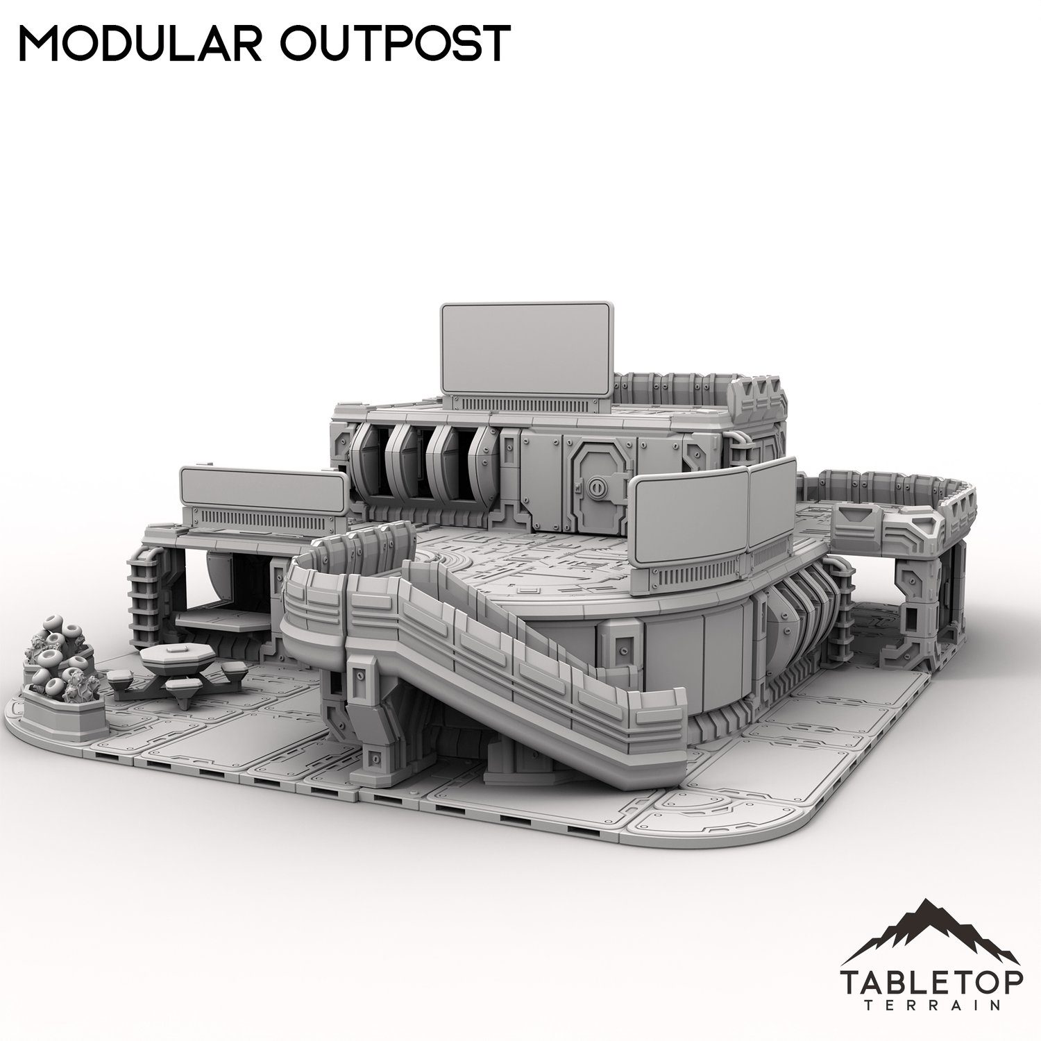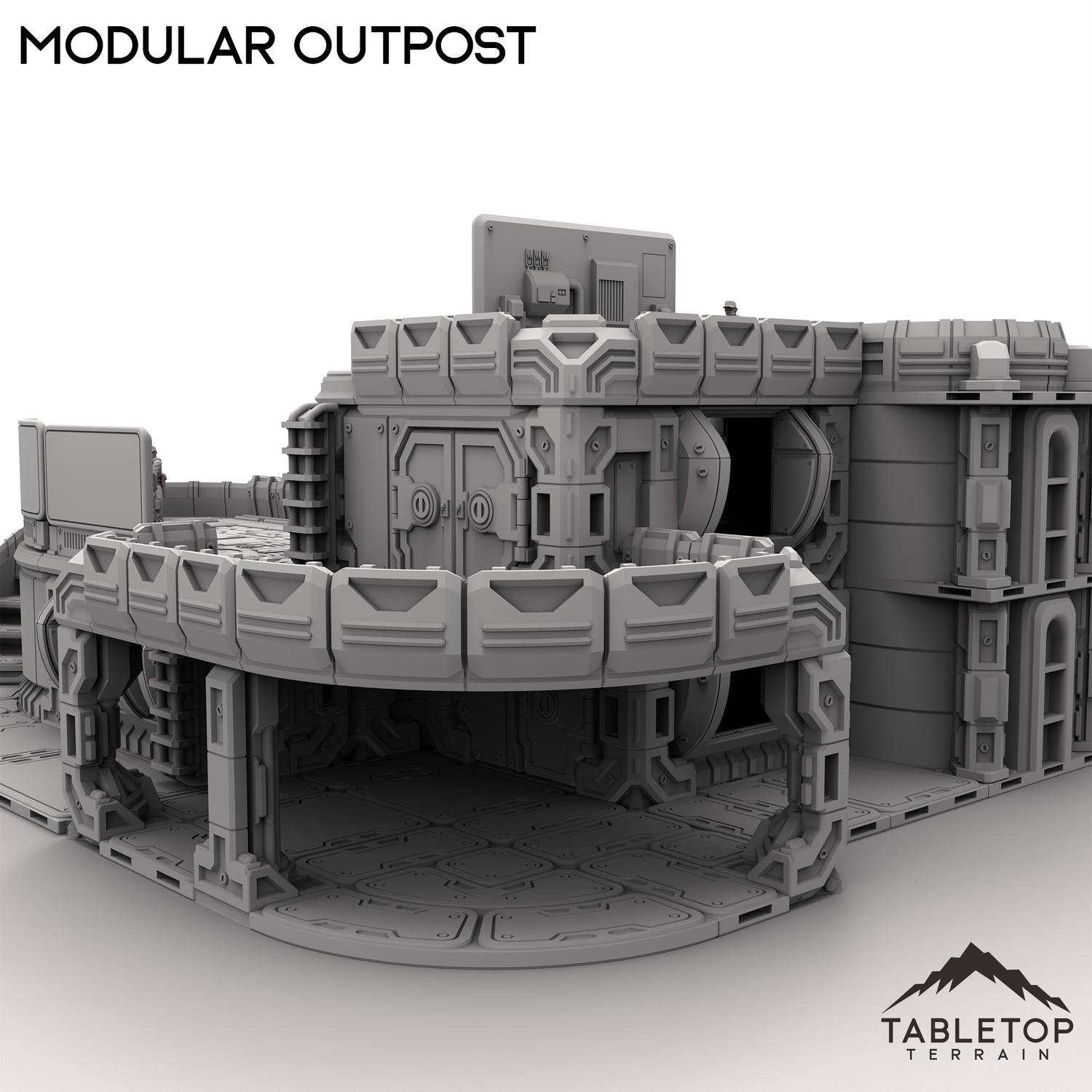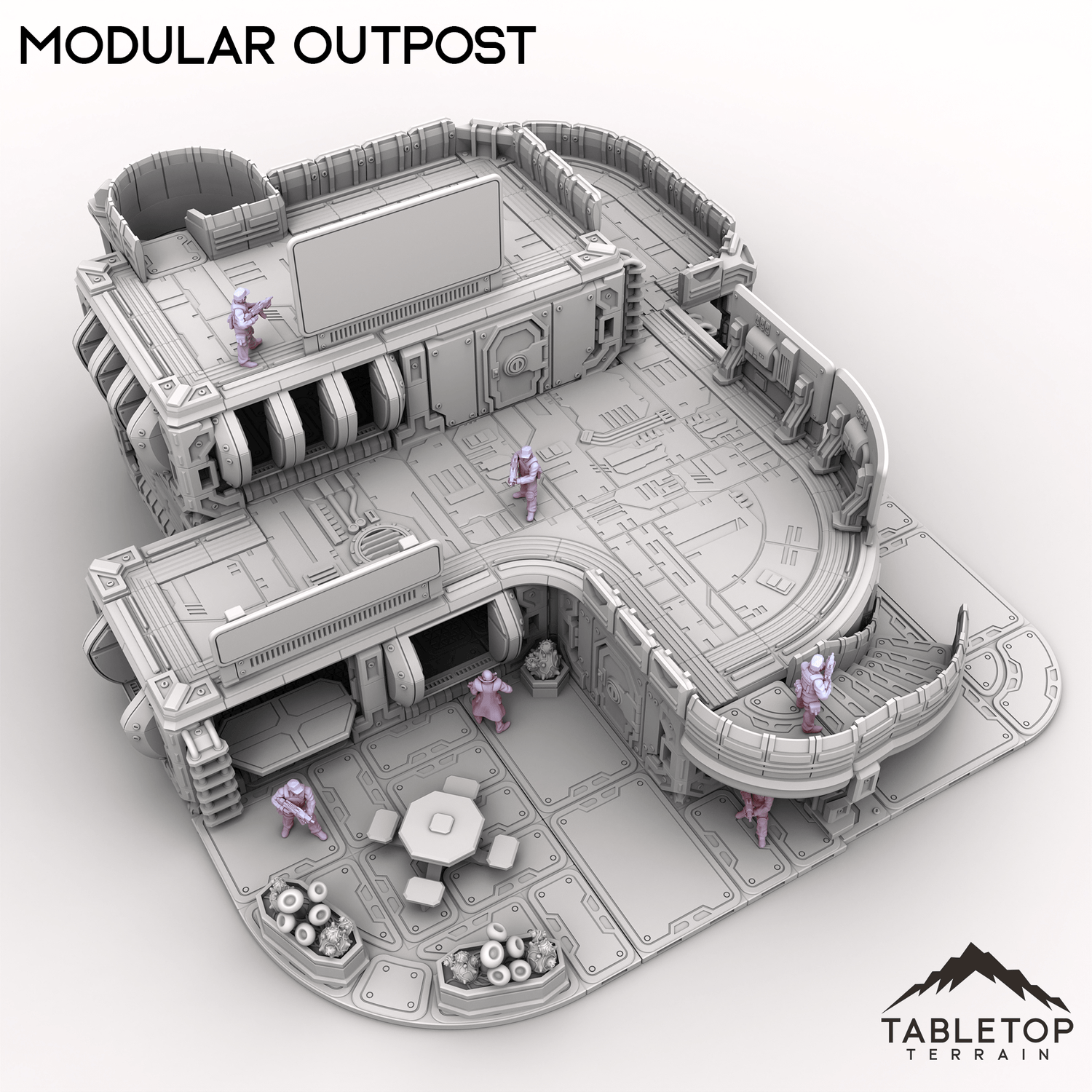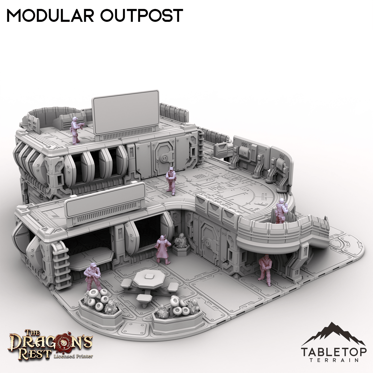 Modular Outpost features a 3-story building with a highly detailed and functional interior, complete with a small courtyard and guest area. The outpost has a number of multi-purpose rooms, each with functional doors and windows. The outpost is made in a sci-fi style but could work nicely for cyberpunk or other similar settings. Modular Outpost is also modular, specifically able to be mixed-and-matched with other Outpost Origins and The Dragon's Rest sets. An example would be mixing parts from Modular Outpost and the Vehicle Repair Station to create an entirely new building layout.