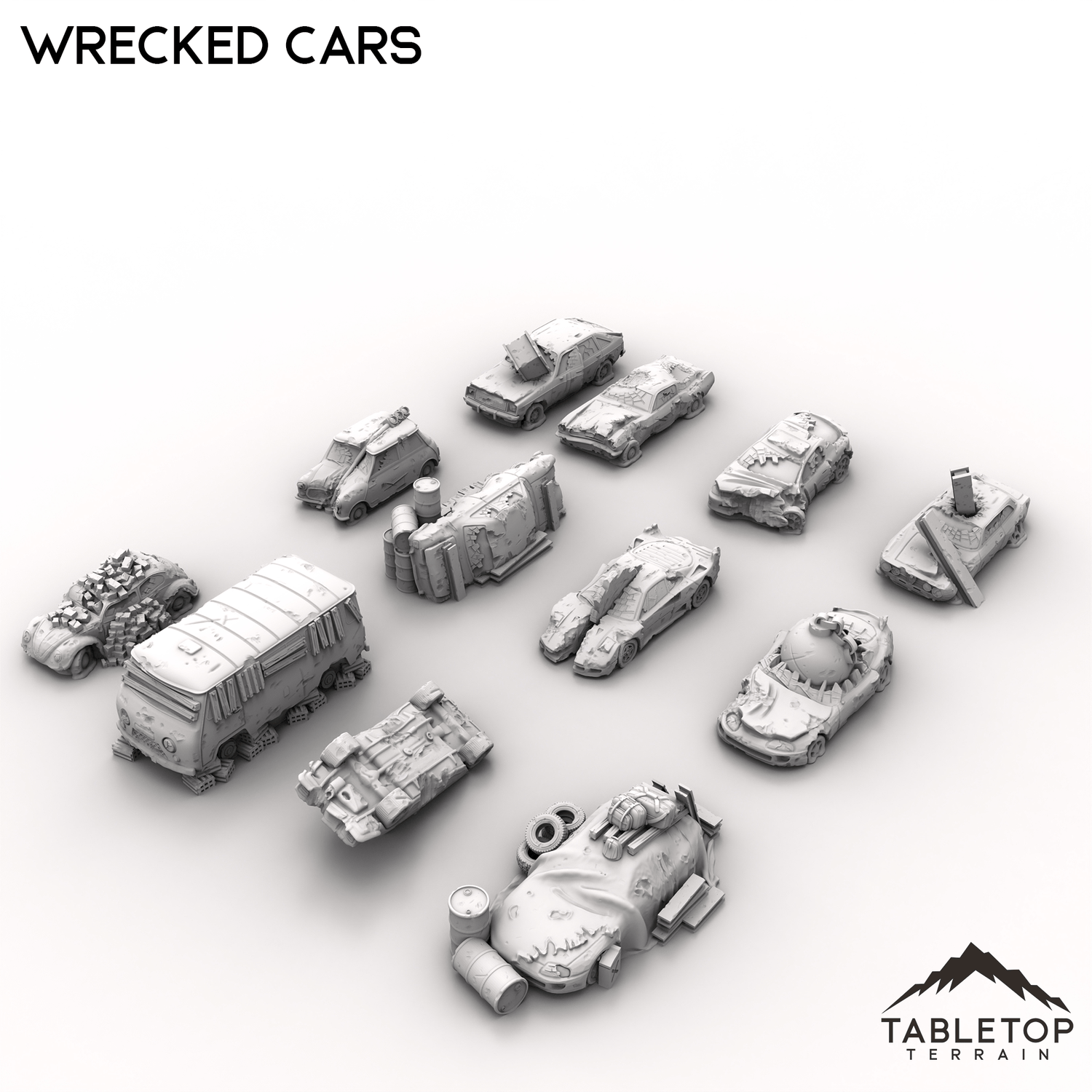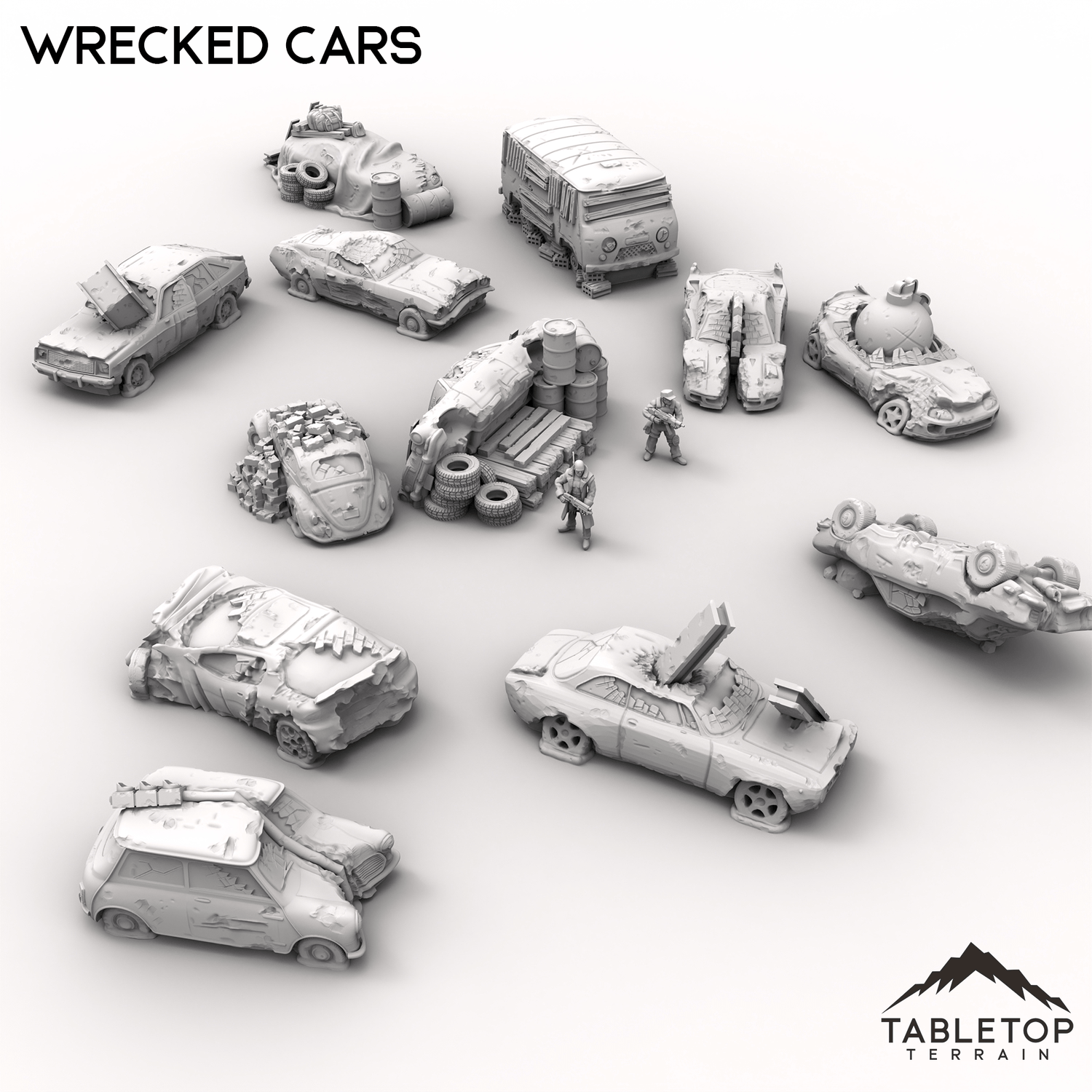 A field of ruined vehicles, this set features 12 different cars that have been left as junk to rust away. Maybe this is a wasteland reminder of what once was, or perhaps just a junkyard in an otherwise bustling city. The wrecked cars come in a variety of scales. The 40mm scale is compatible with large scale games such as MCP. The 32mm scale is slightly smaller and compatible with games such as Fallout Wasteland Warfare or Cyberpunk Red. The 28mm scale is compatible with a variety of game systems. The 20mm scale is designed to be compatible with Gaslands.