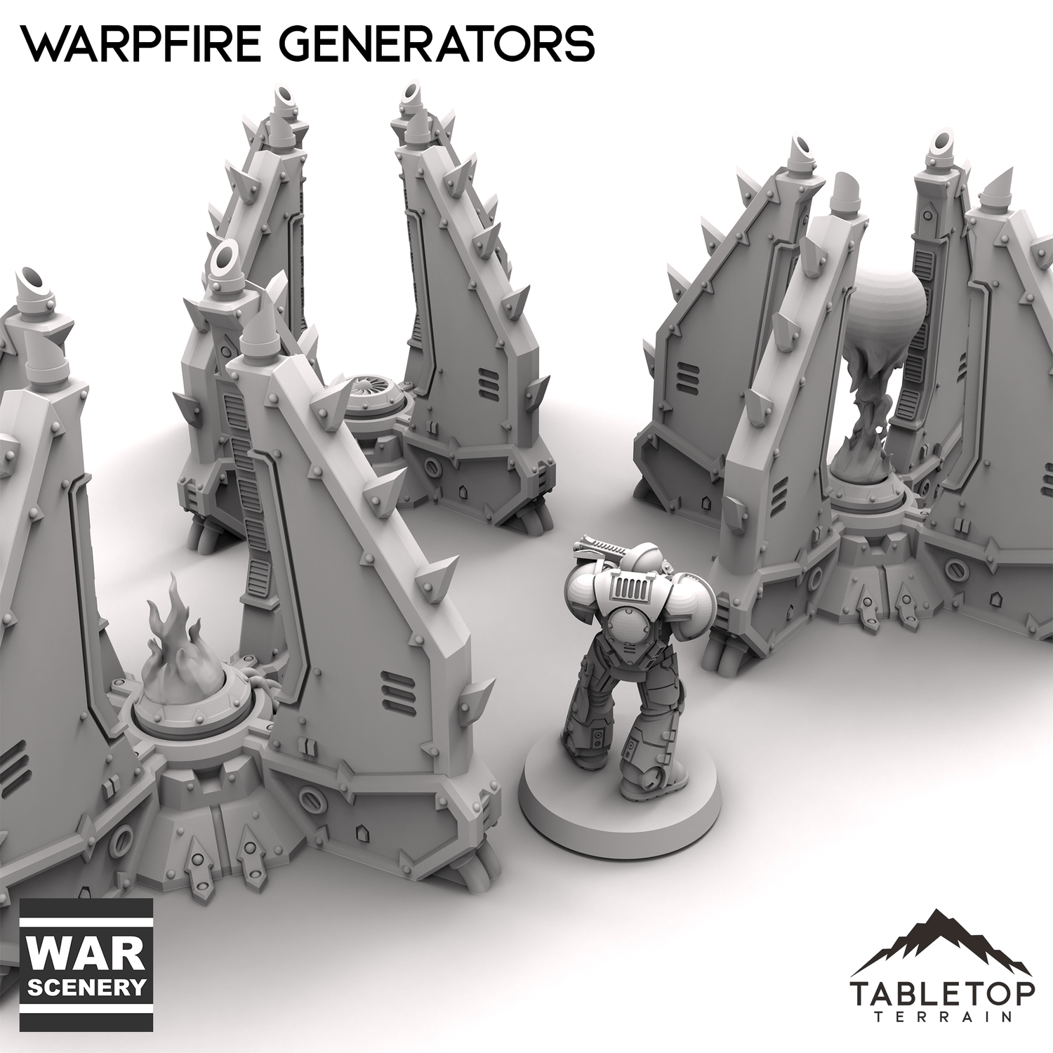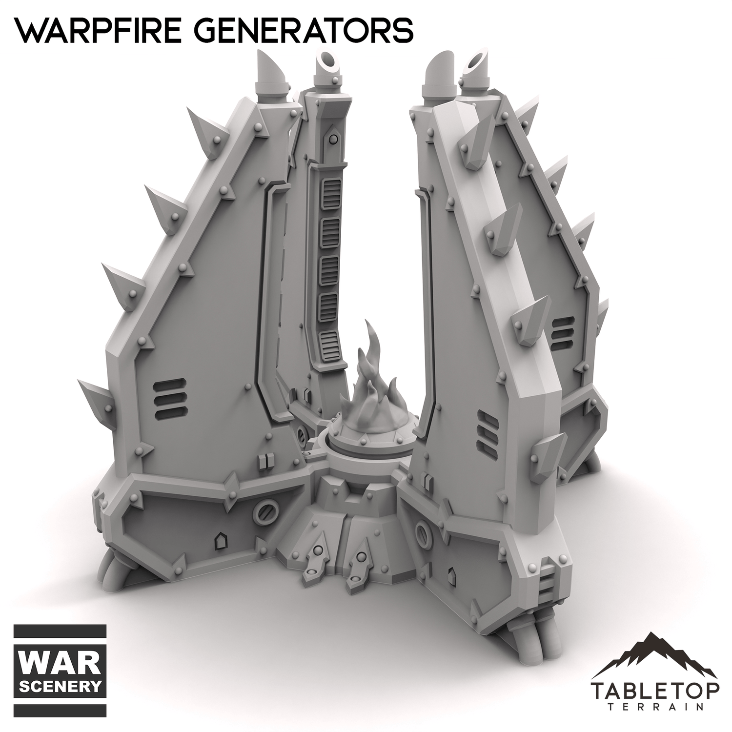 These 3 generators all feature different power cores inside: one with an exhaust fan, one with a small flame of warp power, and one with a large orb of warp power. This set is from the Corrupted Sanctum collection, and matches other sets from that collection. It is designed for sci-fi wargames, but can be used with any system.