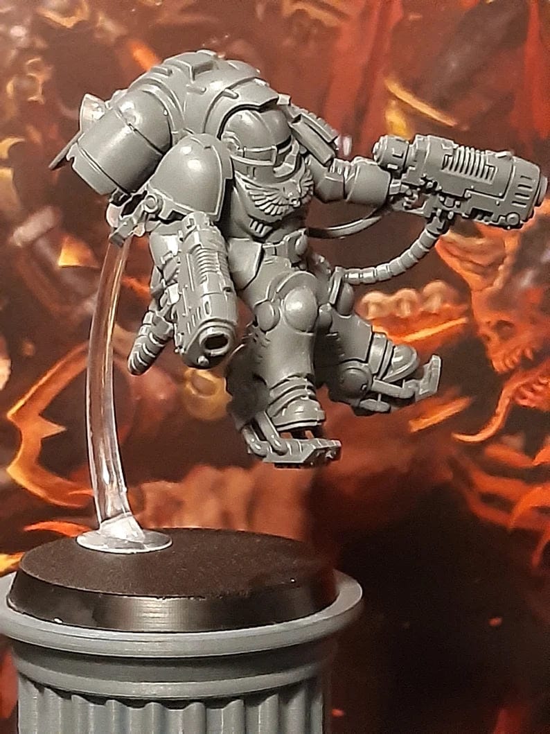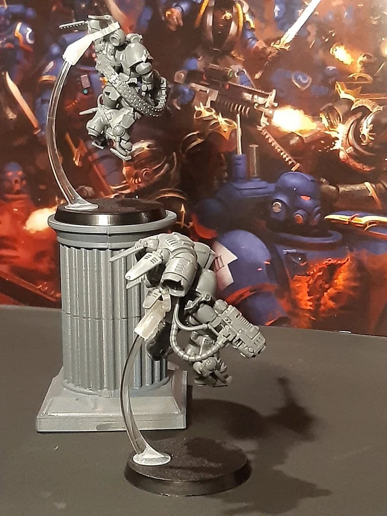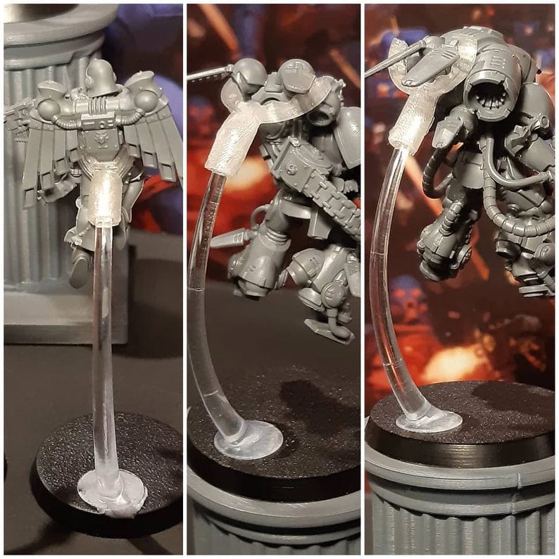 PhoenixForge AU developed alongside other hobbyists these clip adapters i call 'Jump Toppers'. They are quick to assemble and attach, sturdy enough to hold your model in place and easy to remove when its time for packing up. Being able to keep the stand and the model separate during transport ensures that neither will break and need re-gluing (which becomes harder the more times you do this).