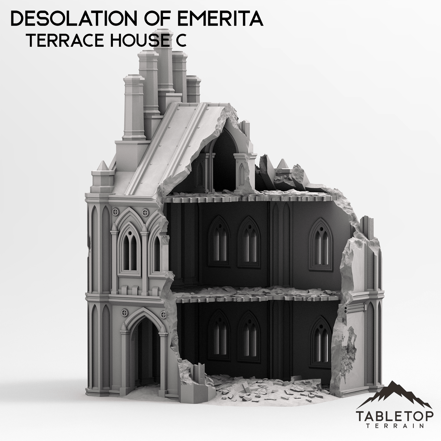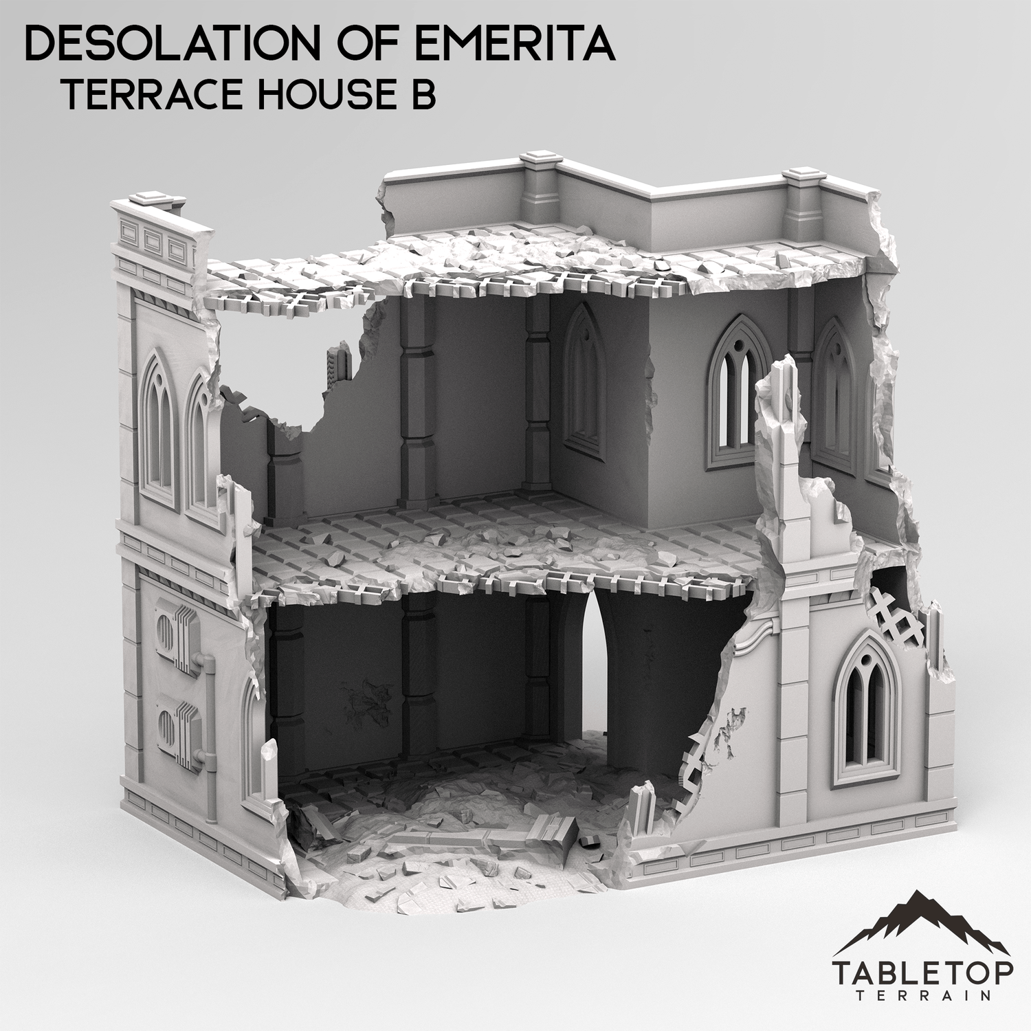 Walk the desolate streets lined with Ruined Terraced Houses, part of the "Desolation of Emerita" series. These structures, with their broken rooftops and hollowed interiors, provide a perfect setting for urban skirmishes or survival scenarios. Each model is designed with detailed damage, adding realism and tactical challenges to your game environment.