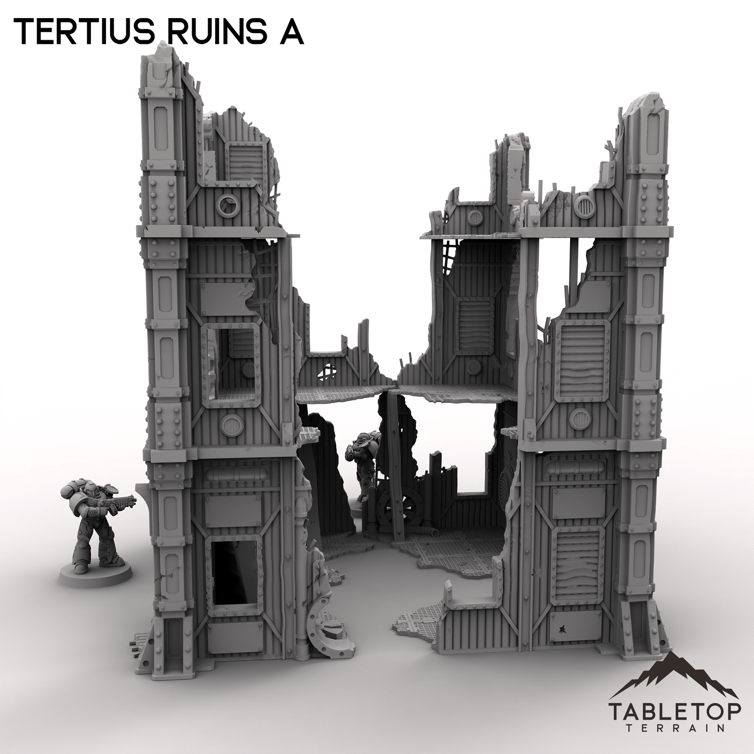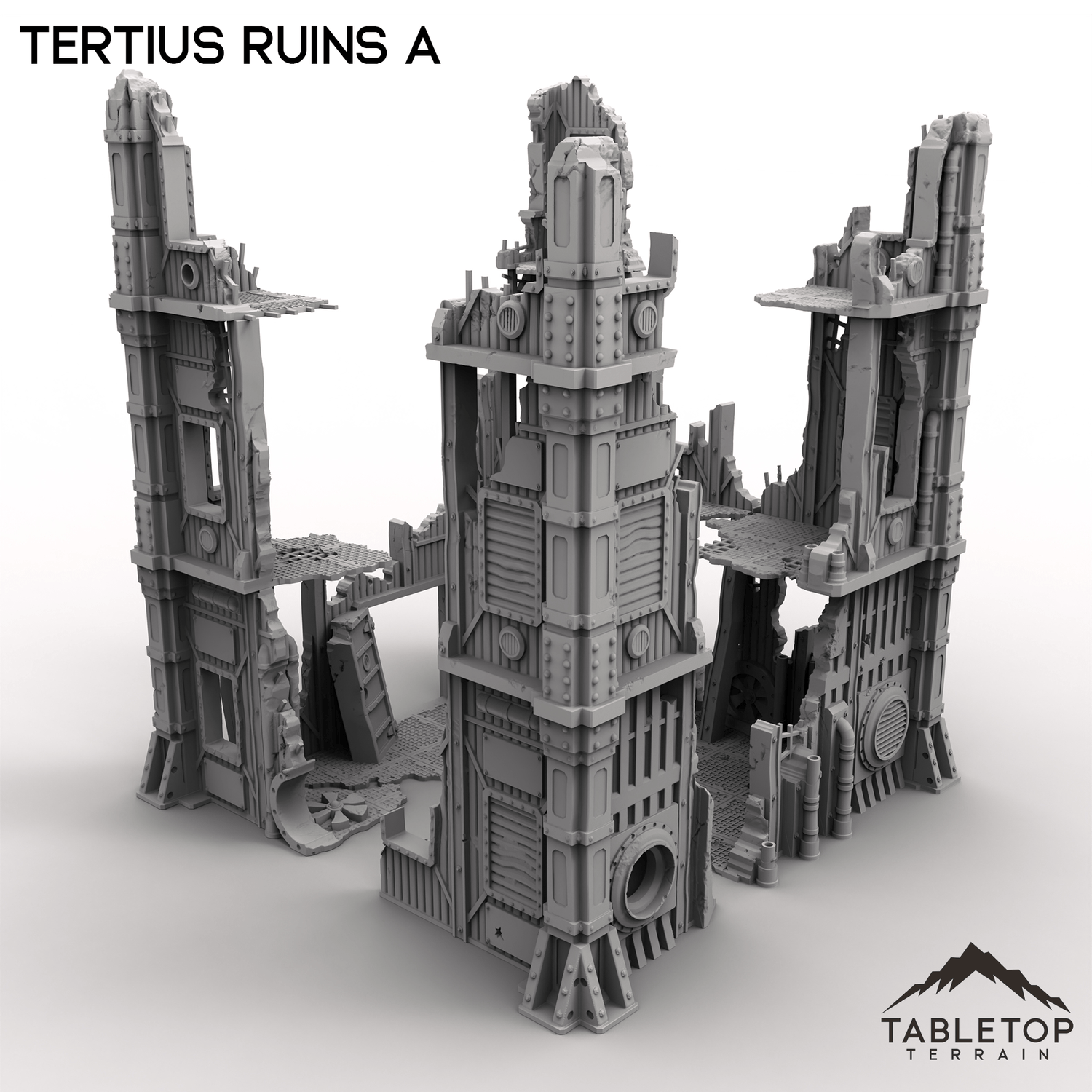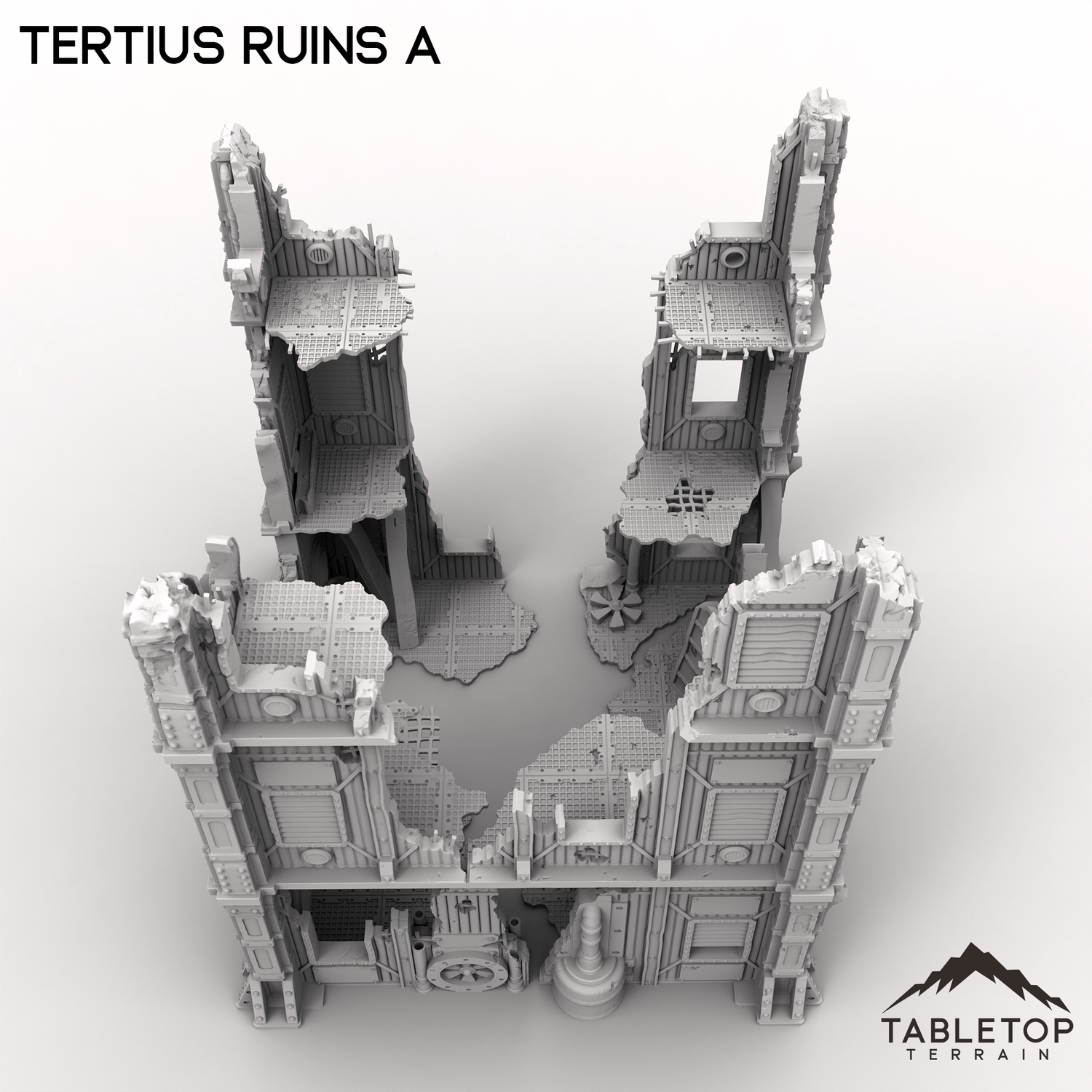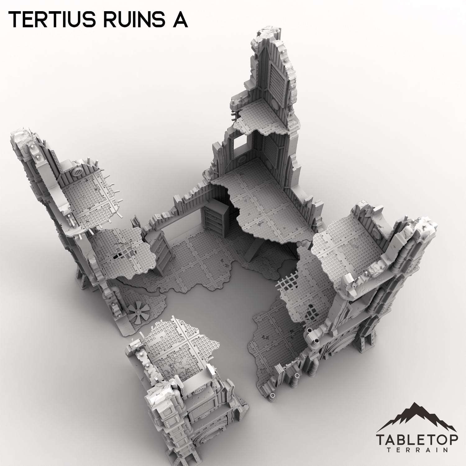 Tertius Ruins A is a set of stackable walls and corners for for grimdark and ruined scifi tabletop games. The walls and floors are all detailed and textured and are made light-weight for easier storage. The pieces have connecting holes in the underside and sit on top of each other, but glue is recommended to keep the different parts from falling over while in use.