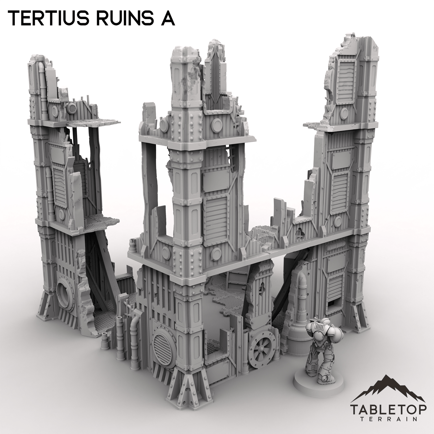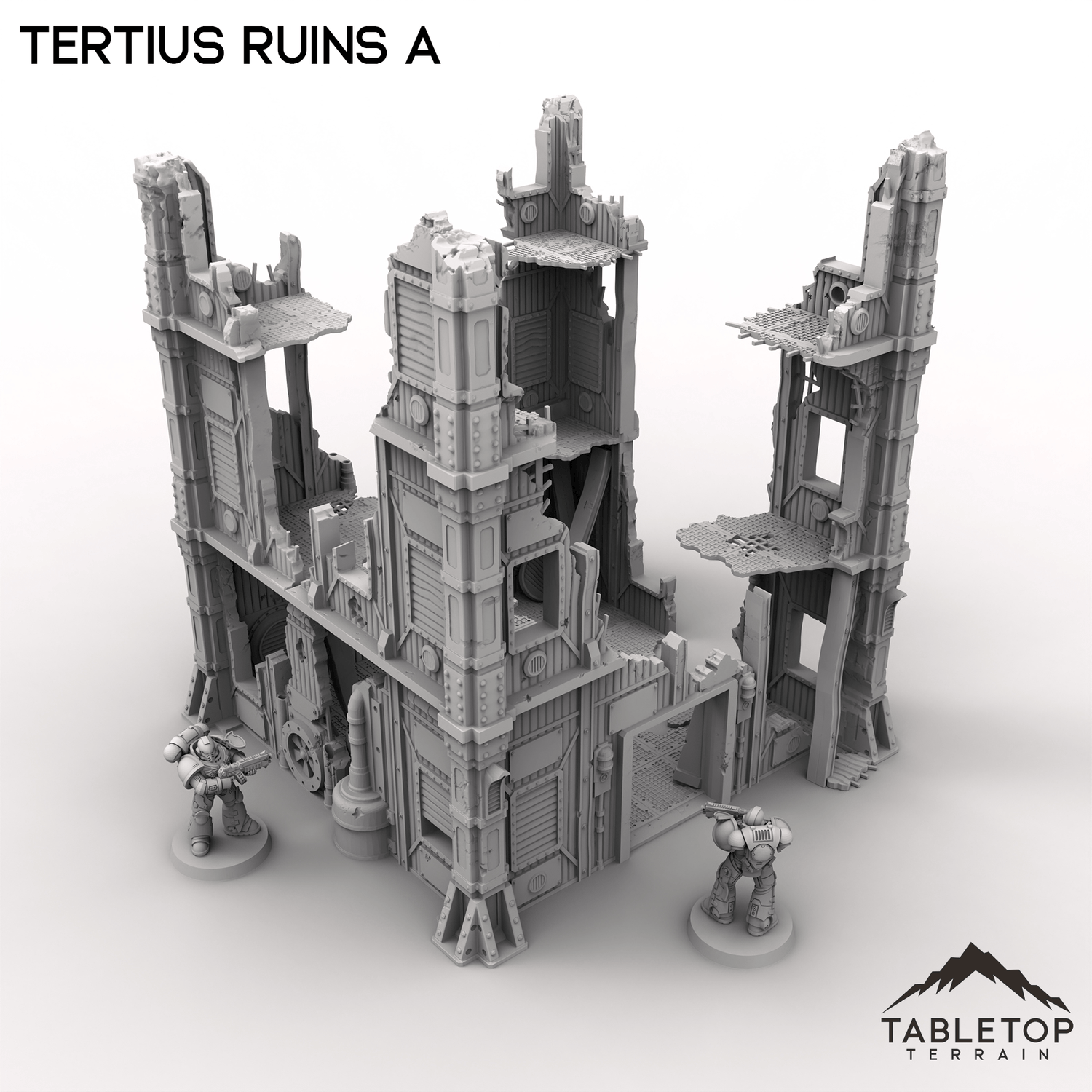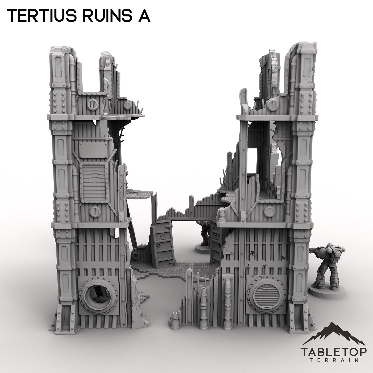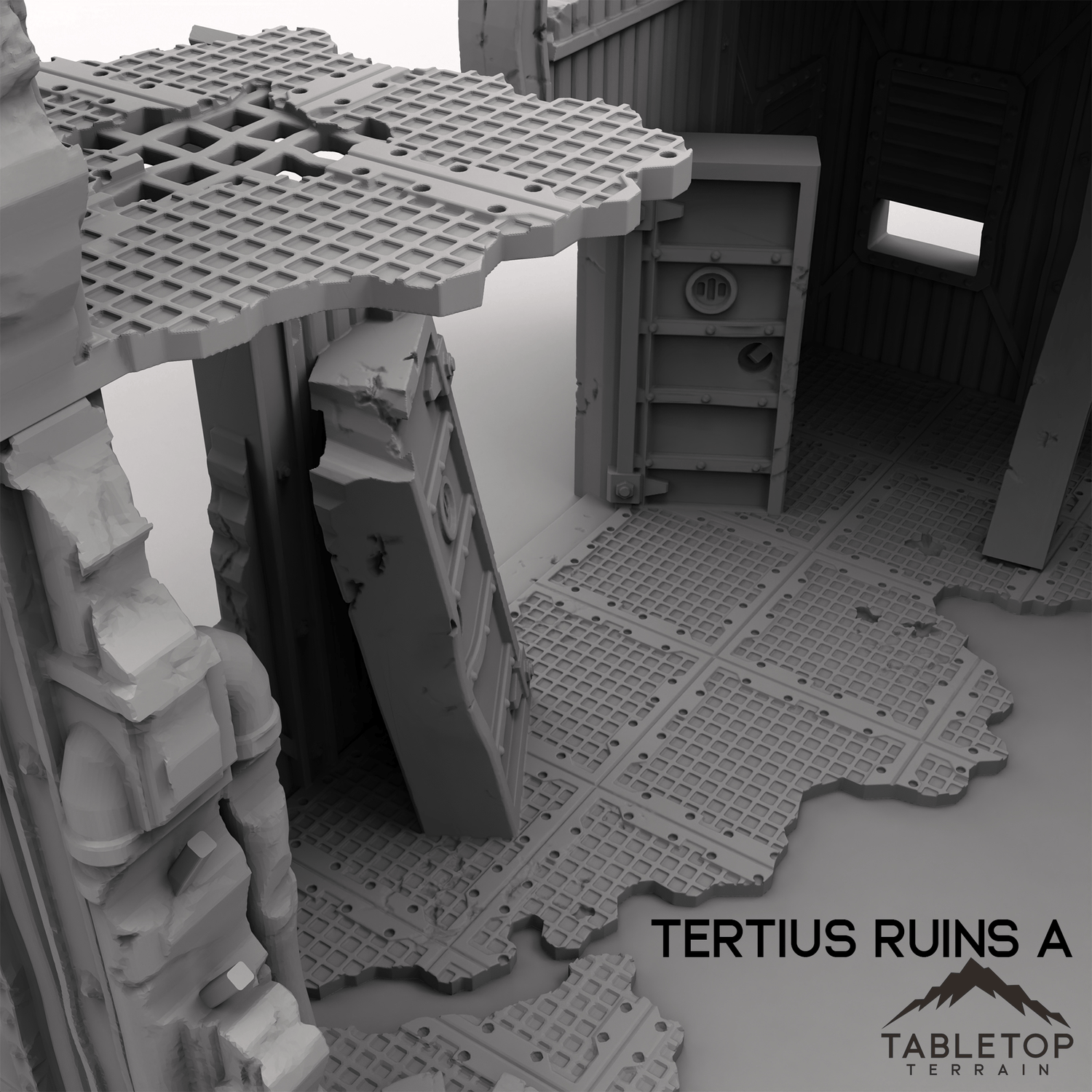 Tertius Ruins A is a set of stackable walls and corners for for grimdark and ruined scifi tabletop games. The walls and floors are all detailed and textured and are made light-weight for easier storage. The pieces have connecting holes in the underside and sit on top of each other, but glue is recommended to keep the different parts from falling over while in use.