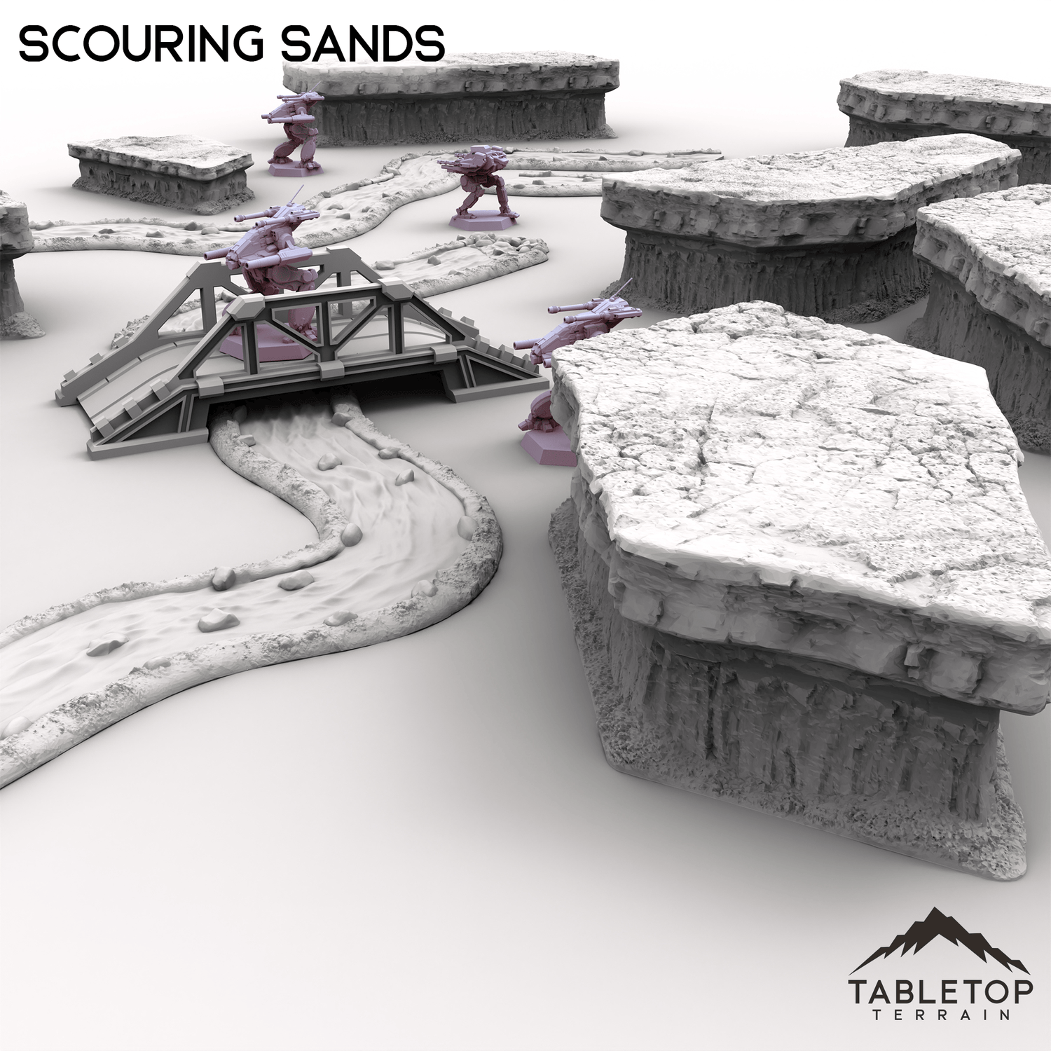 The Scouring Sands is a collection of plateaus, rivers, and a truss bridge for navigating the valley. The items are highly detailed and textured, so that the are easy to paint with varied colors and style. The rivers are full modular, with 2 end-caps provided, allowing for a long flowing path however you need it to travel.