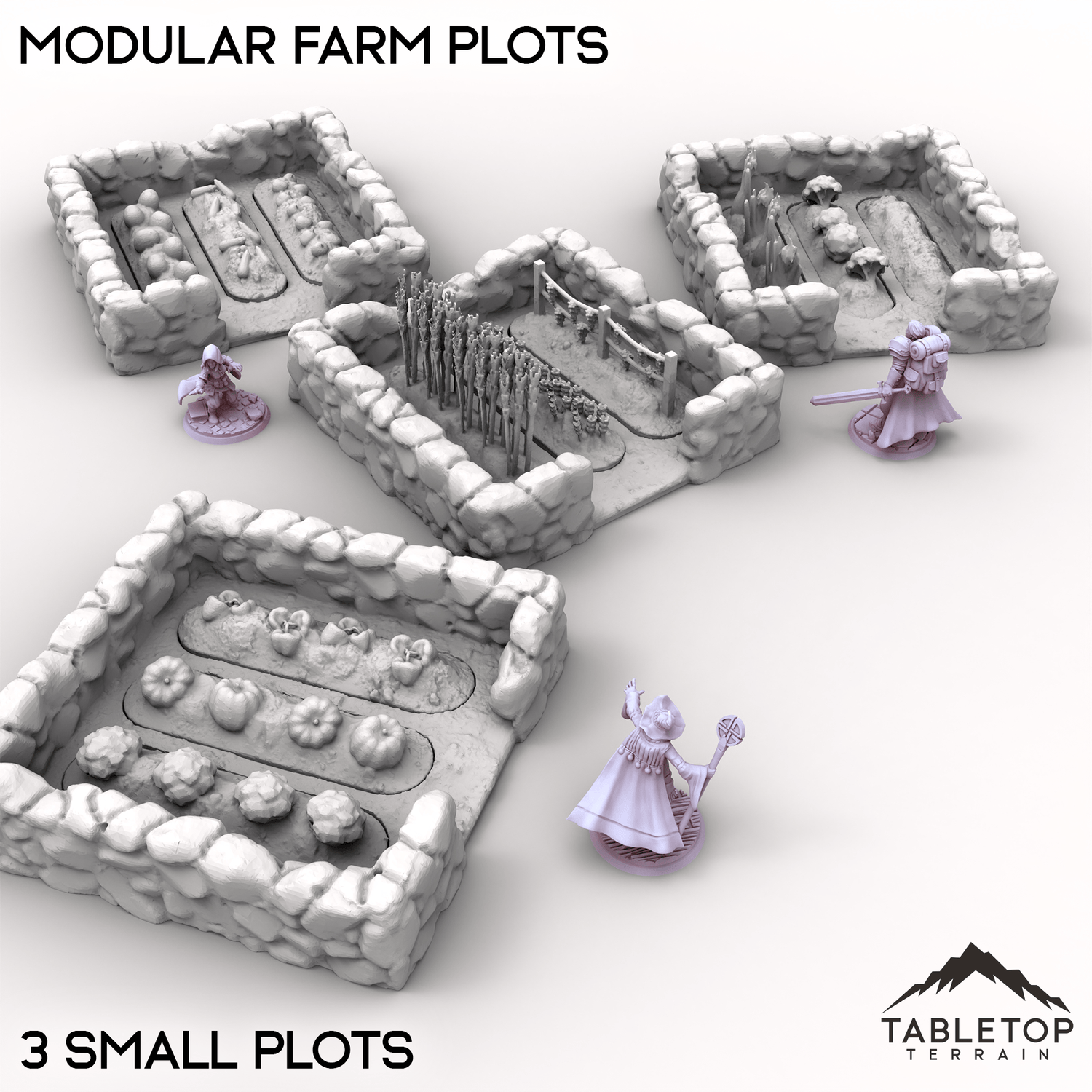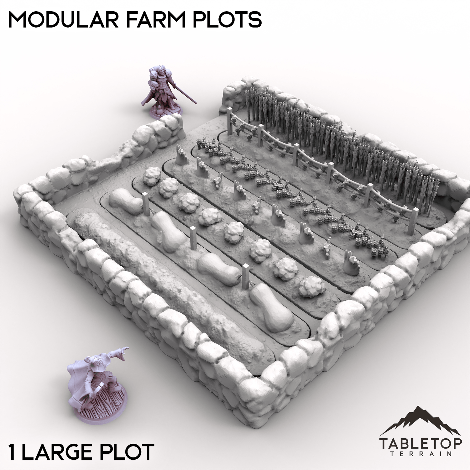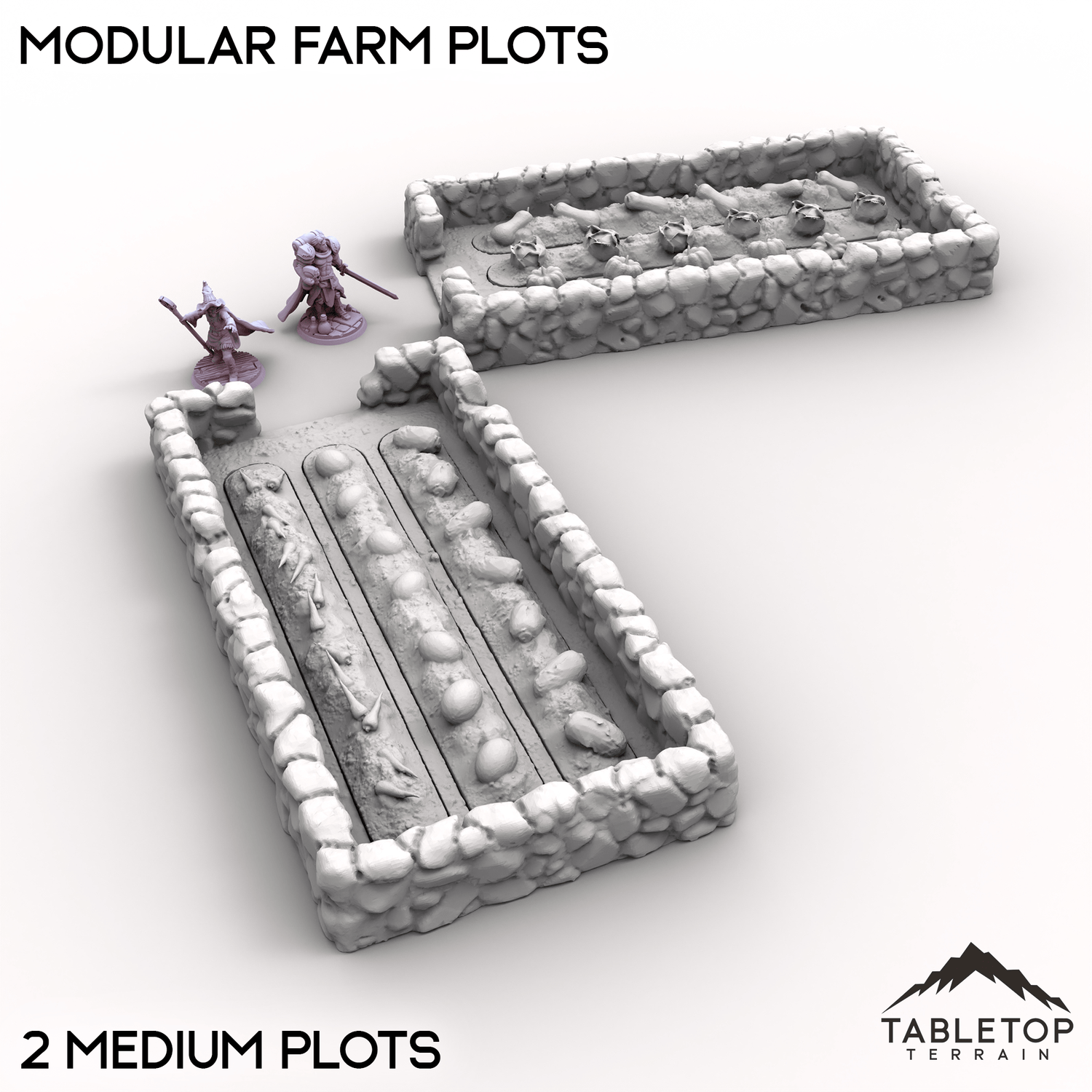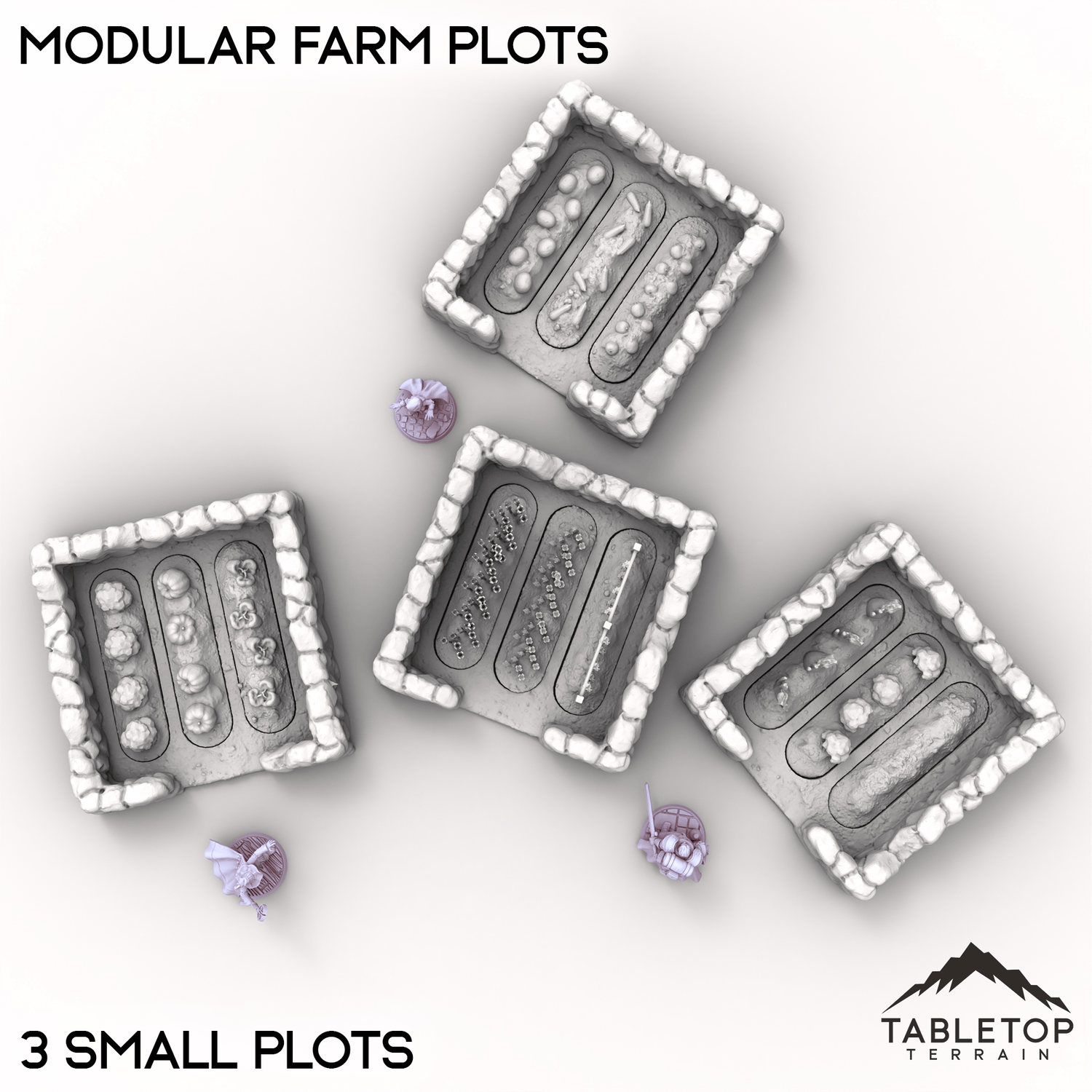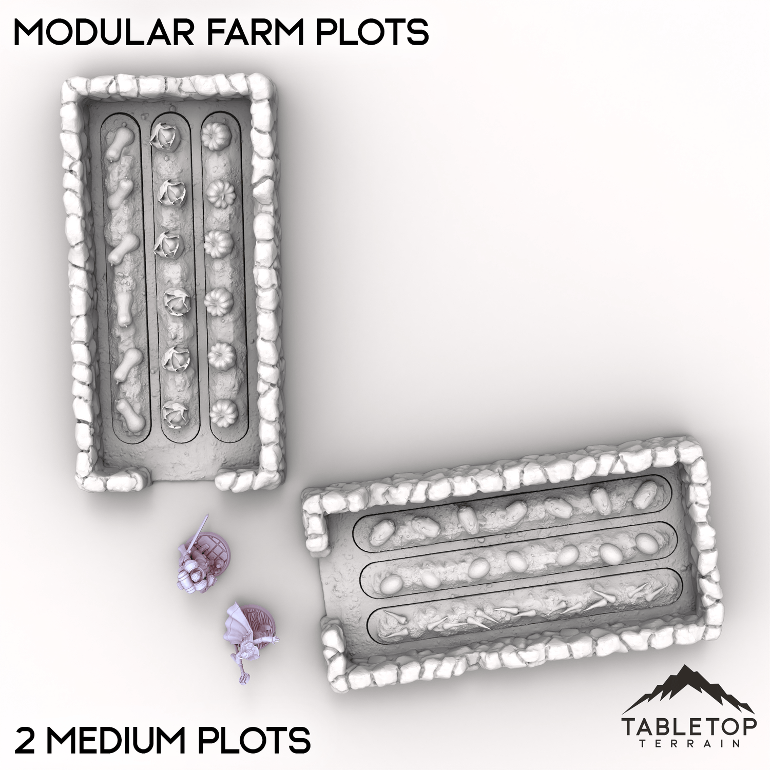 Modular Farm Plots is a set of detailed stone-bordered fields perfect for rural or village scenes. Each plot features removable crop inserts that can be swapped around to customizing your tabletop farm or settlement layout. Buy each one individually or the whole set at a discount