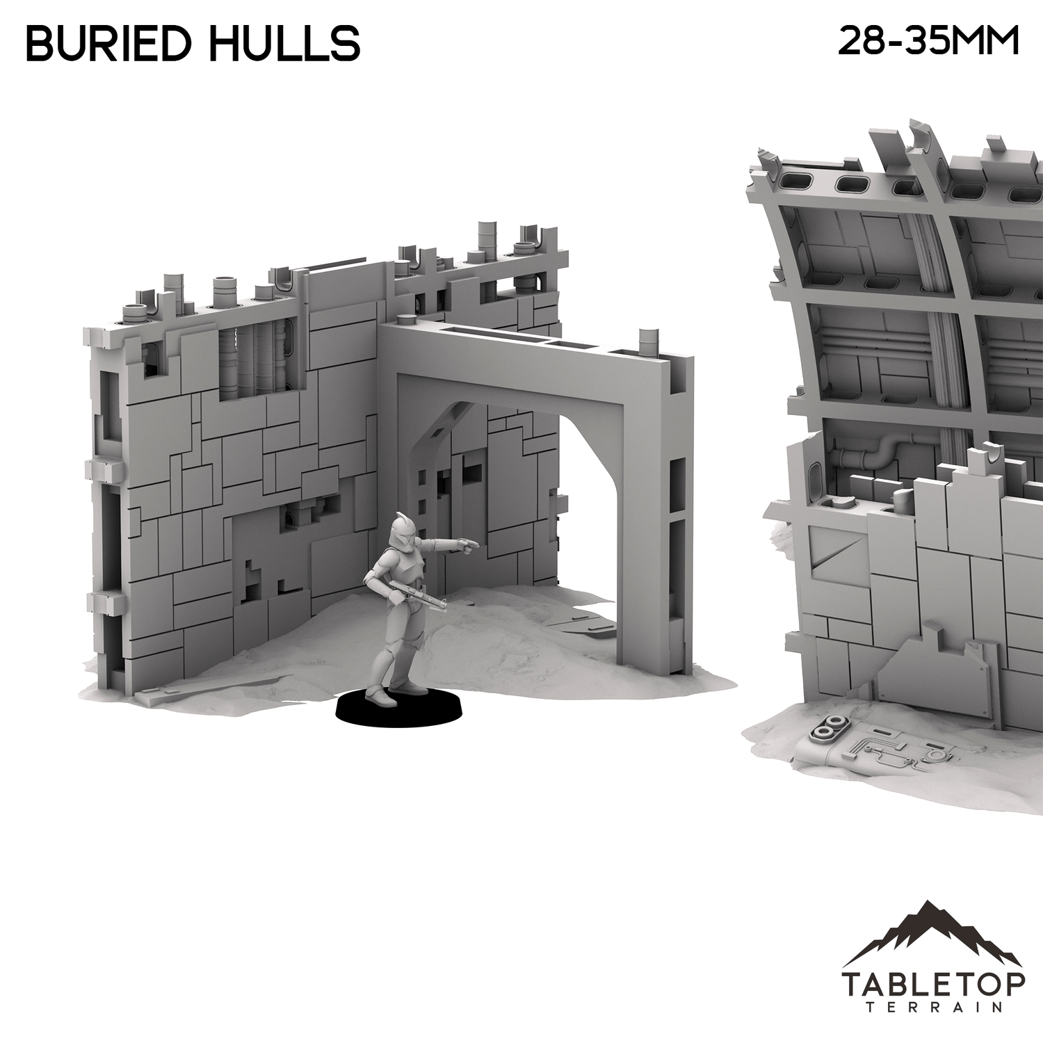 The half-buried hulls of downed spaceships provide cover during firefights on the spaceship graveyard around A Distant Outpost. Four pieces from the ruined capital ship are included. It works well with the rest of the Distant Outpost set, or as a standalone piece. Great for wargames and RPGs.