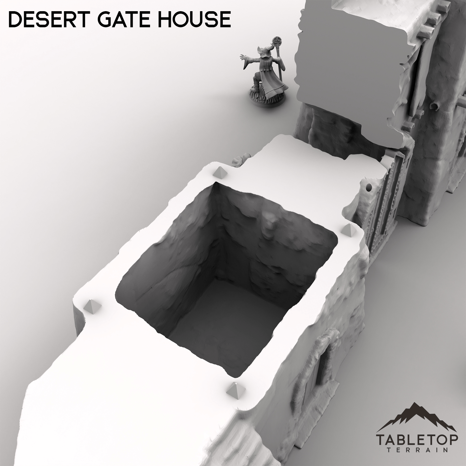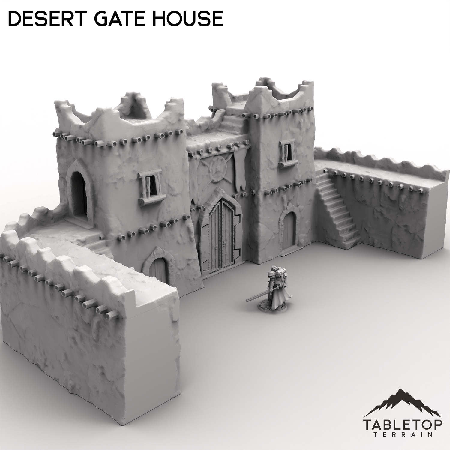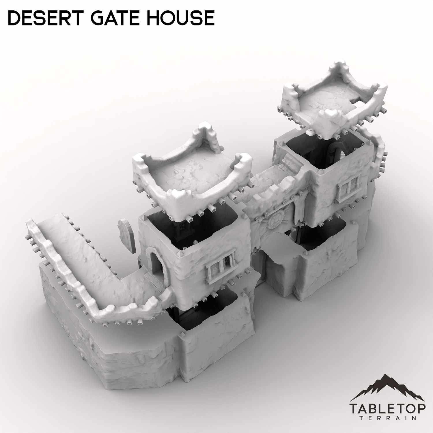The Desert Gate House is a 2-story building with thick walls that wrap around the sides, stretching out from the towers that overlook the surrounding area. Each tower has a staircase heading to it, and features an open interior with functional doors. The bottom floor of the gatehouse also features 2 small rooms for storage or simple barracks. The set is designed to be easy to paint, and simple to pack up when not in use.