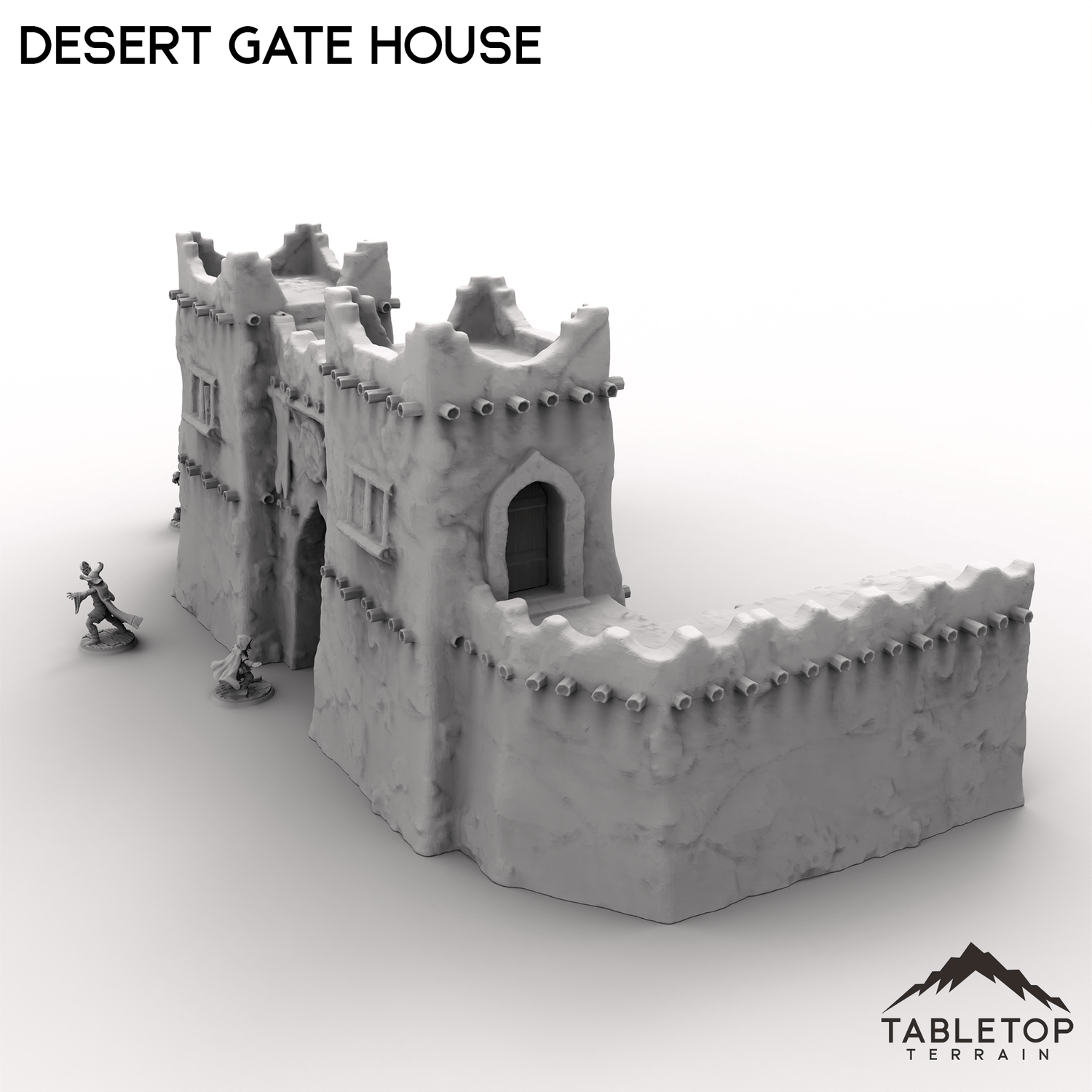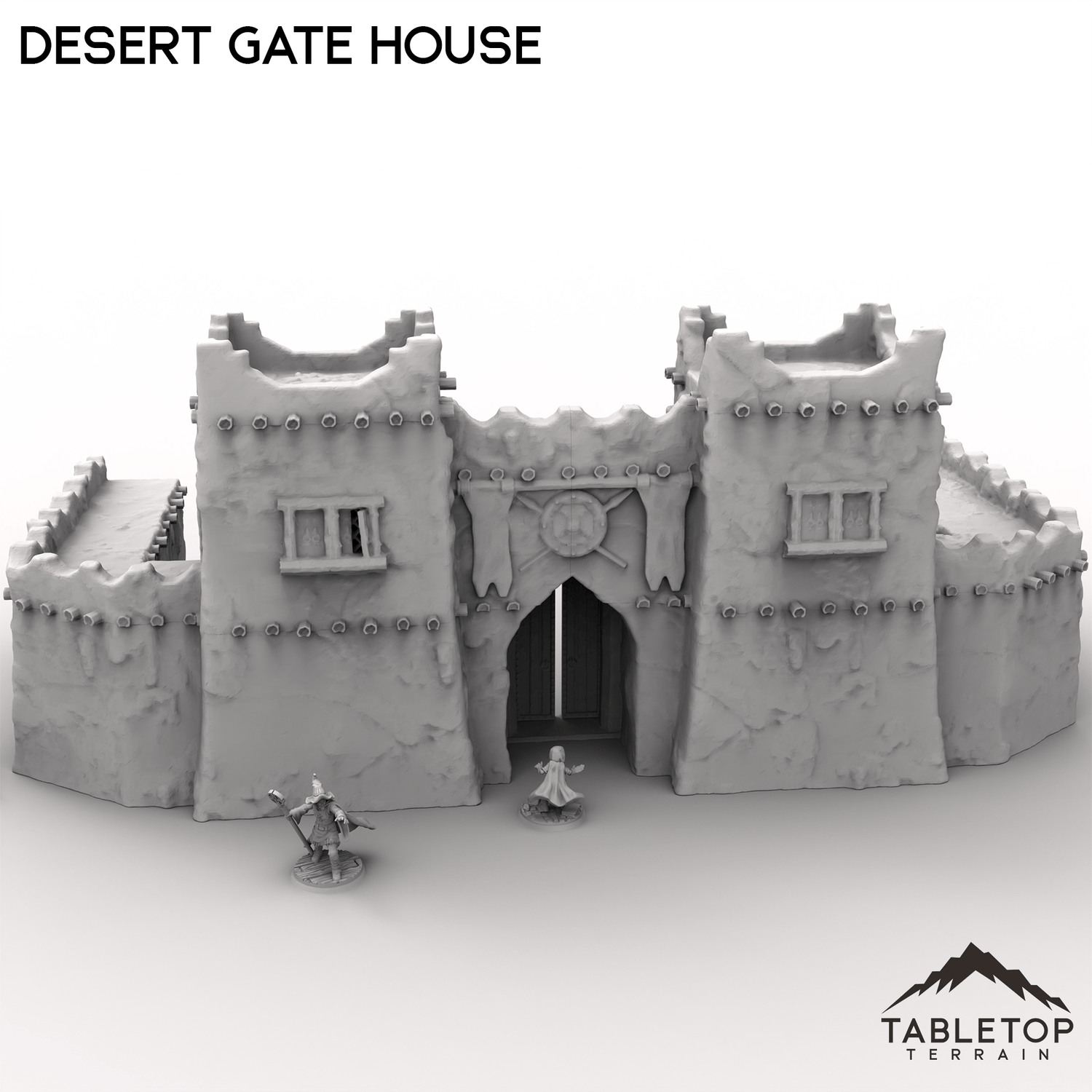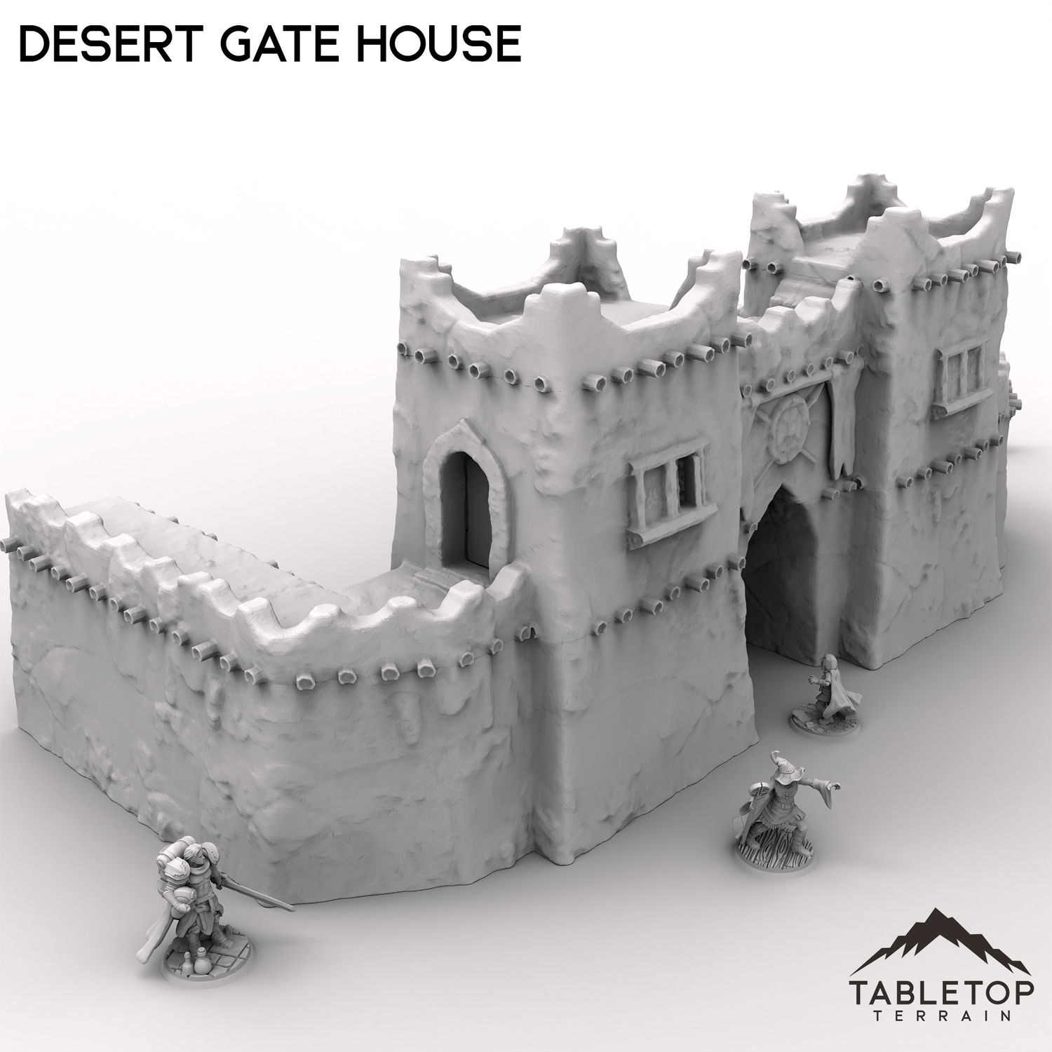 The Desert Gate House is a 2-story building with thick walls that wrap around the sides, stretching out from the towers that overlook the surrounding area. Each tower has a staircase heading to it, and features an open interior with functional doors. The bottom floor of the gatehouse also features 2 small rooms for storage or simple barracks. The set is designed to be easy to paint, and simple to pack up when not in use.