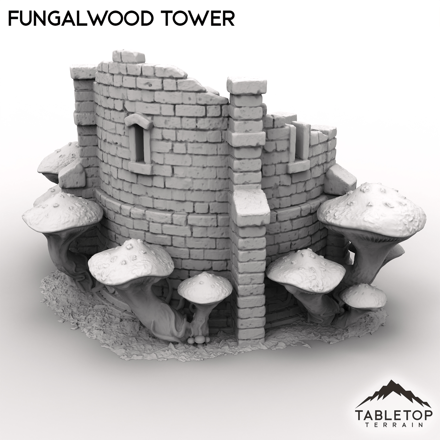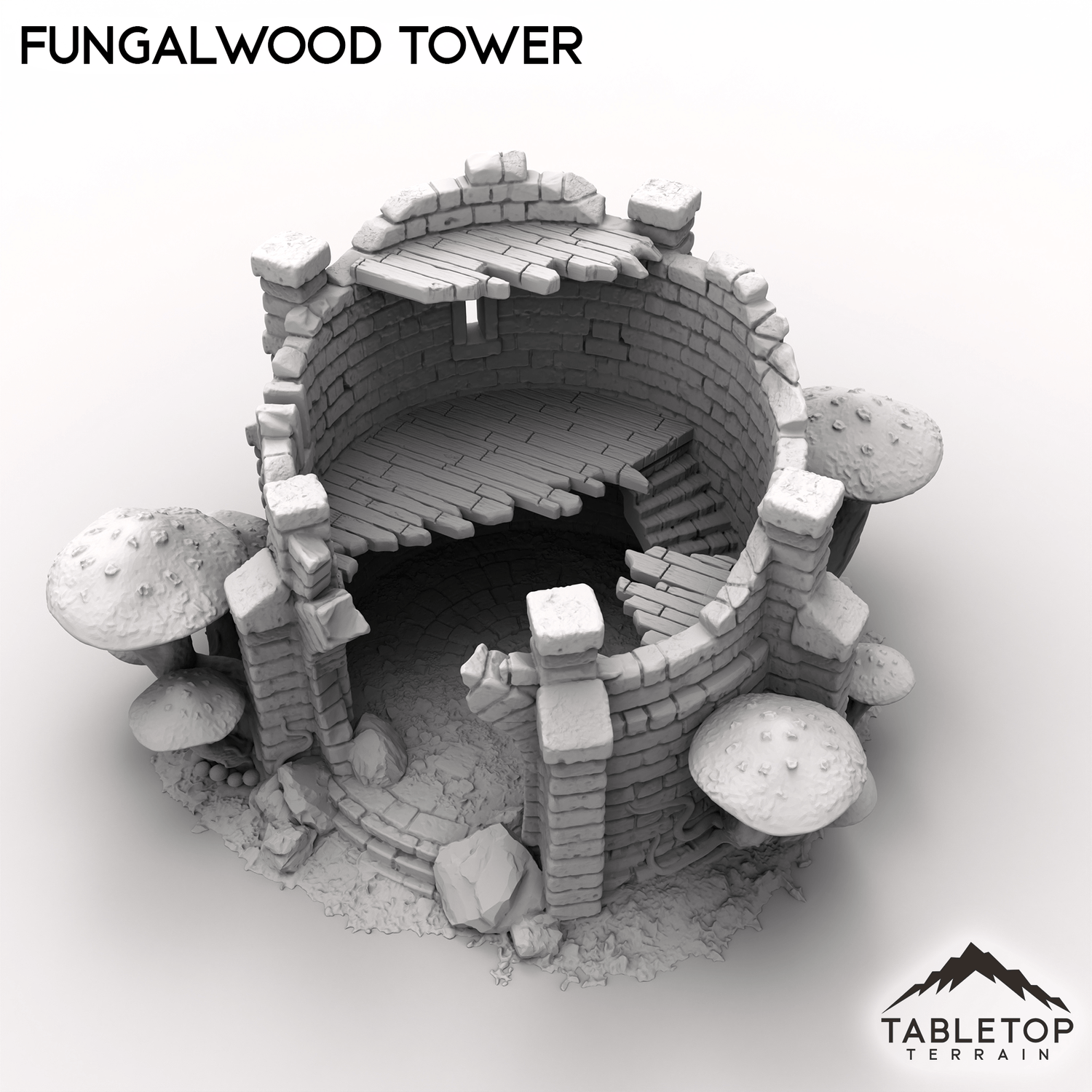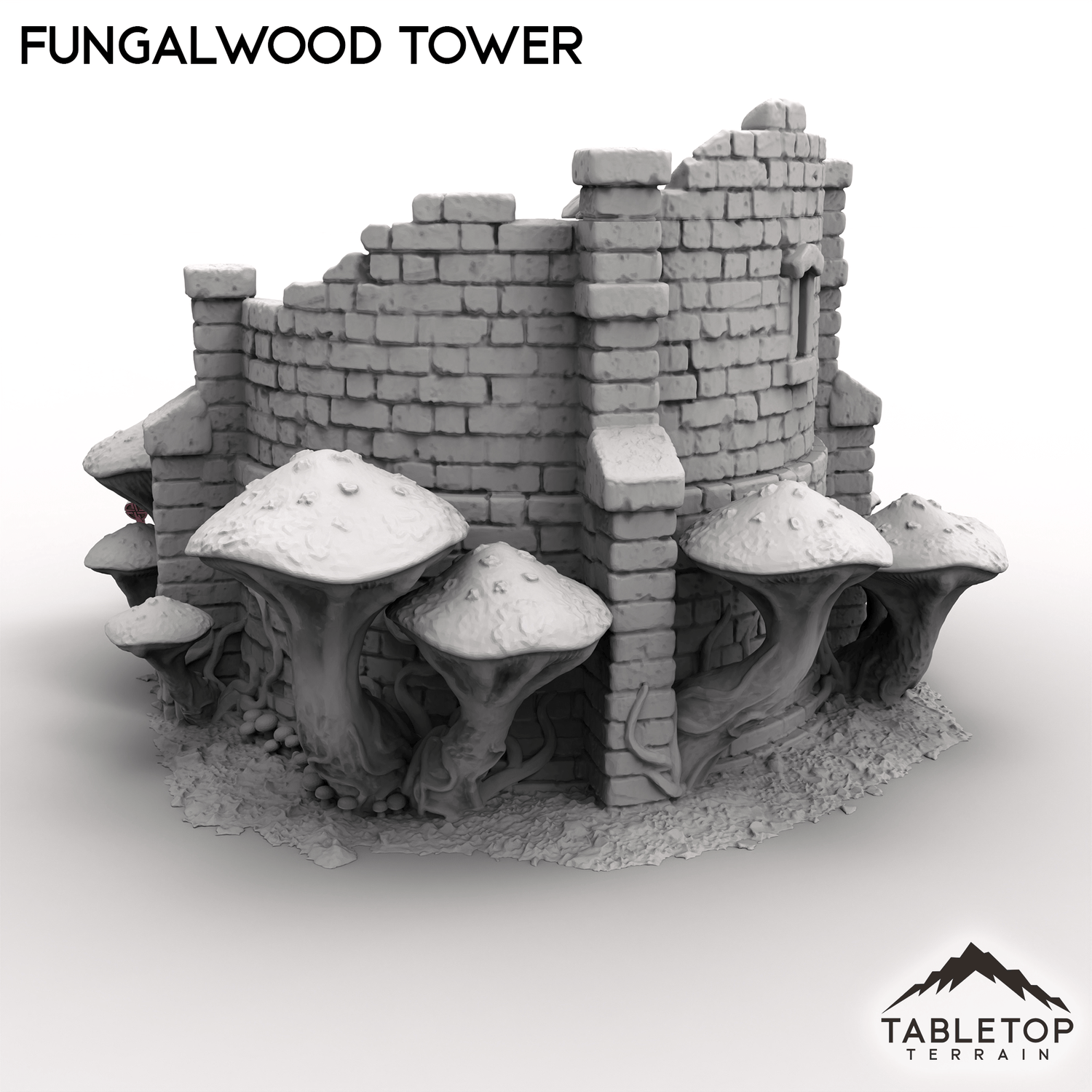 Fungalwood Tower is a ruined and dilapidated structure, slowly being taken over by nature. The Fungalwood is a dark land of magic and growth left unchecked. The sets in this collection feature giant mushrooms, ancient ruins, and winding paths for a party to explore.