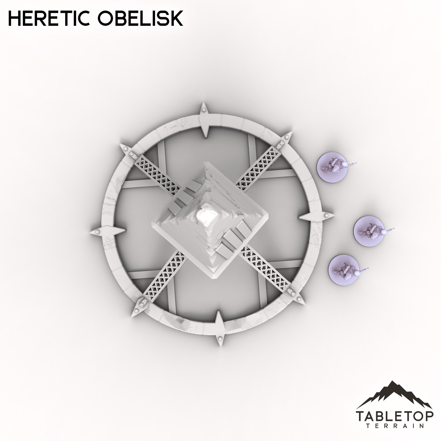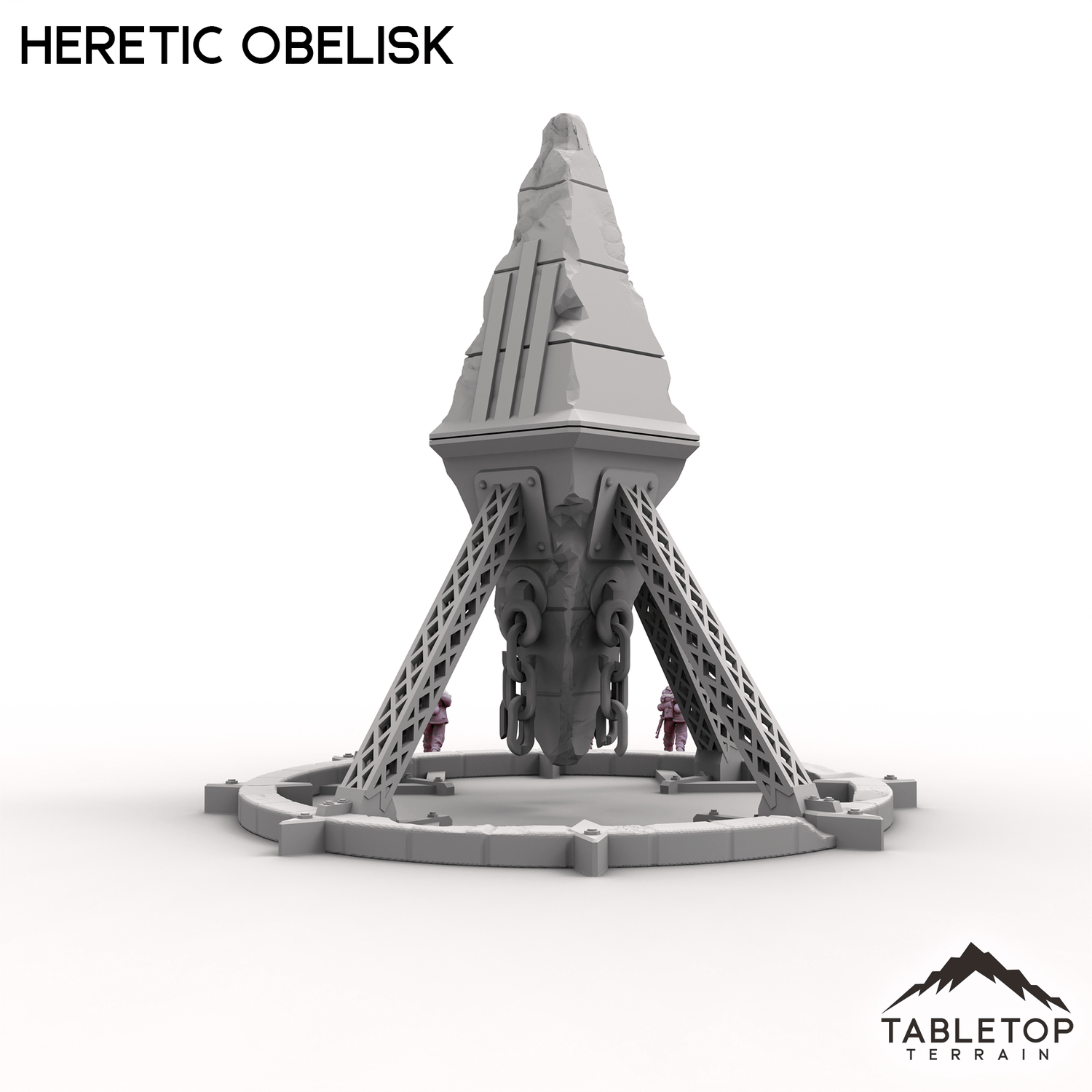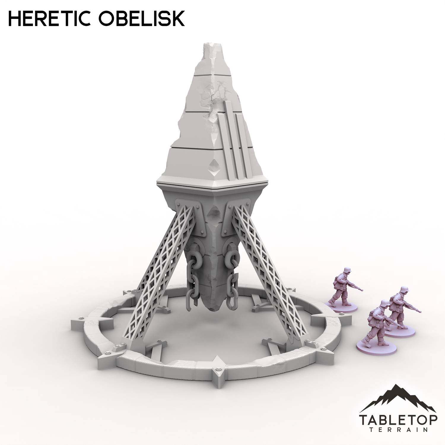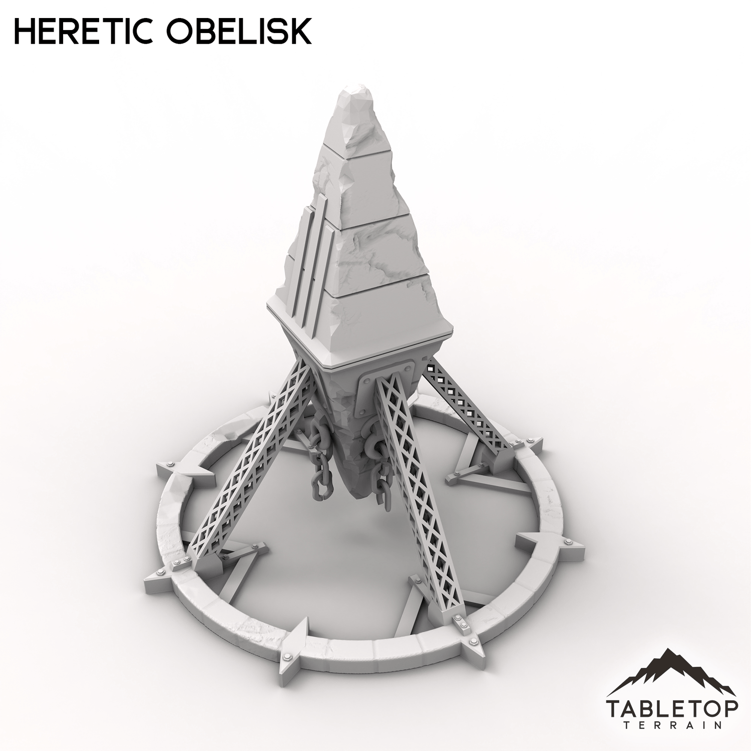 The Trench Wars Heretic Obelisk floats ominously, its cracked stone bound by chains and steel supports, radiating a sense of forbidden reverence amid the wasteland. Works well by itself as a objective or with the rest of the Trench War set.