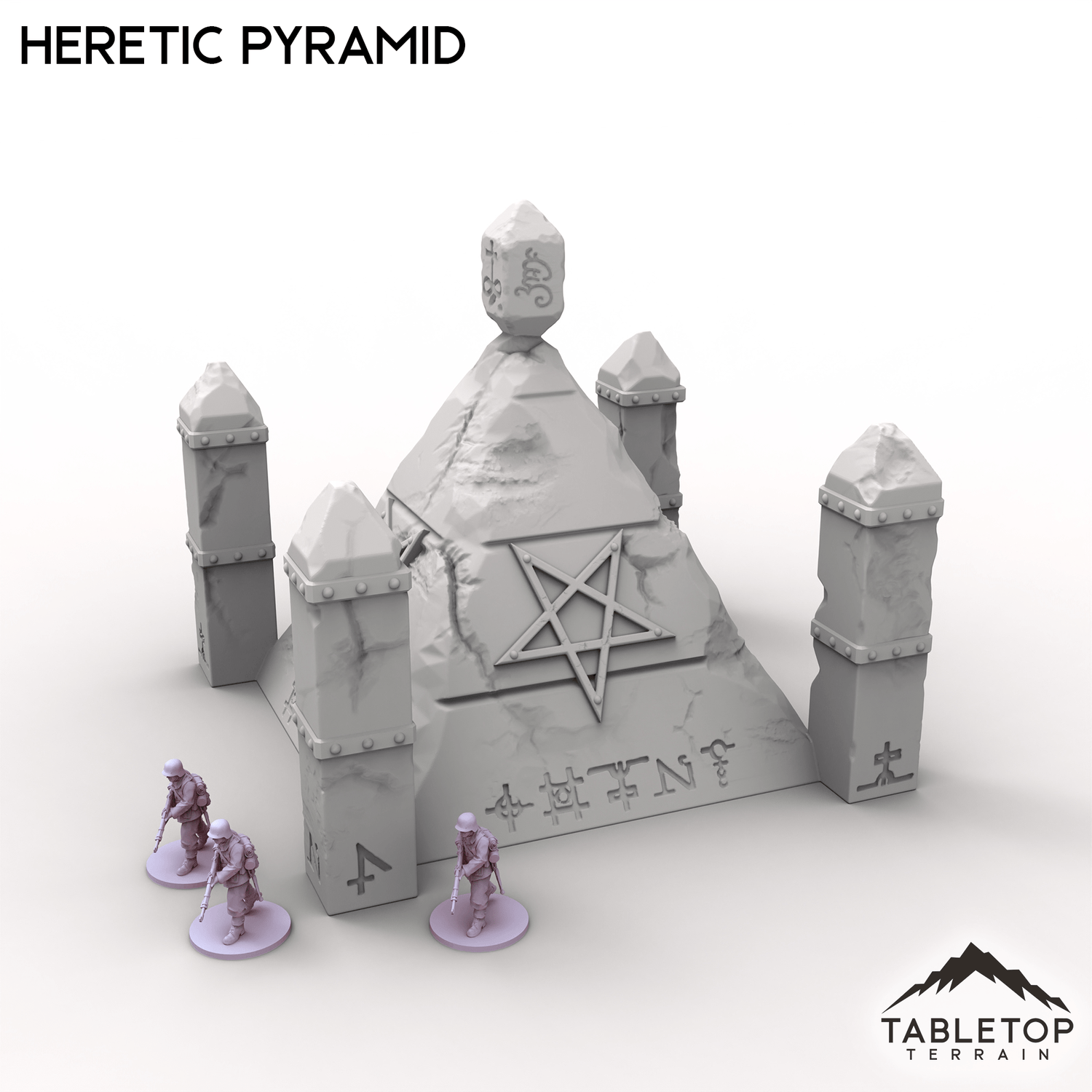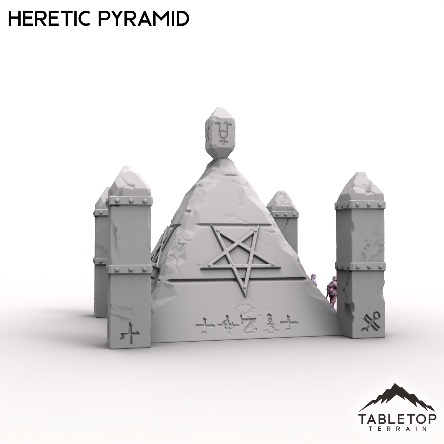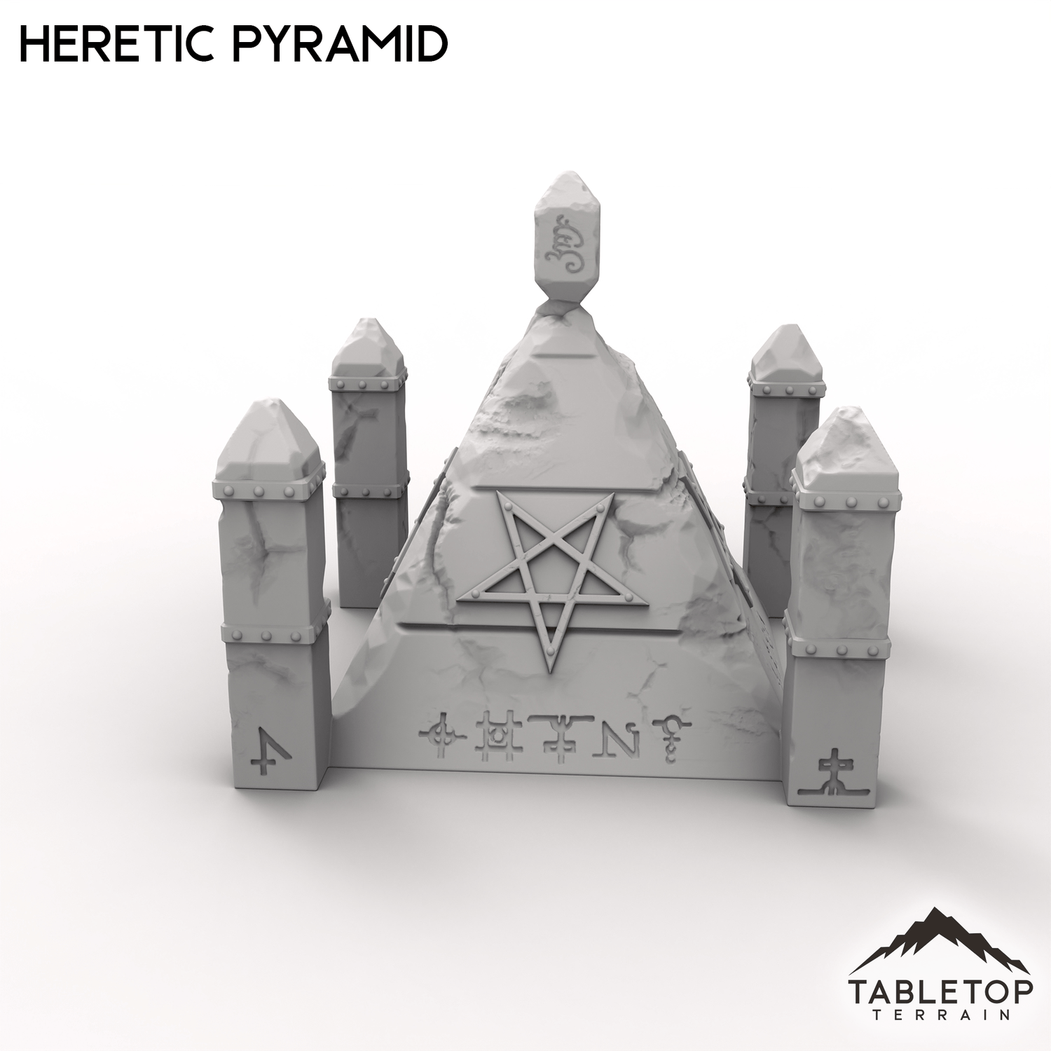 The Heretic Pyramid juts from the earth, its cracked walls etched with writhing blasphemous sigils. Four spires guard its corners, while a jagged obelisk at the peak throbs faintly with dark energy. Perfect as an objective by itself or used with the rest of the Trench Wars set.