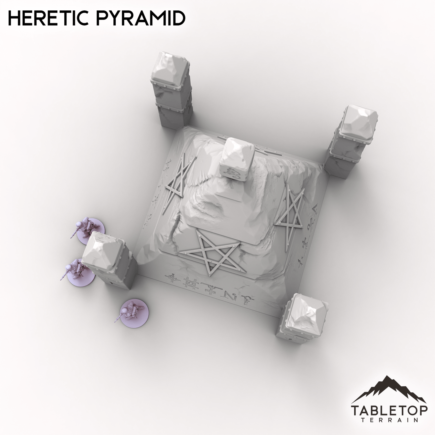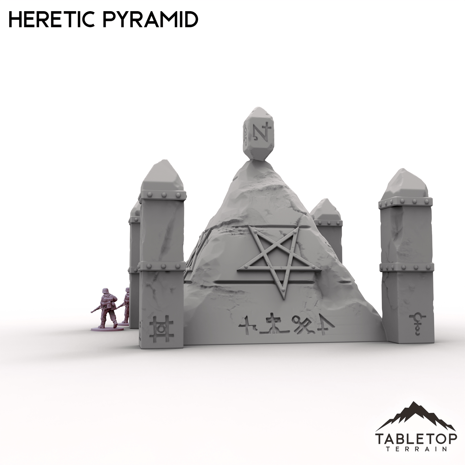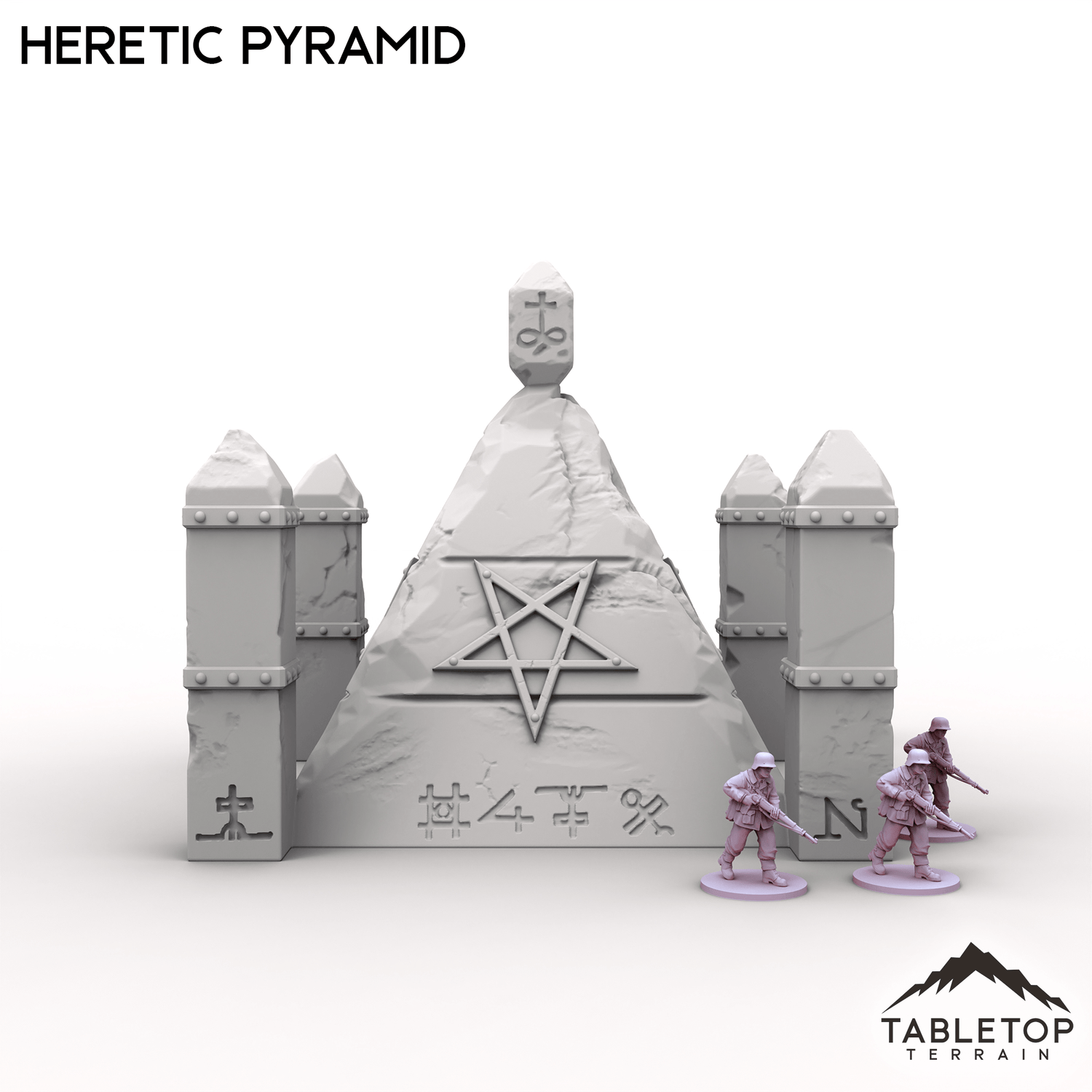 The Heretic Pyramid juts from the earth, its cracked walls etched with writhing blasphemous sigils. Four spires guard its corners, while a jagged obelisk at the peak throbs faintly with dark energy. Perfect as an objective by itself or used with the rest of the Trench Wars set.