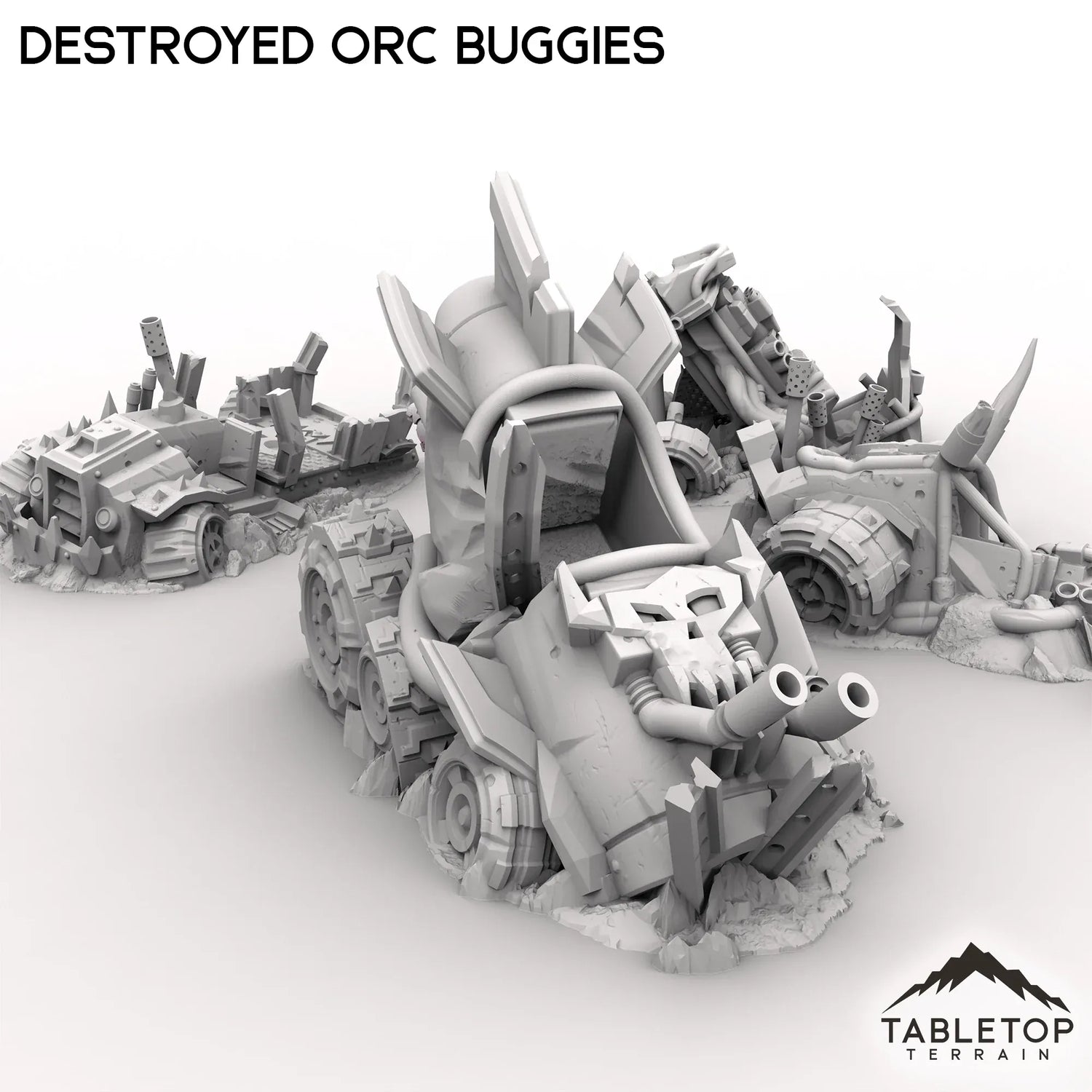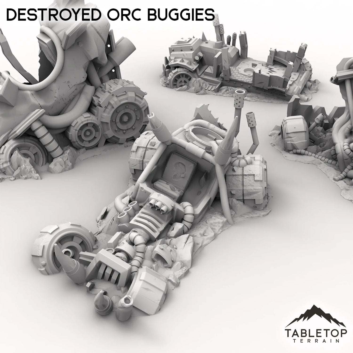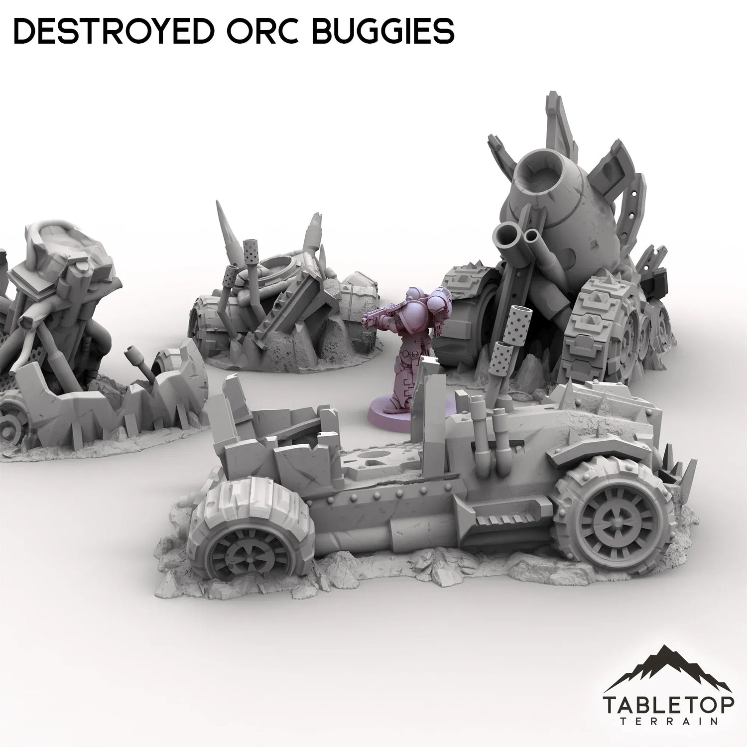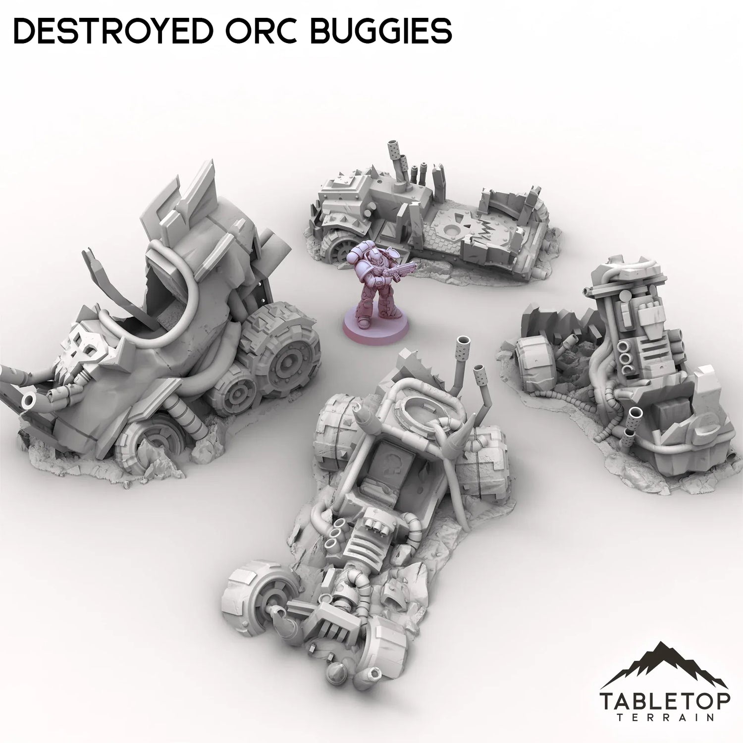 These Destroyed Orc Buggies lie mangled and half-buried in debris. Twisted armor plates and bent axles show the chaos of war while providing good cover and tell a intriguing narrative.