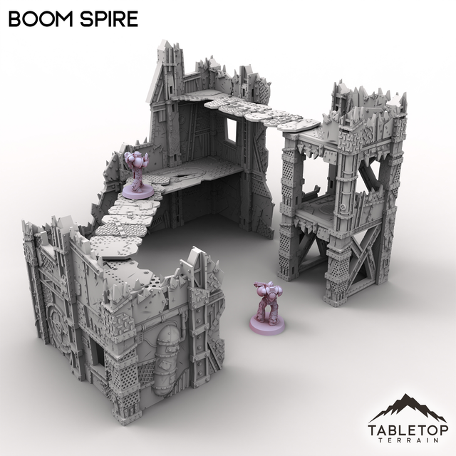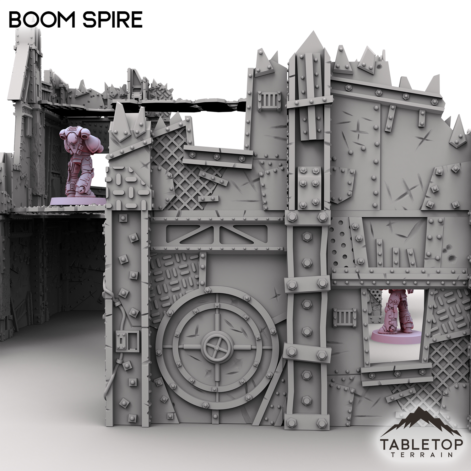 The Boom Spire rises from the wasteland in a chaotic tangle of three scrap towers linked by rickety walkways. It looks ready to collapse at any moment, a testament to Orky engineering held together by luck.