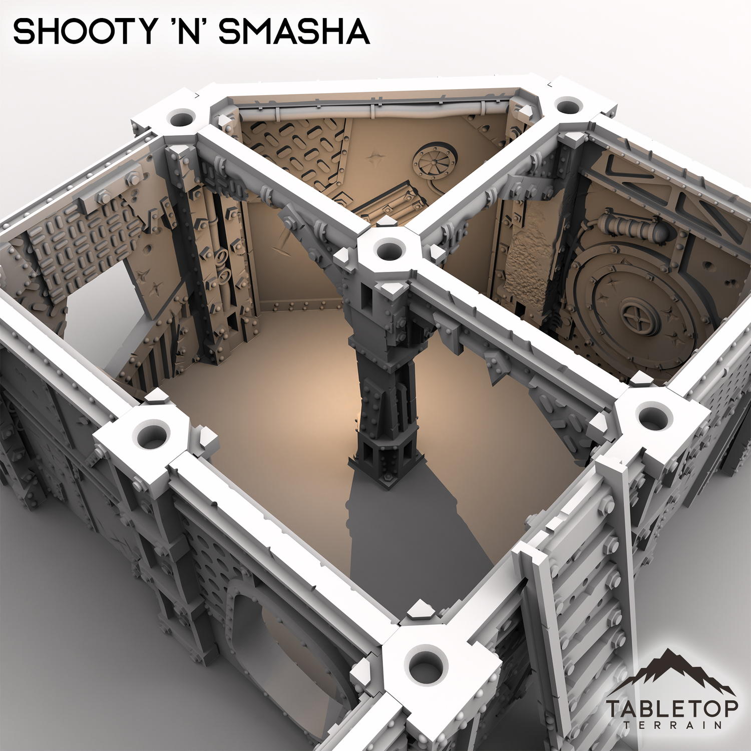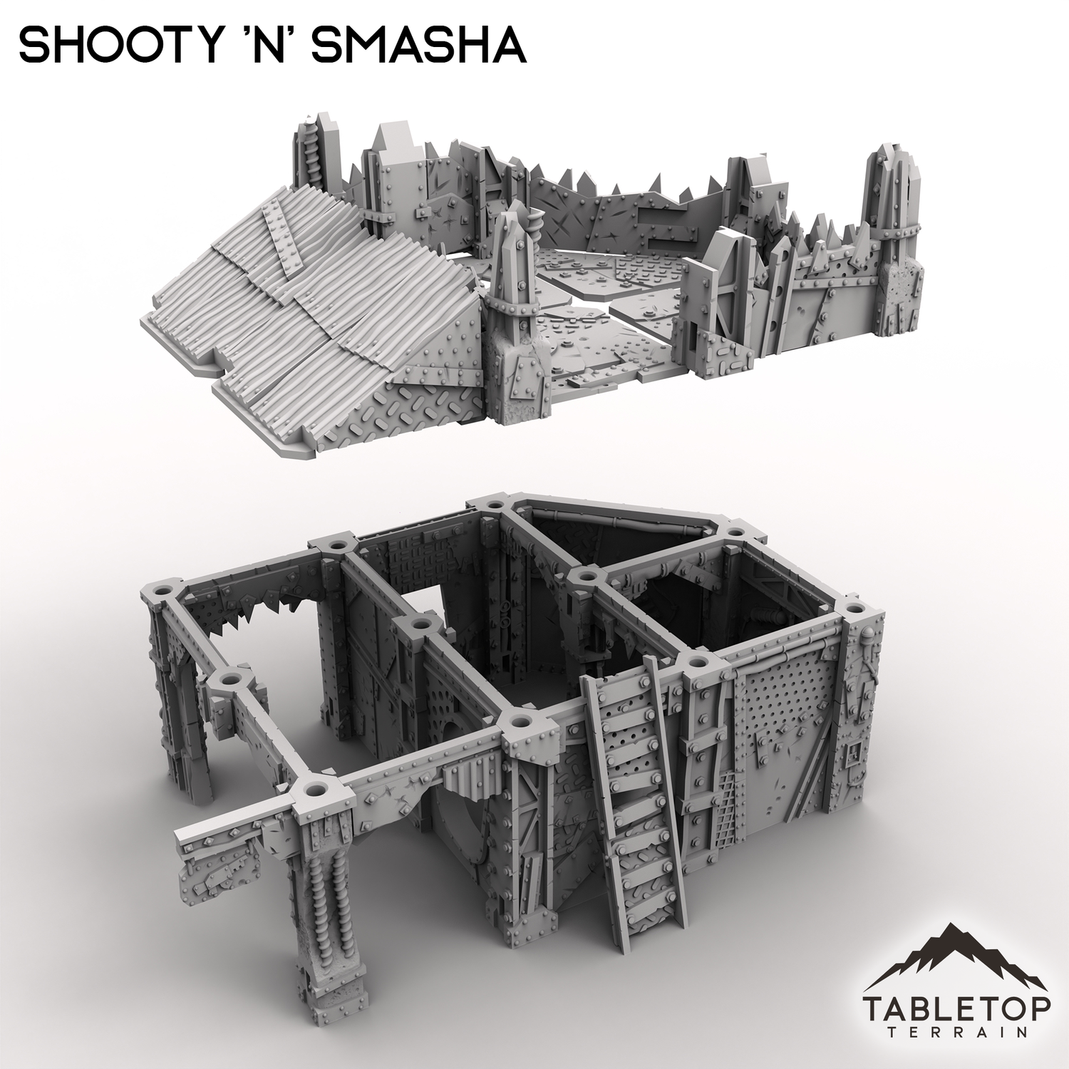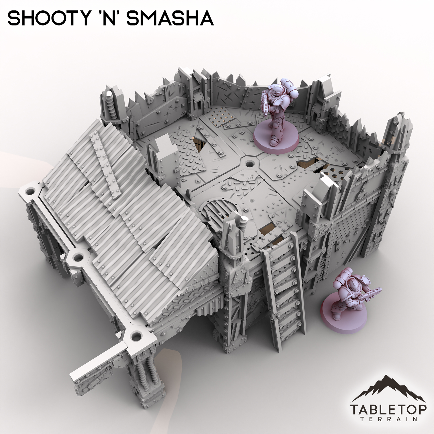 Shoot ’n Smasha is a orky fortification built from scavenged metal and riveted scrap. The front half features a jagged roof of corrugated plating, while the upper section forms a spiked parapet for defending gunners.
