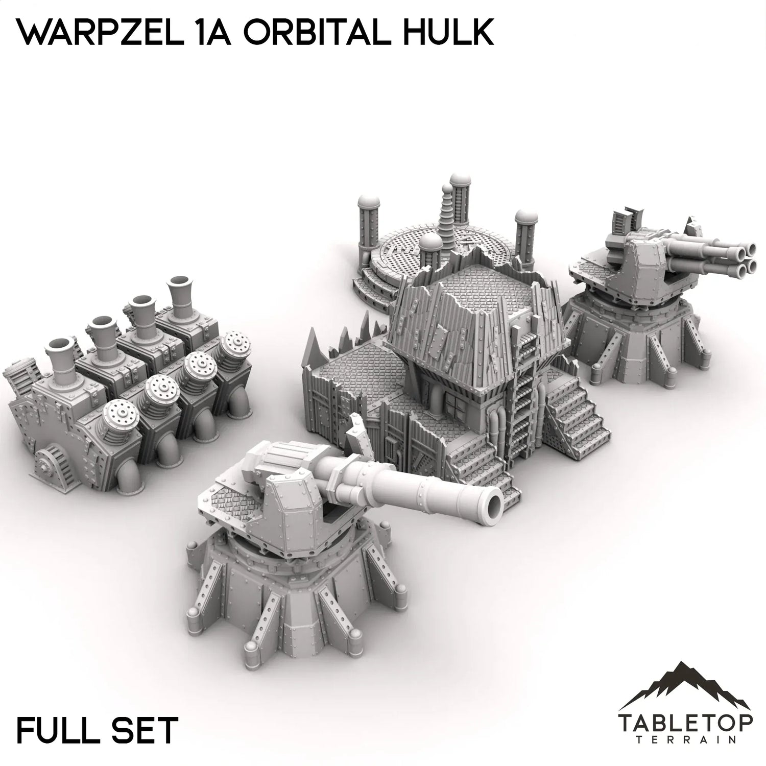 Venture into a distinctive Orkish spaceship with the "Warpzel 1A Orbital Hulk" set. This set includes a command bridge with an elevated platform, massive cannon emplacements, complicated engine mechanisms and a teleport platform. This Orbital Hulk offers a mysterious and atmospheric setting for harrowing adventures and intense strategic gameplay in your sci-fi tabletop games.