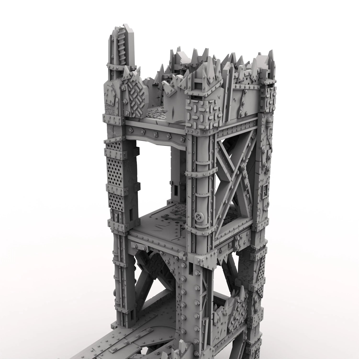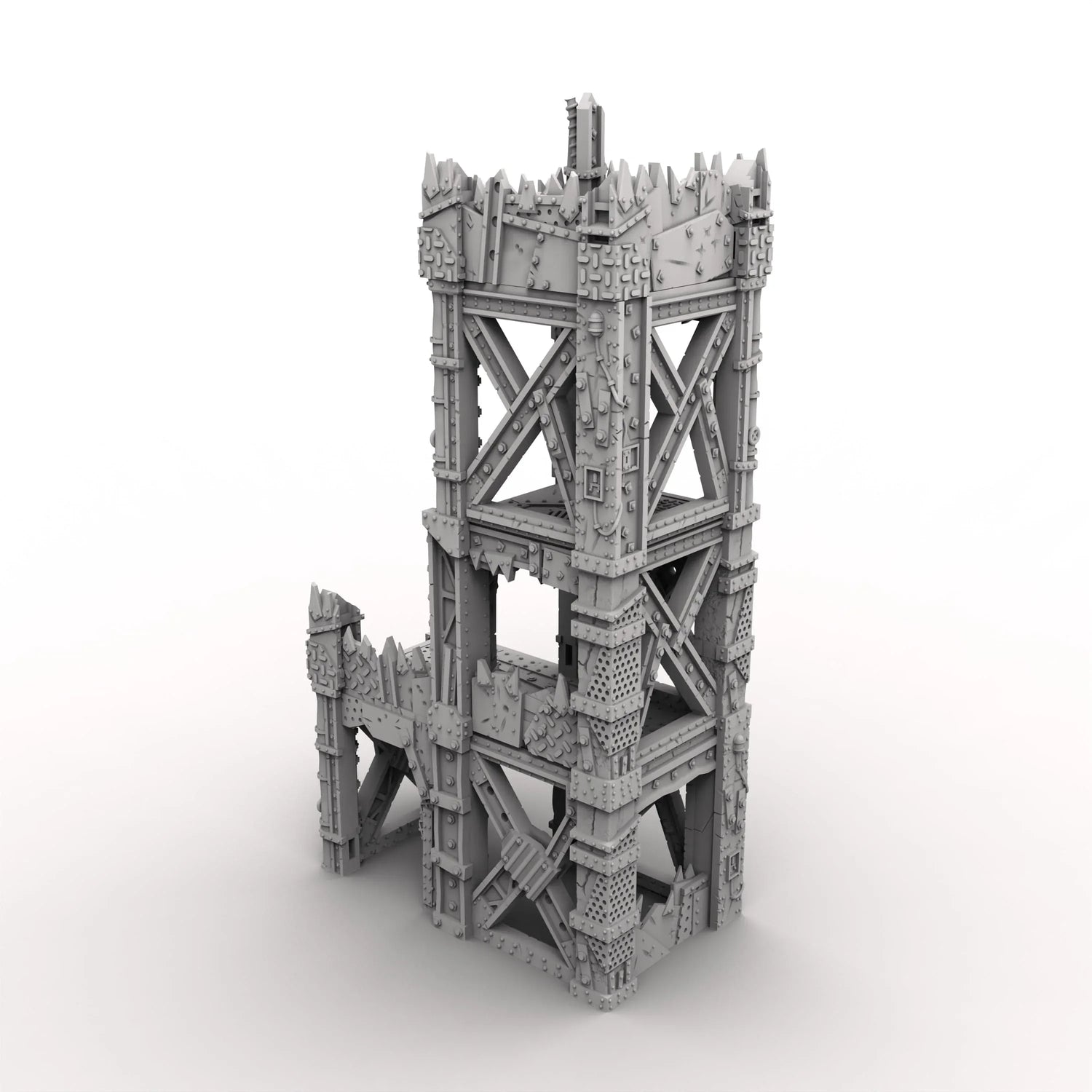 The Watcha Tower rises high on crude metal beams and uneven plating, each level stacked with scrappy orkish bits . Its jagged edges and crooked supports make it look ready to topple at any moment.