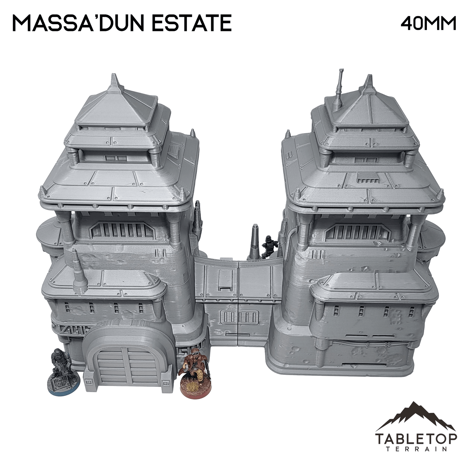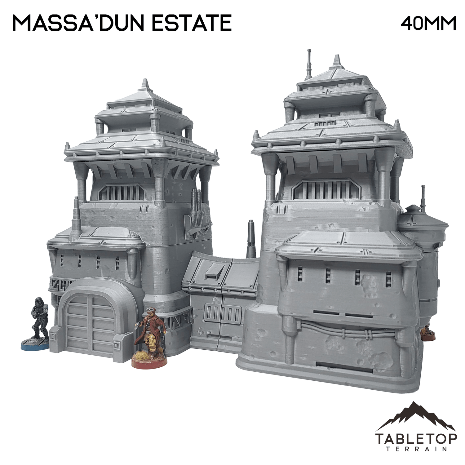 The Estate is an Outer Rim styled building featuring two tall towers, a removable roof and detailed interior. The building is printed in 40mm, 28-35mm (1:47), 20mm, and 15mm scale. We recommend the 40mm scale for Shatterpoint and the 28-35mm (1:47) scale for Legion.