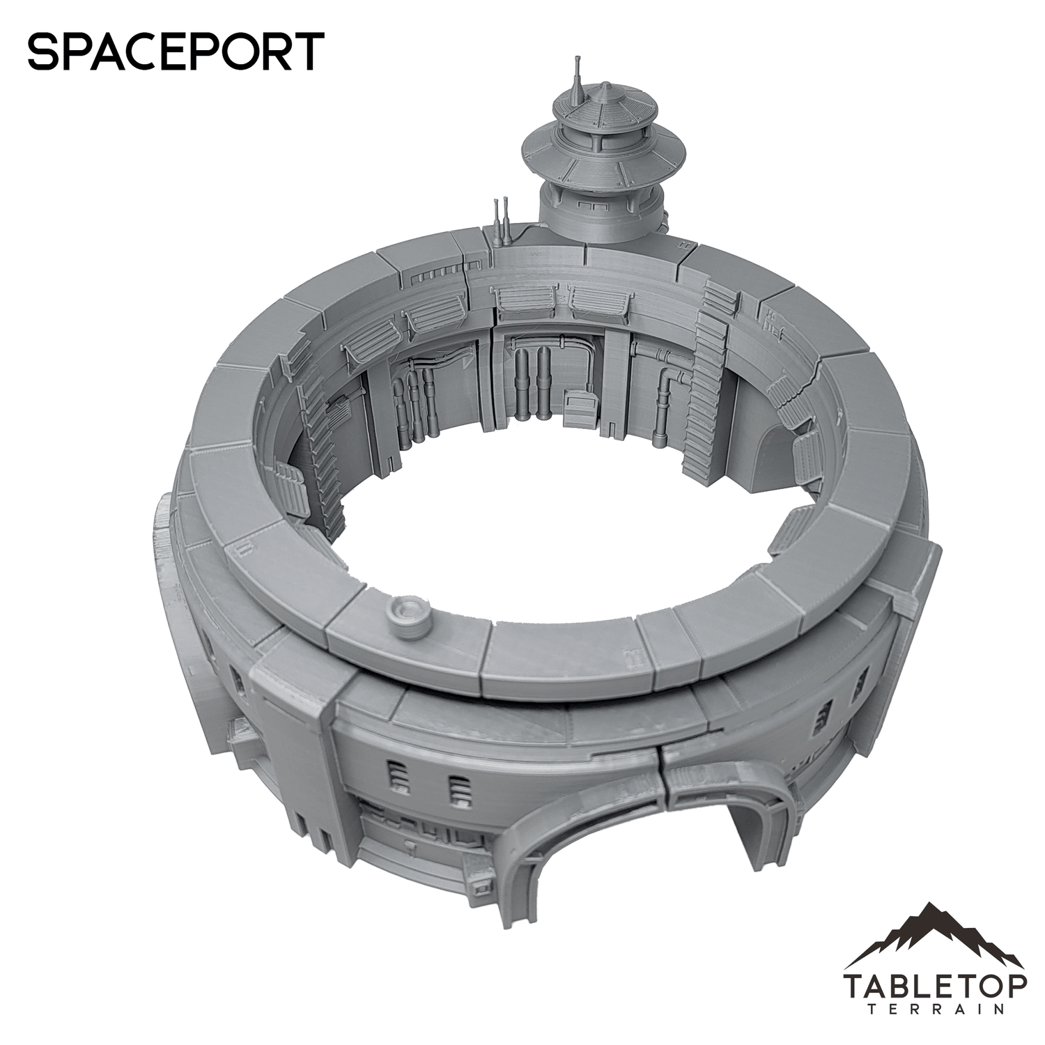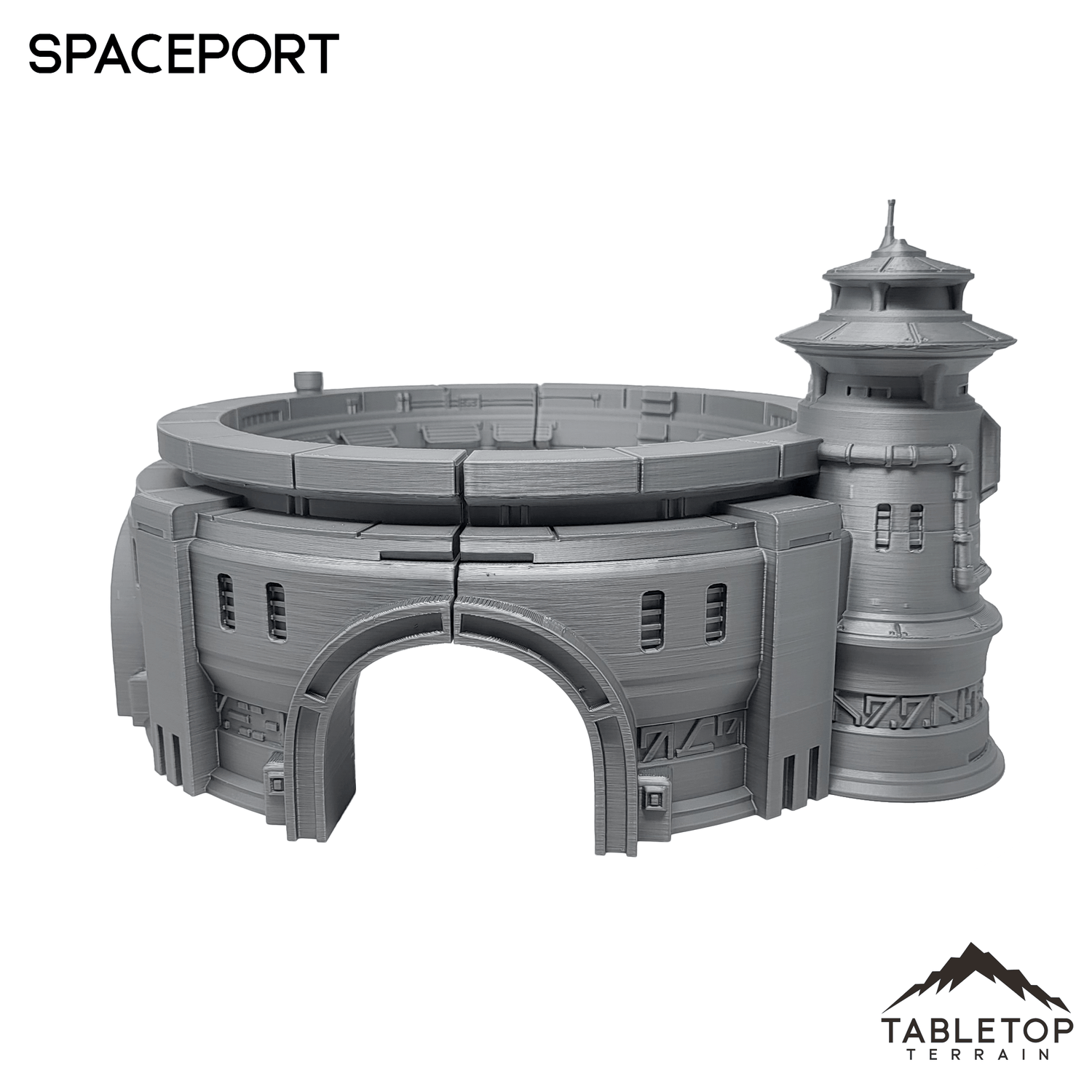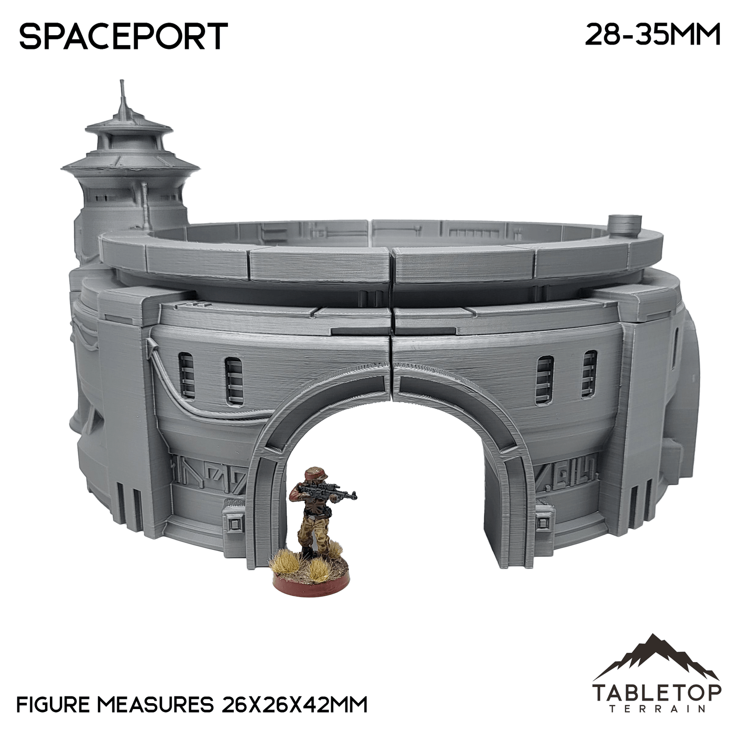 The Massa'Dun Spaceport is an Outer Rim styled spaceport featuring a tall command tower and interior space for landing. The Spaceport is printed in 40mm, 28-35mm (1:47), 20mm, and 15mm scale. We recommend the 40mm scale for Shatterpoint and the 28-35mm (1:47) scale for Legion.