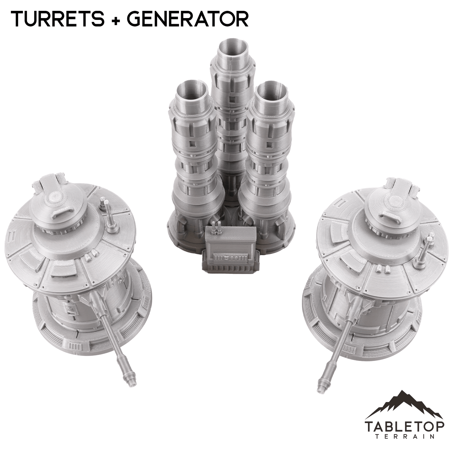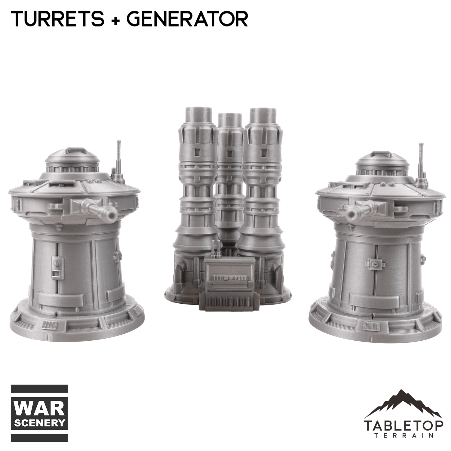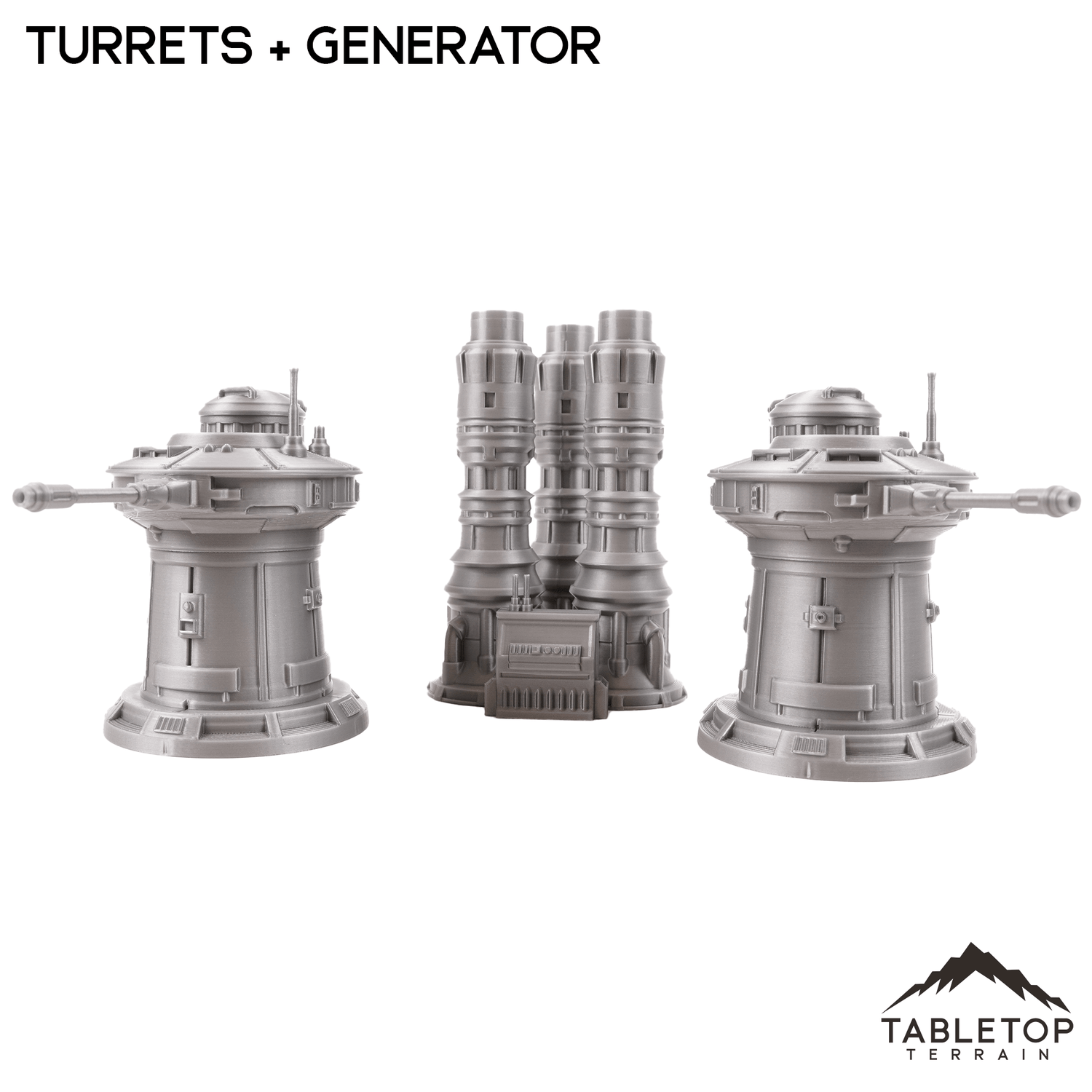 The Massa'Dun Turrets and Generator set is an Outer Rim styled terrain set featuring two Turrets and one Generator to power them. The set is printed in 40mm, 28-35mm (1:47), 20mm, and 15mm scale. We recommend the 40mm scale for Shatterpoint and the 28-35mm (1:47) scale for Legion.