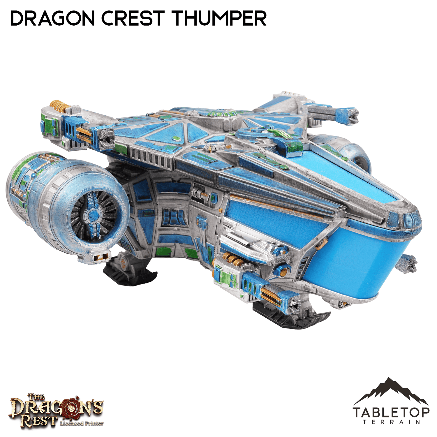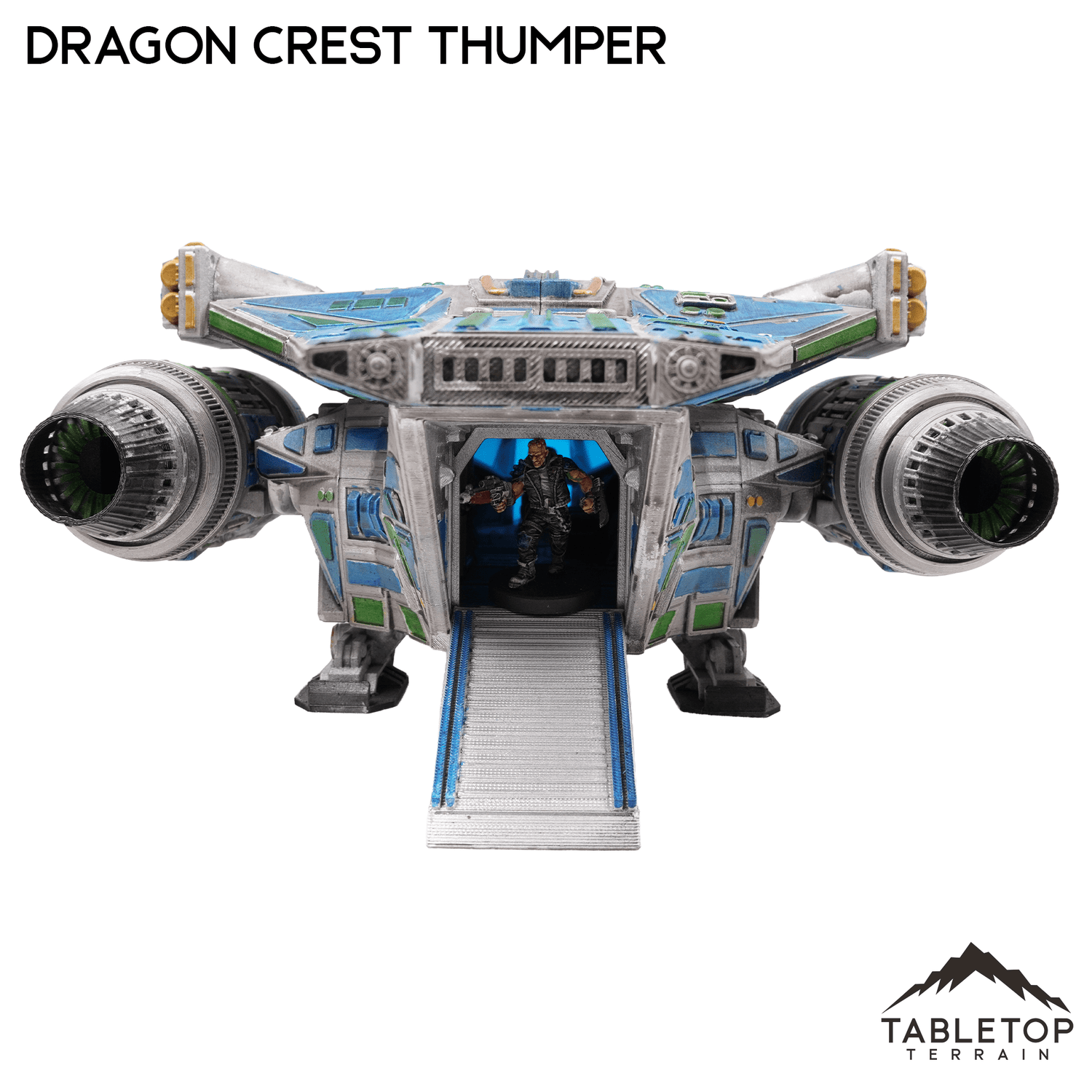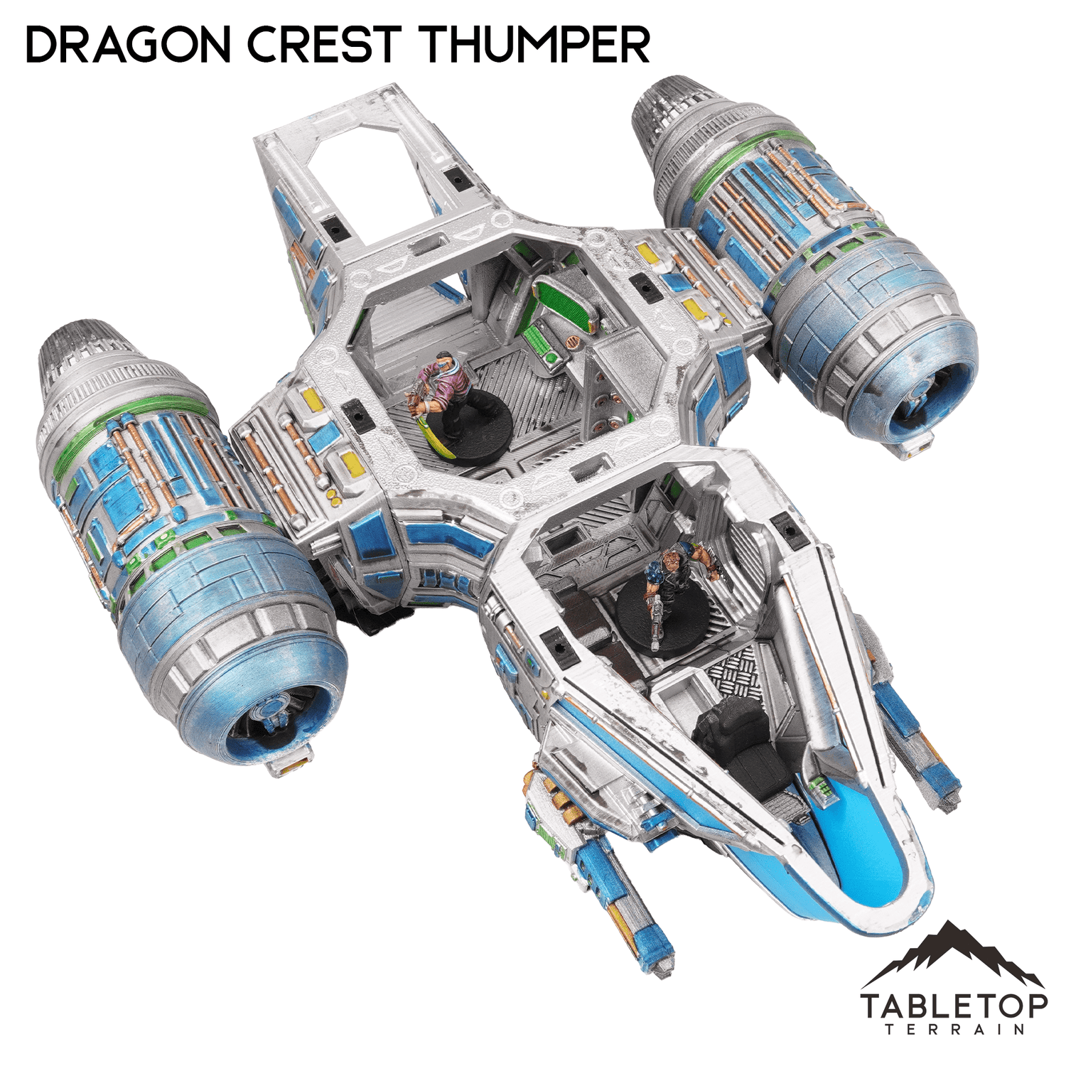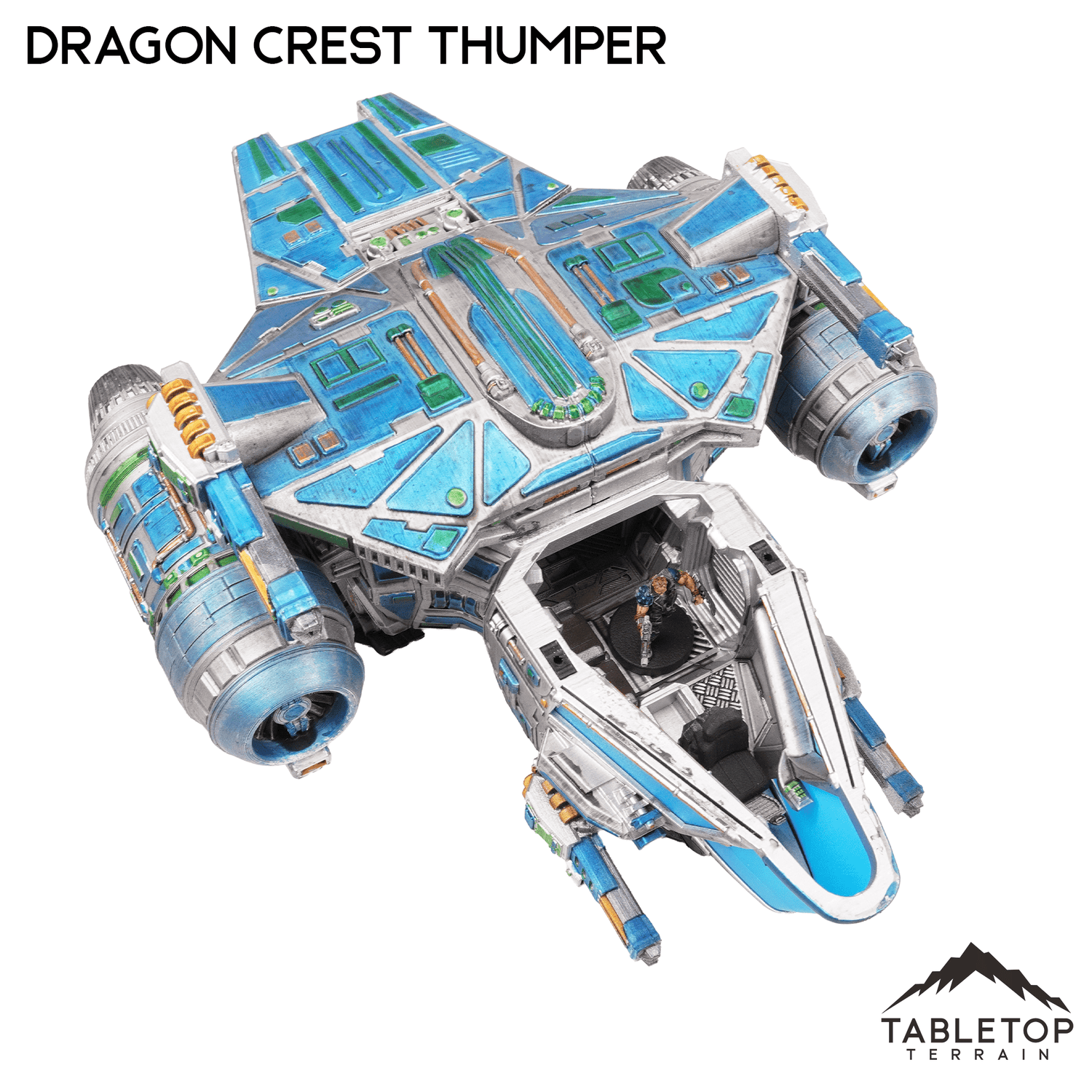 A heavier variant of the famous Dragon Crest ship, the Dragon Crest Thumper is designed with more armor, more guns, and a thicker profile. Swing open the fully functional access ramp or cockpit door leading inside, and you can see the cockpit holds spare seating next to the pilot's chair as well as wall-mounted cargo and a small scanning station. As with the other ships in this collection, the window-frame pieces are printed in a strong orange color to give the cockpit a stylish look.