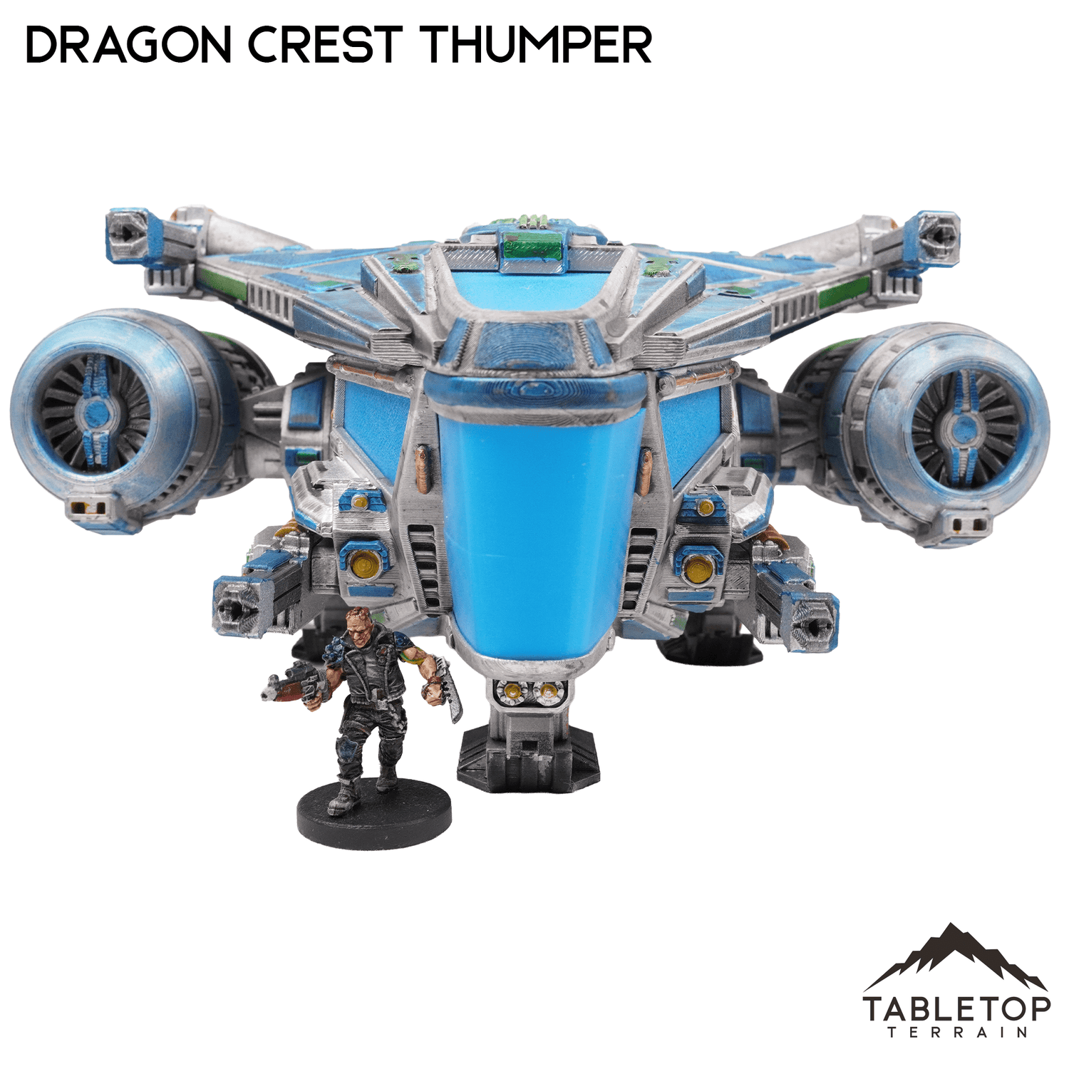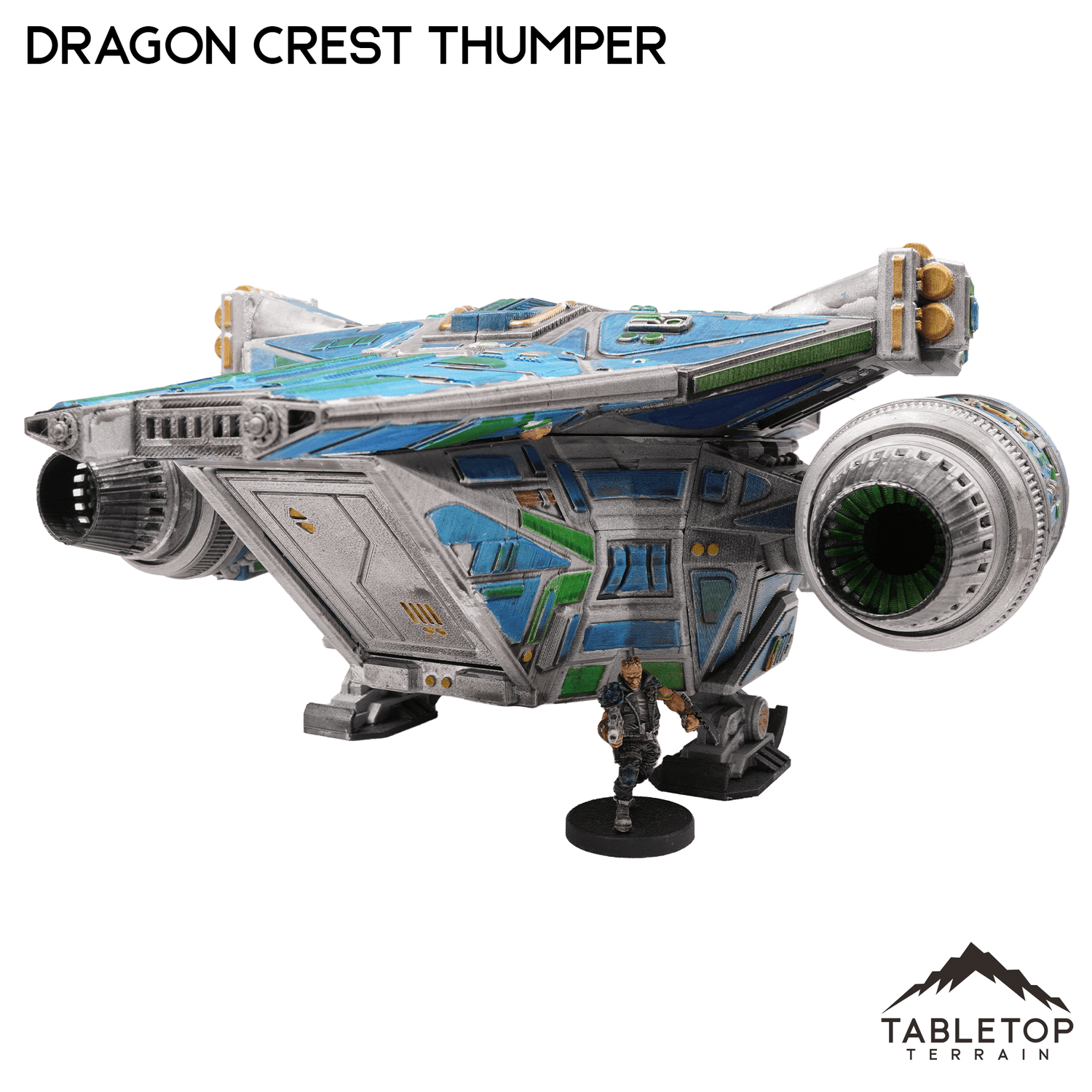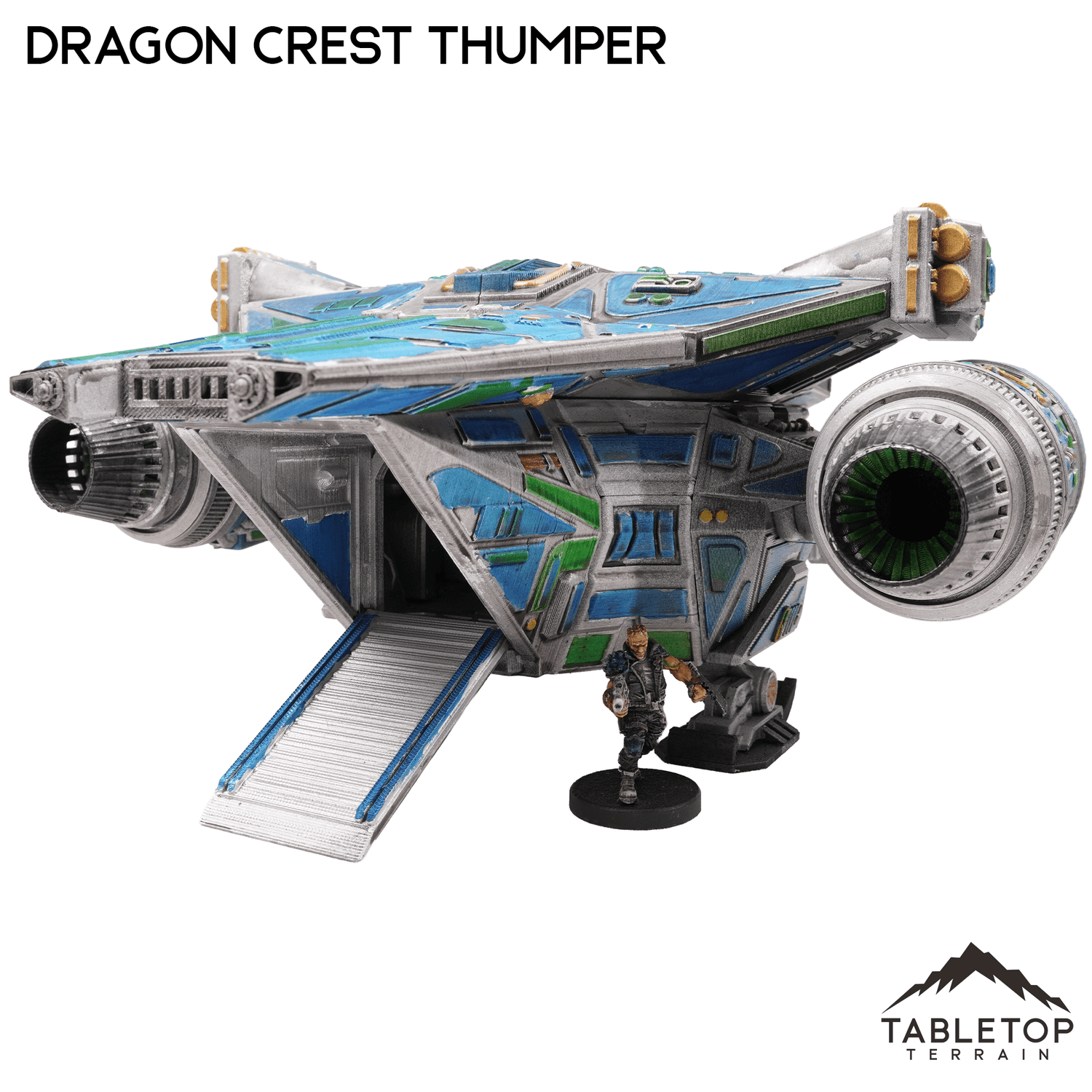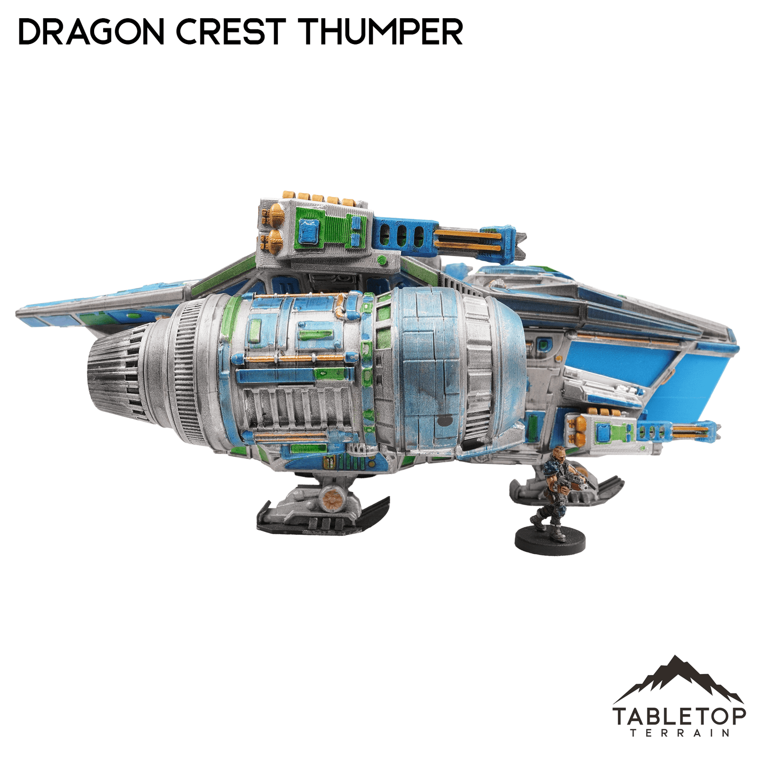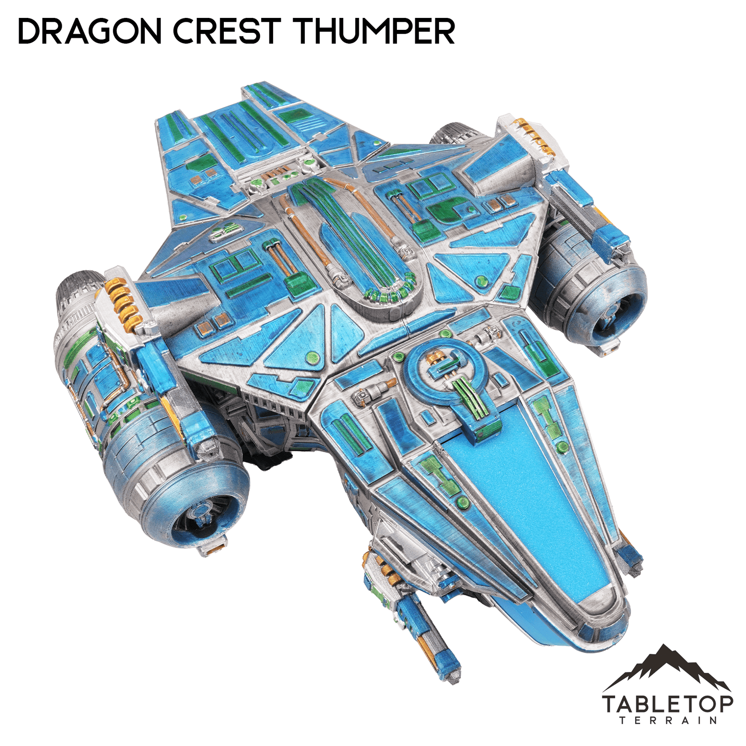 A heavier variant of the famous Dragon Crest ship, the Dragon Crest Thumper is designed with more armor, more guns, and a thicker profile. Swing open the fully functional access ramp or cockpit door leading inside, and you can see the cockpit holds spare seating next to the pilot's chair as well as wall-mounted cargo and a small scanning station. As with the other ships in this collection, the window-frame pieces are printed in a strong orange color to give the cockpit a stylish look.