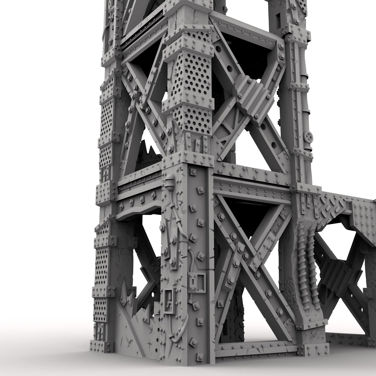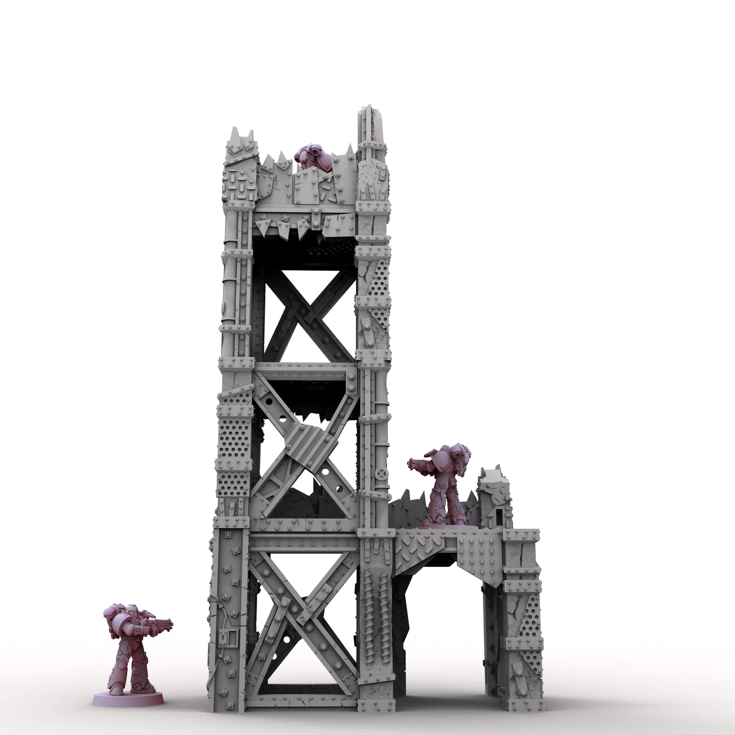 The Watcha Tower rises high on crude metal beams and uneven plating, each level stacked with scrappy orkish bits . Its jagged edges and crooked supports make it look ready to topple at any moment.