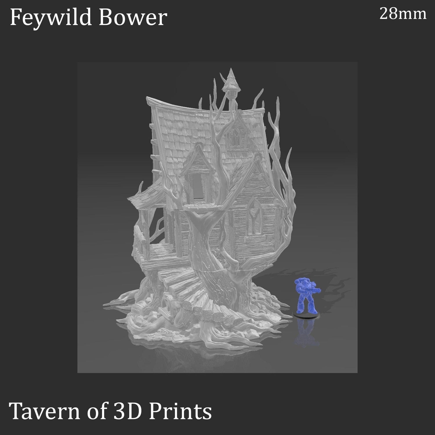 The Feywild Bower is a large, realistic treehouse. It features a removable roof and functional doors which allows it to house other miniatures and be an active part of gameplay. The Bower also pairs well with our Feywild Cabin and Feywild Cottage to create a unique grouping of similar houses. The Bower would be perfect for fantasy games such as Dungeons and Dragons (DND), Age of Sigmar (AoS), Pathfinder, Frostgrave, or Conquest.