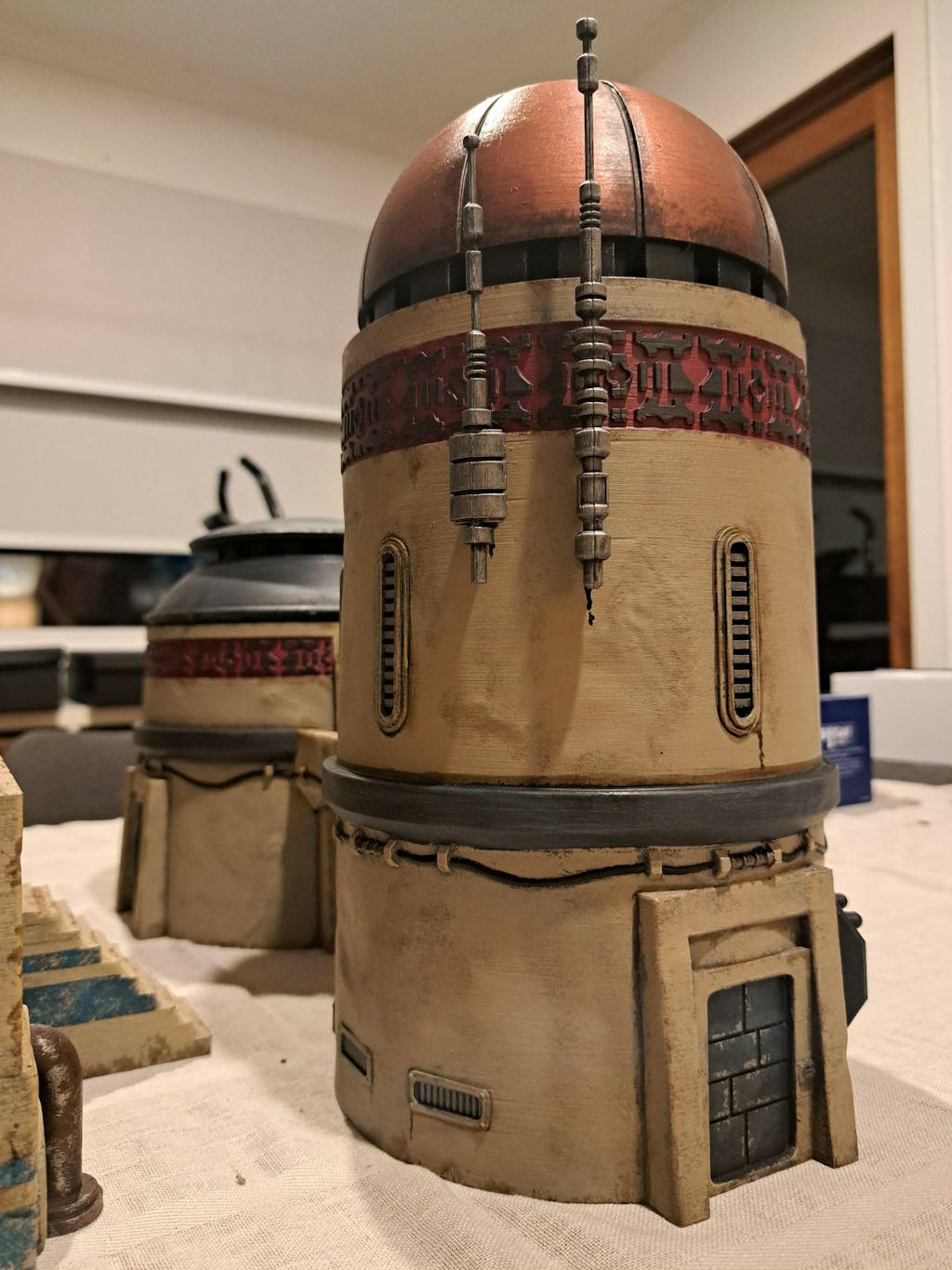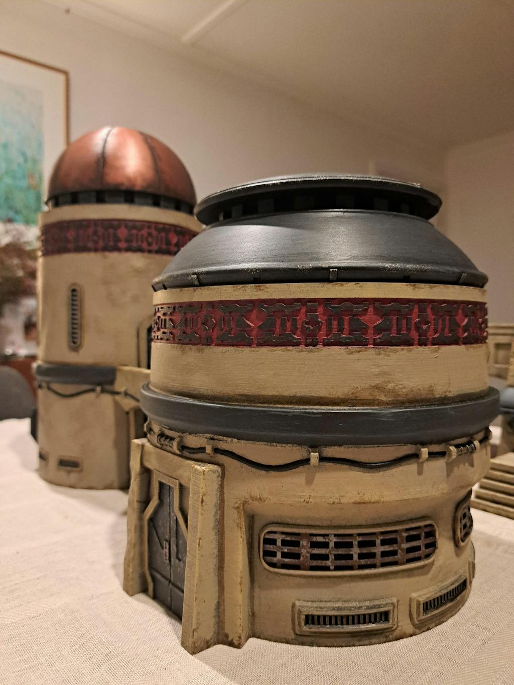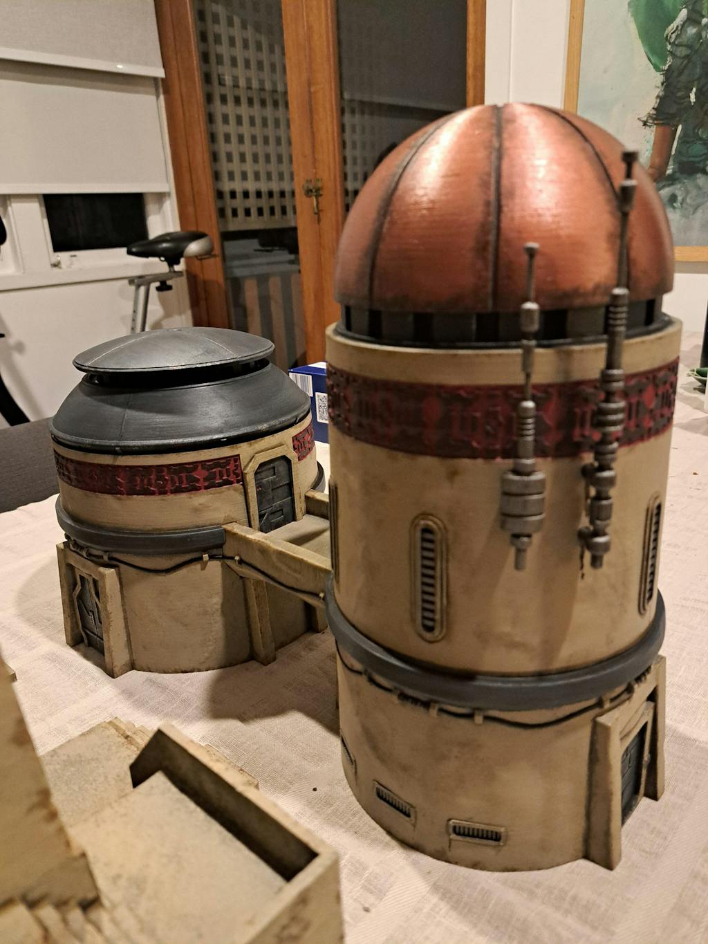 The Paired Bastions set is made of 2 large and sturdy towers, with a bridge connecting them in the middle. The insides of the buildings are hollow, and can be used for storage. The Nomad's Sanctuary sets are all perfect for sci-fi games, cyberpunk tabletops, or desert outposts. Each building is made to be easy to setup and paint.