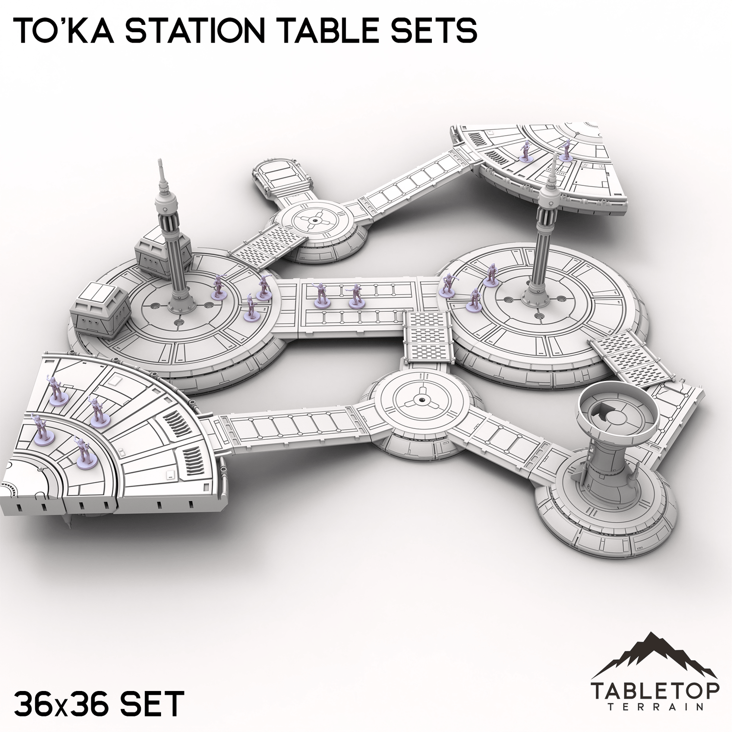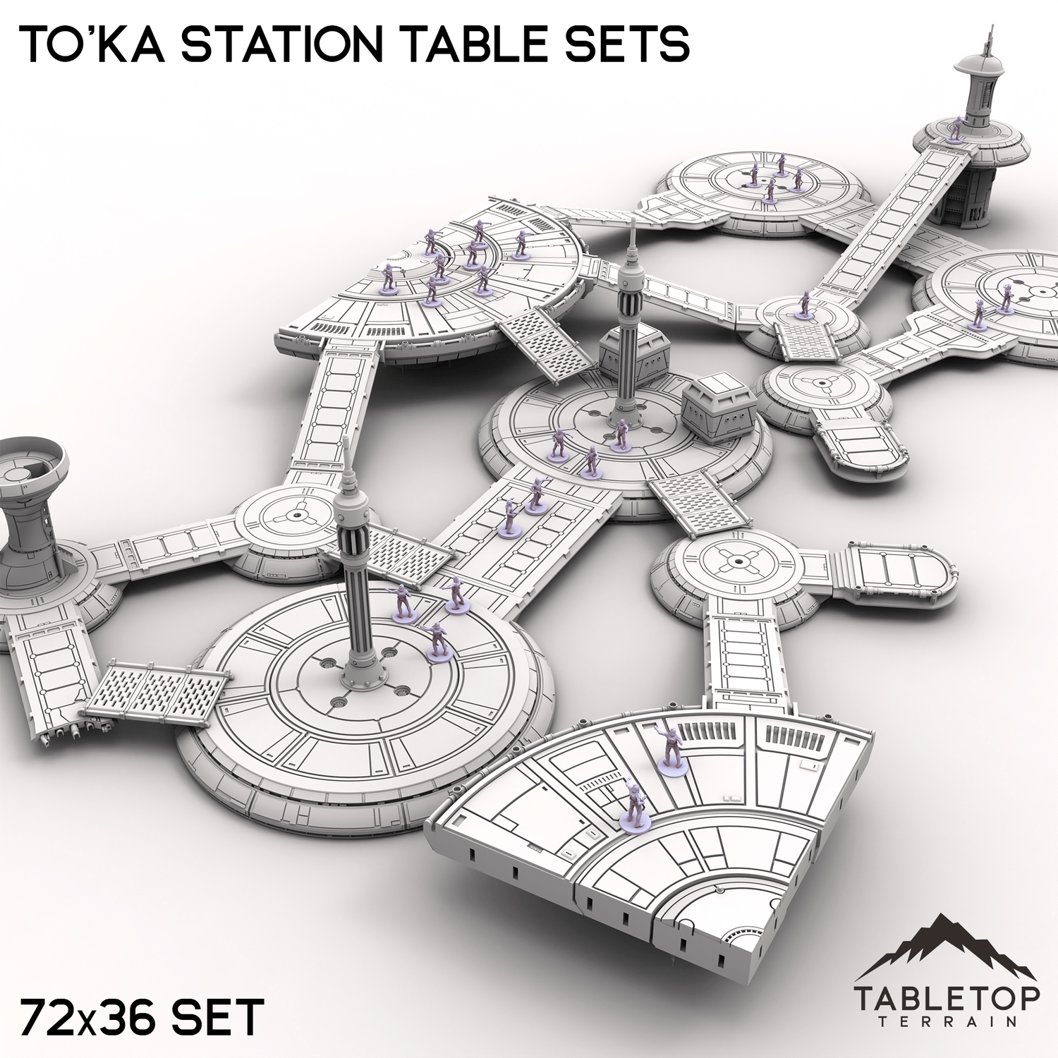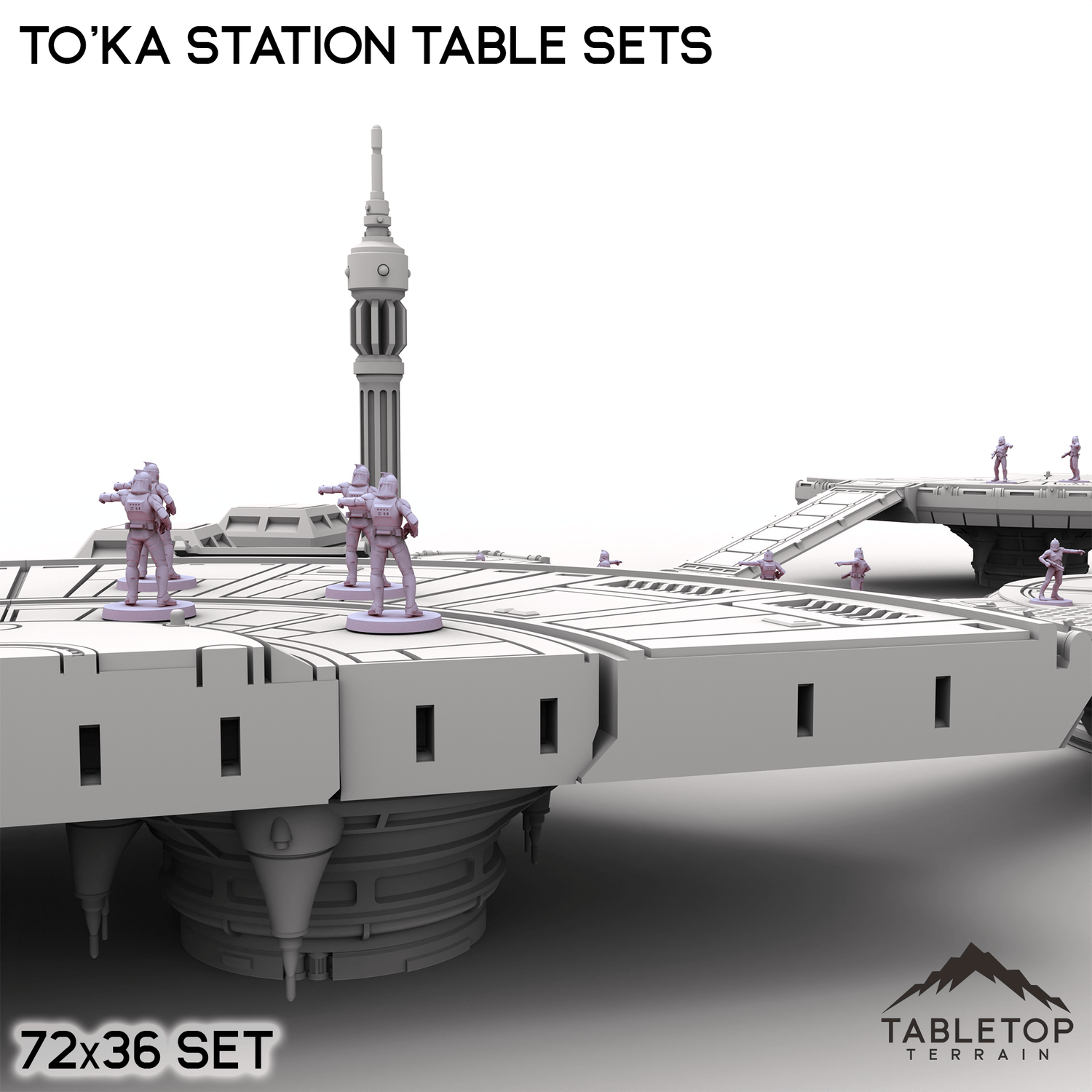 To'ka Station rises above the waters, platforms suspended on columns in the rough seas. These table sets, sold in 2 sizes for different layouts, allow you to command your forces on the cloner's hidden watery planet. Each table set comes with everything you need to build a fully modular layout, one at 36"x36" or one at 76"x36". We also sell a variety of other models and sets in the To'ka style if you'd like more scatter or other additions, but are not required to make a full table set.