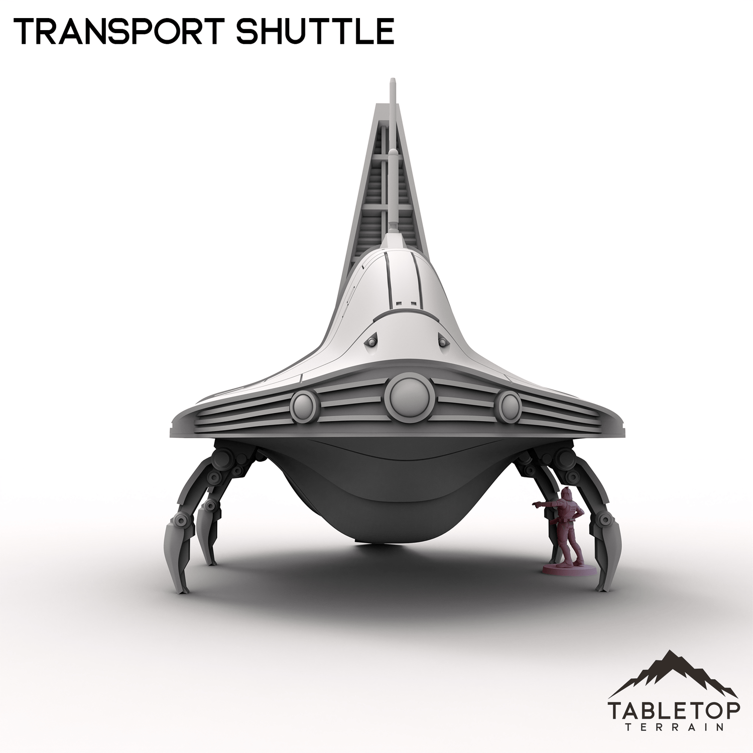 With its sleek design, perfect for cutting through the choppy weather of To'ka Station, this Transport Shuttle is a comfortable and reliable way to the cloner's planet. The Transport Shuttle includes removable legs for displaying the ship in-flight, as well as a detachable boarding ramp for the rear of the vehicle. The Transport Shuttle works nicely as an expansion to the To'ka Full Table Sets, but can be used on its own for a variety of sci-fi games and tabletops.